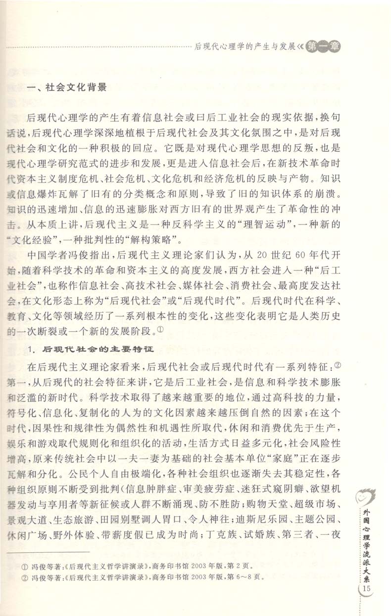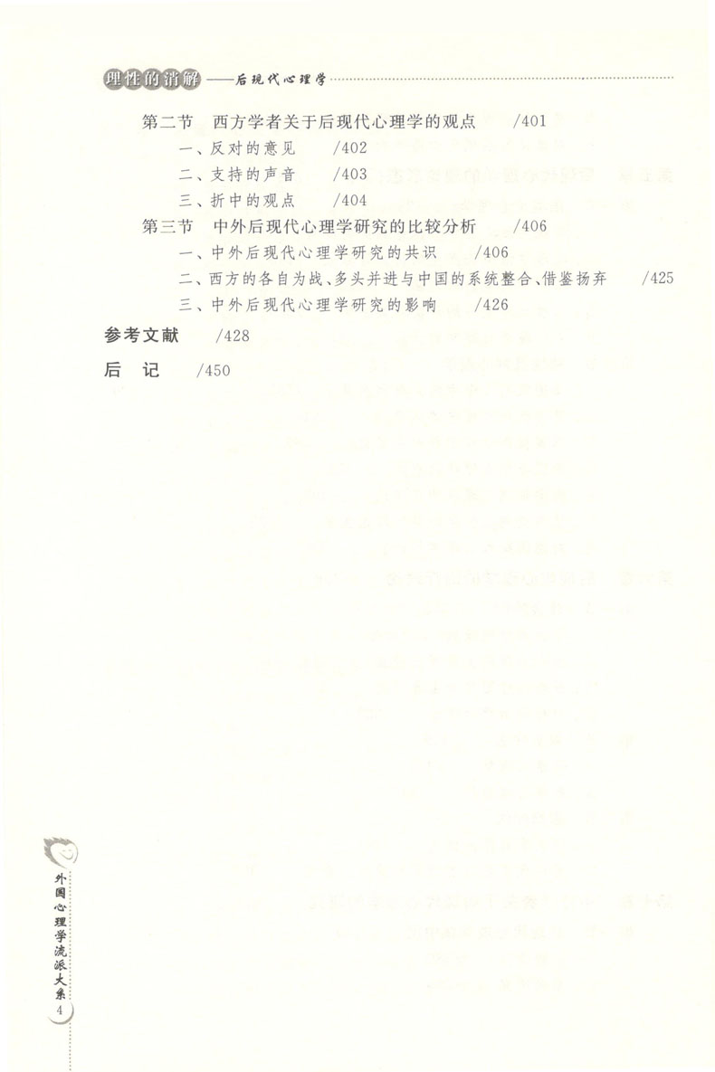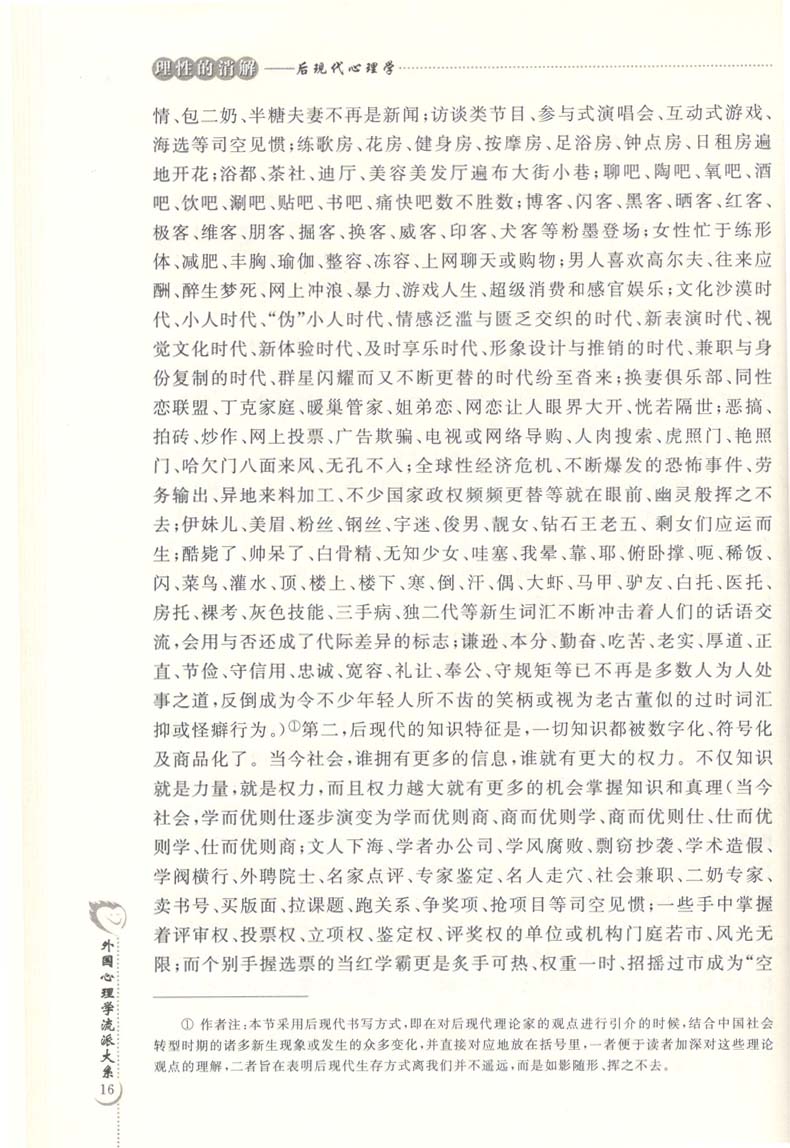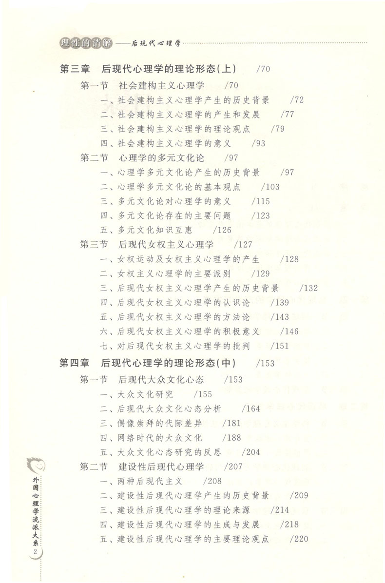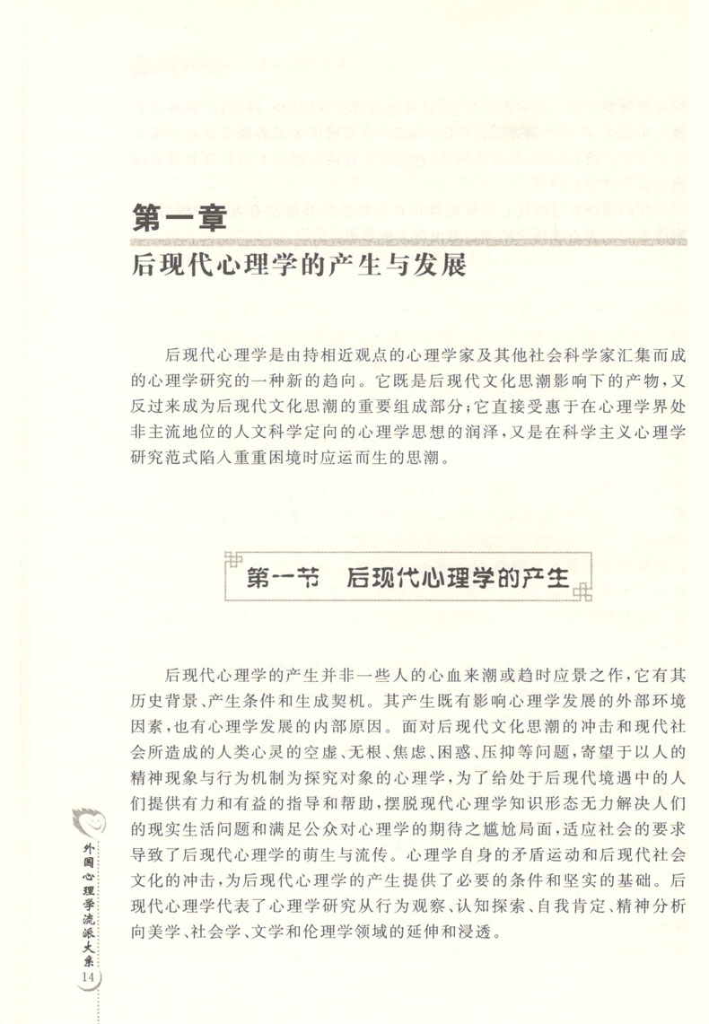 世纪更替之际,处于困境和危机中的科学主义心理学或日主流心理学。正面临和酝酿着一场年一遇的深刻大变革,即从“现代心理学”转向“后现代心理学”(postmodern psychology),从自然科学取向转向心理学的多元化。致力于后现代心理学研究和传播的心理学工作者对主流心理学中流行的现代主义、科学主义、男子中心主义、个体主义、欧美中心主义、机械决定论、还原论、客观化等倾向予以反思和批判,提出并形成了许多具有建设性意蕴的新观点和新思想,可谓另辟蹊径、发人深省。高峰强等专著的《理性的消解--后现代心理学》便是研究后现代心理学的书籍,一起来阅读吧!