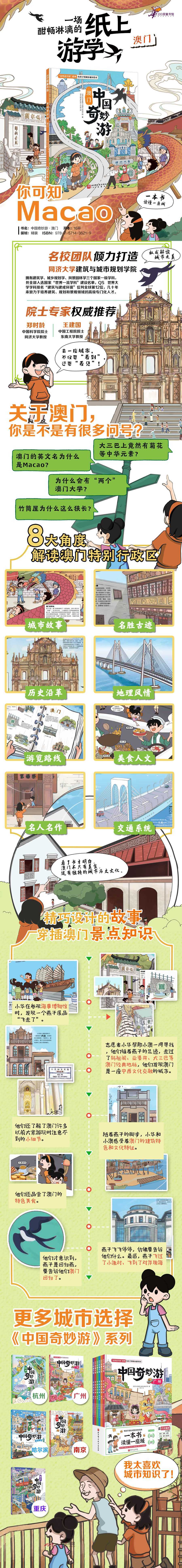 买套装,首印即赠涂色卡! 名校团队倾力打造,两院院士推荐,带孩子了解澳门的前世今生。 一次酣畅淋漓的纸上游学,让孩子了解澳门背景文化,带着;心眼去旅行,能收获更多。 澳门英文名为什么是Macao?大三巴上竟然有中华元素?为什么有;两个澳门大学?竹筒屋为什么这么狭长? 8大角度解读澳门:城市故事、名胜古迹、历史沿革、地理风情、美食人文、游览路线、名人名作、交通系统。 精巧设计的趣味故事,穿插融合城市景点知识,孩子能边走边学知识。