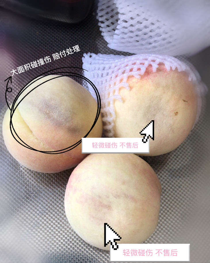 2、湖景成熟较快,运输途中难免会磕碰,如果发现桃子产生甜斑,并非不新鲜或变质,只是水蜜桃磕碰后果皮和果肉会变色,不影响食用,不做赔付处理,请见谅。