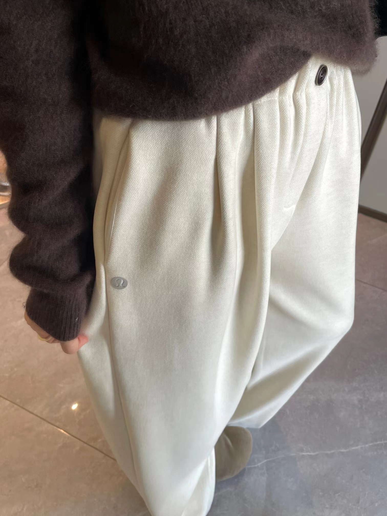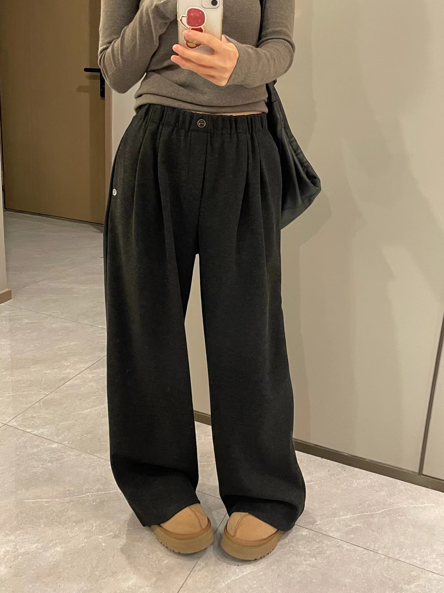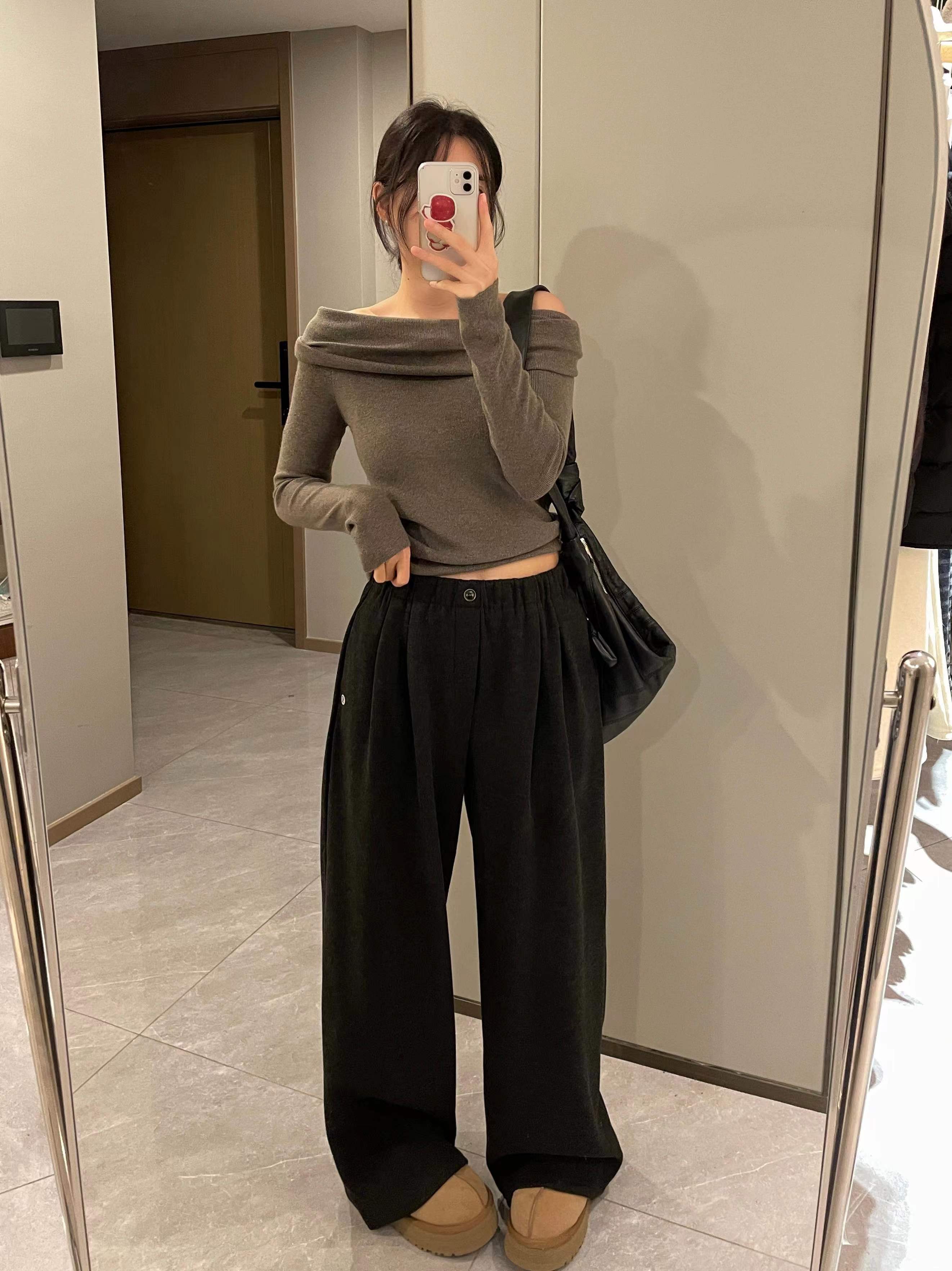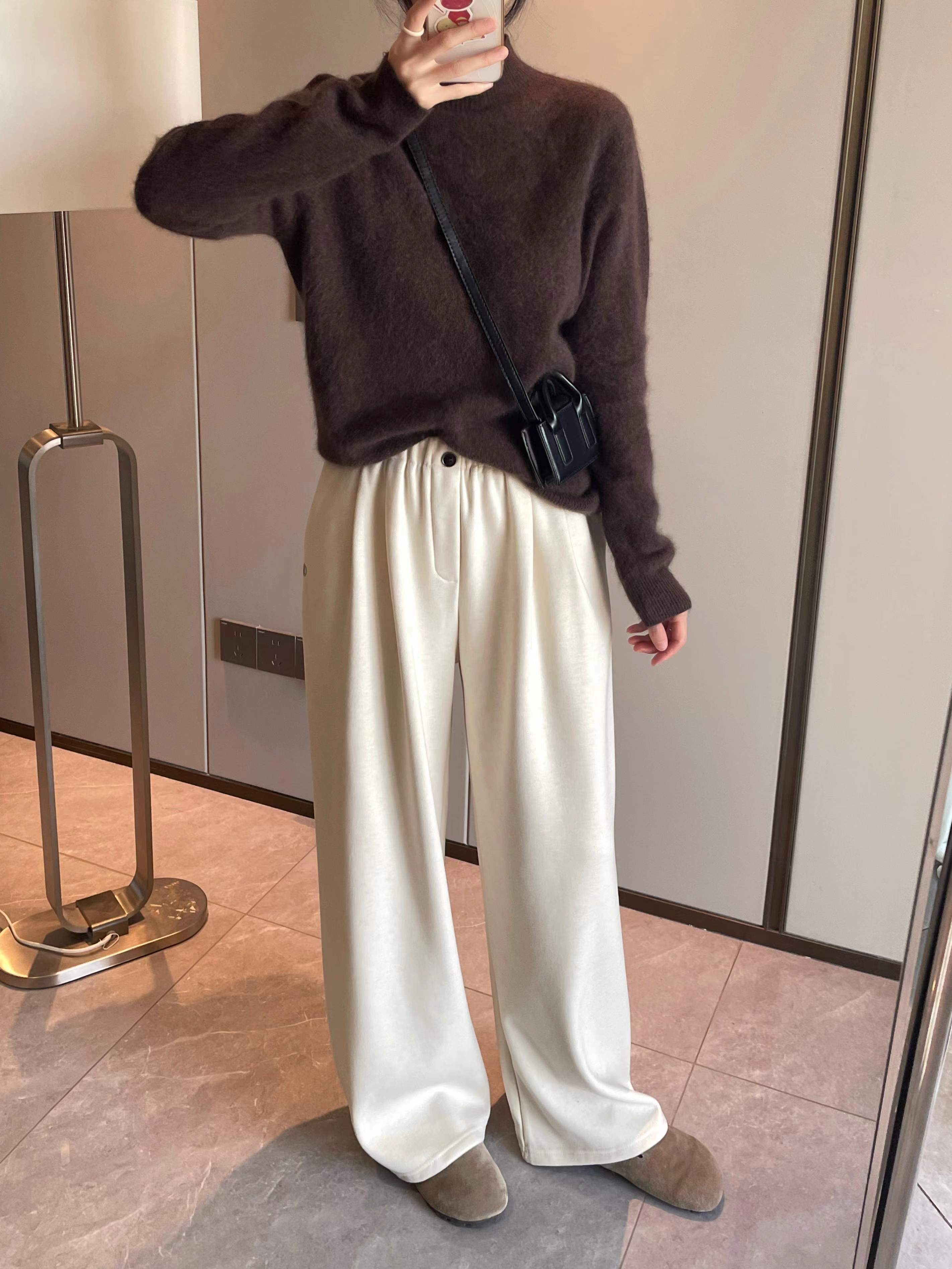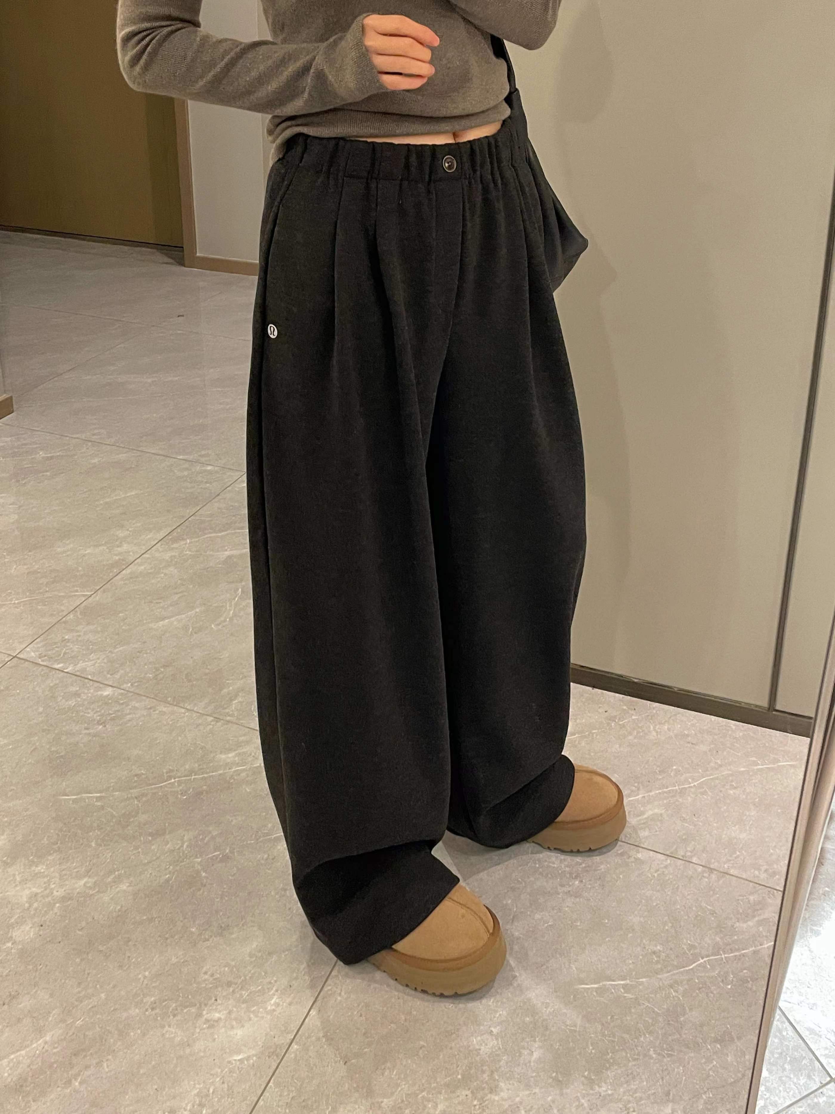 一粒扣松紧腰宽松阔腿裤,走的是简约慵懒的风格,整体看起来很有松弛感。版型是高腰松紧腰设计,还带了一颗小纽扣作为装饰,既有调节舒适度的实用性,又添了一点细节感。裤型是垂坠感很好的阔腿裤,裤管非常宽大,从腰到裤脚都保持着自然的宽松度,能很好地修饰腿型,走路的时候会有自然的垂坠动态。 面料看起来是偏挺括又柔软的混纺材质,不是那种软塌塌的布料,既有一定的版型支撑,又保留了亲肤的触感,适合日常通勤或休闲穿。 细节上有侧边小标装饰,和之前那条条纹裤是同一系列的风格,整体简约又有质感,搭配修身的灰色上衣很显利落。