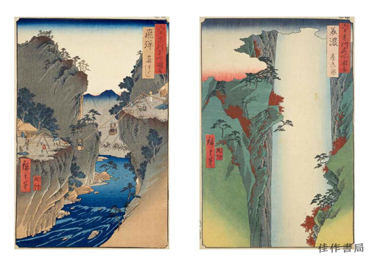 歌川广重作为浮世绘传统的最后一位伟大大师,创作出色彩细腻而浓烈的作品。这套于 19 世纪 50 年代首次出版的版画集,收录了日本各藩的风貌。该系列创作于歌川广重创作力旺盛的晚期,是一项雄心勃勃的项目,捕捉到了日本历史上的一个关键时刻,即明治维新开启工业化与西方影响大门的十年前。其最显著的特点之一是竖式构图,这使歌川广重能够尝试不同的视角。他笔下美丽乡村的壮阔全景,将距离的错觉与细节的深度相结合,吸引着观者。除了这些壮丽的风景,歌川广重对繁华城市中心的描绘,也为我们提供了难得的江户时代日常生活视角。