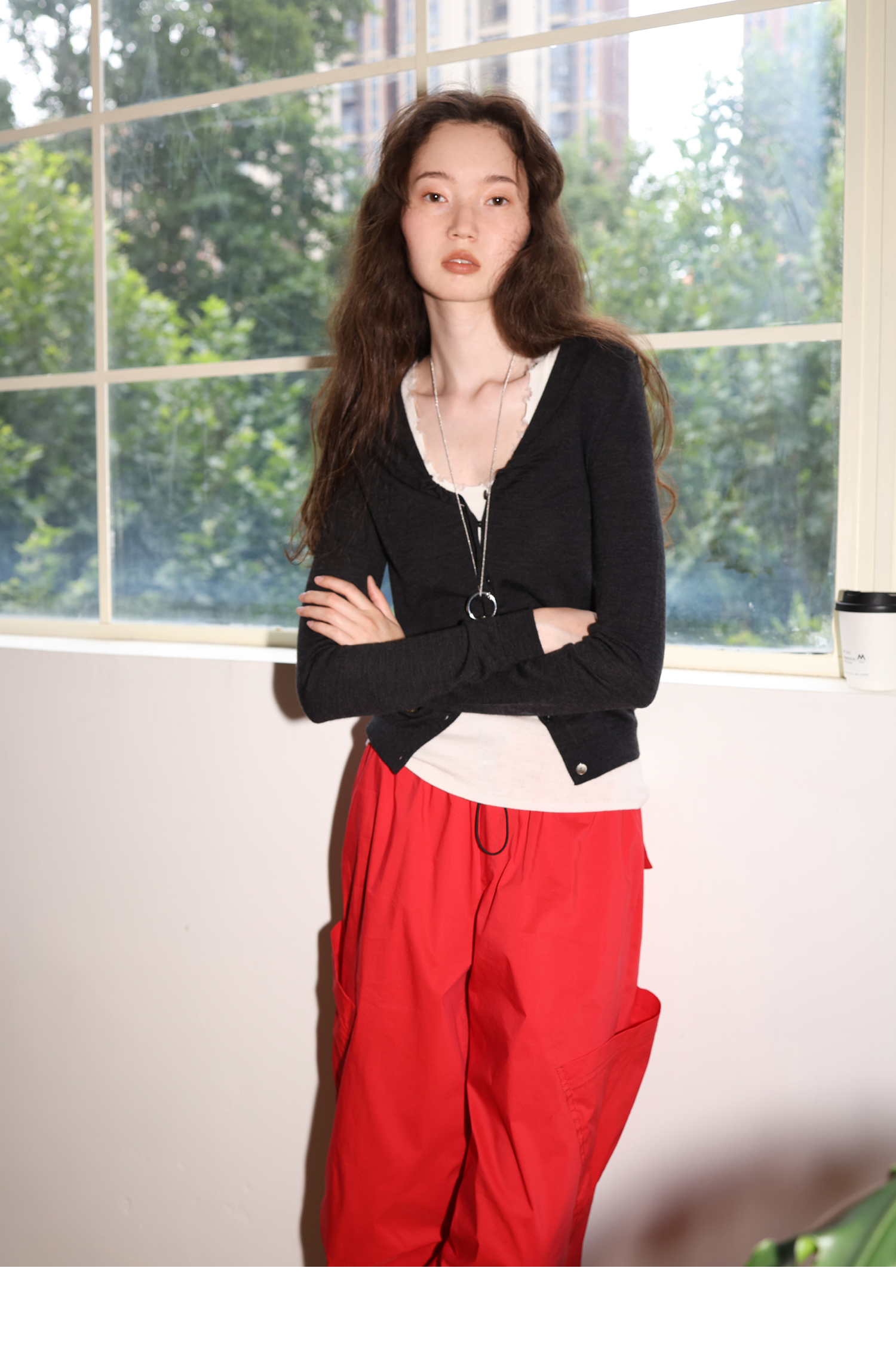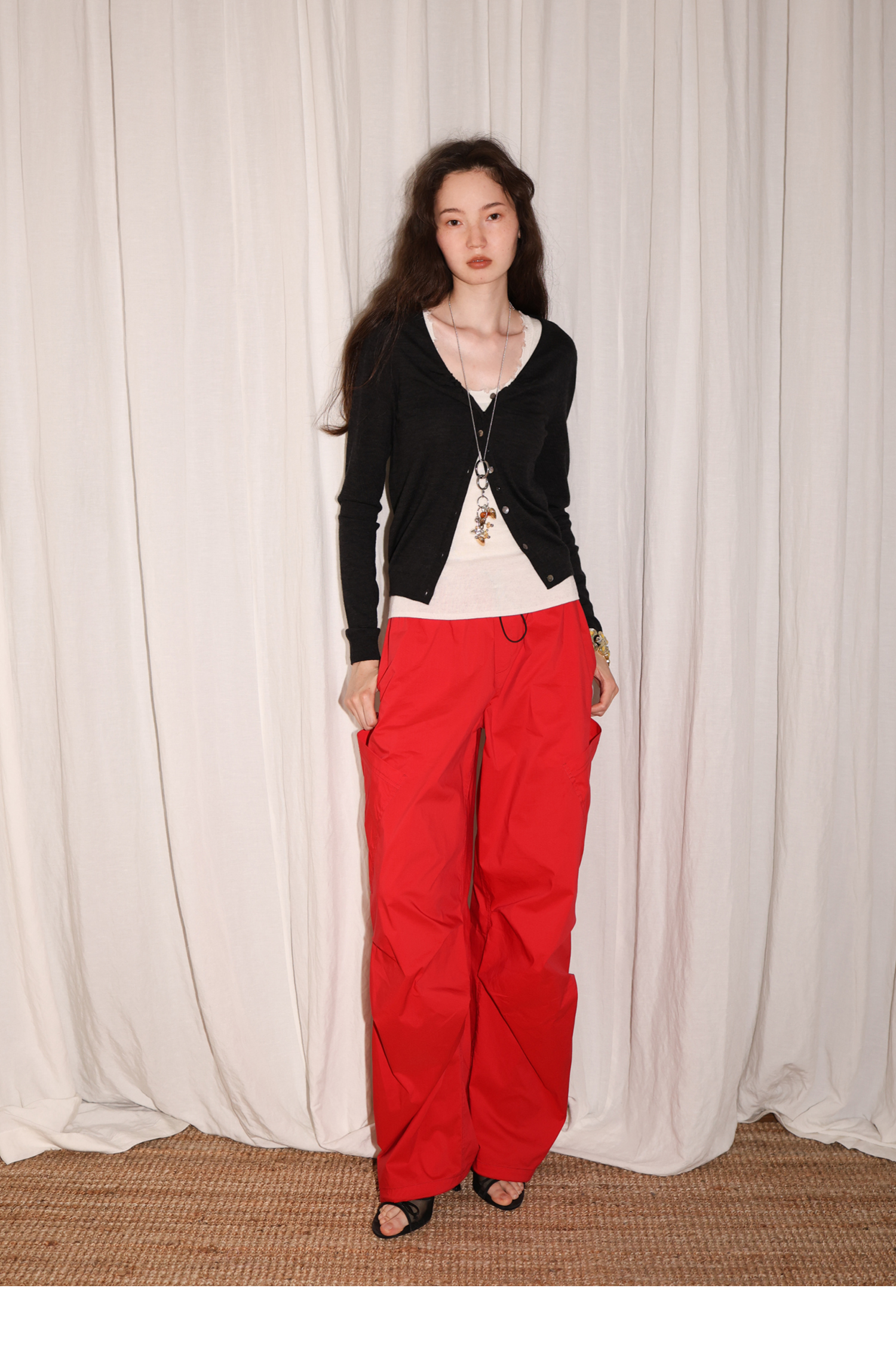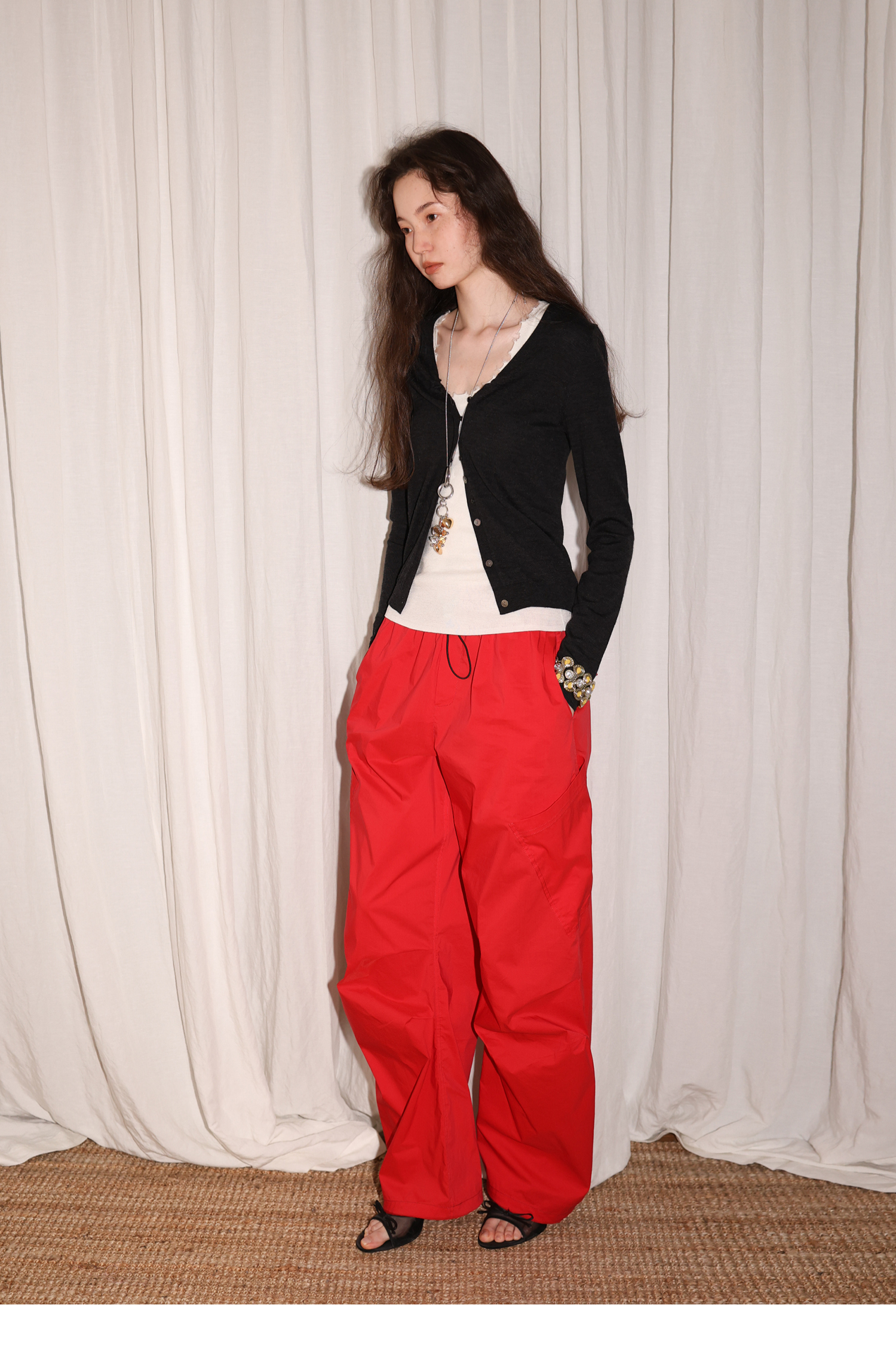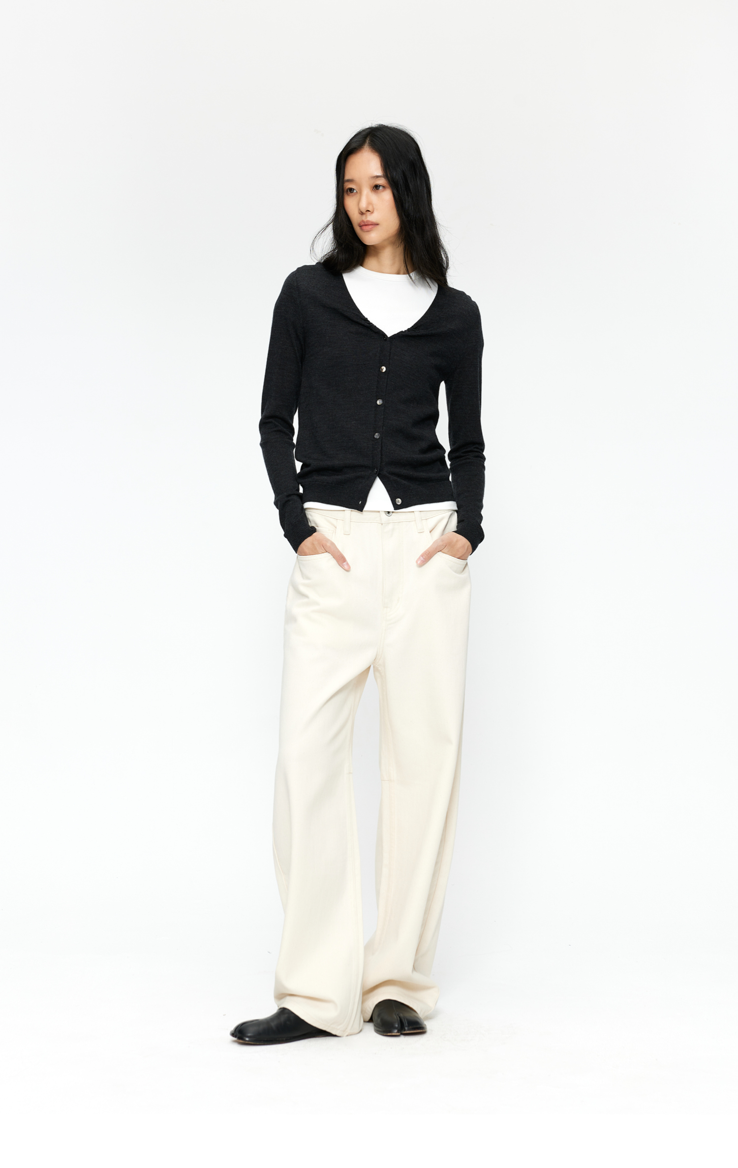 素舶 100澳洲极细美丽诺羊毛四季可穿V领领口抽皱修身针织开衫