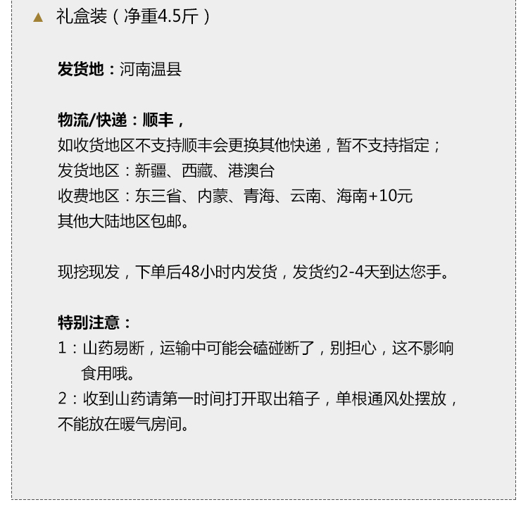 收到山药请第一时间打开取出箱子,单根通风处摆放,不能放在暖气房间。