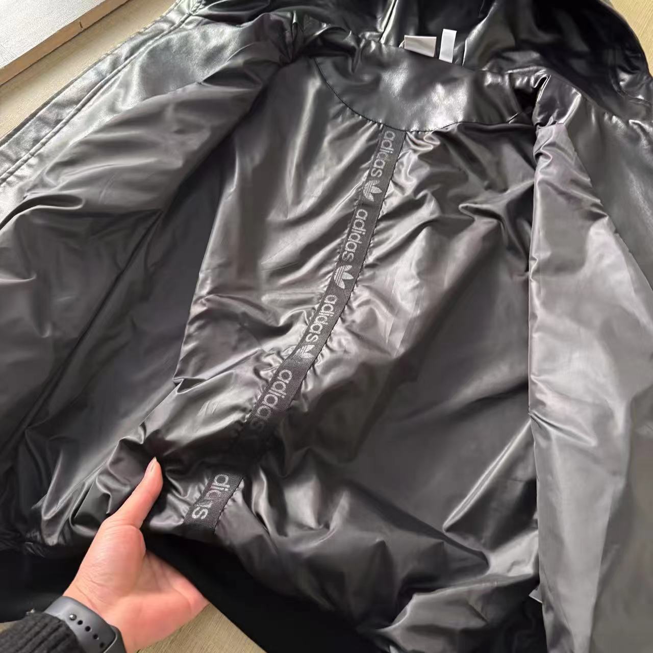 PU皮刺绣logo时尚复古皮衣运动夹克连帽外套夹克 男女同款 腋下双拉链 整件衣服全皮工艺 订制进口仿绵羊皮材质 手感柔软细腻 高档感在线 原装双拉链 胸口三叶草万针刺绣标志 帽子可以脱卸