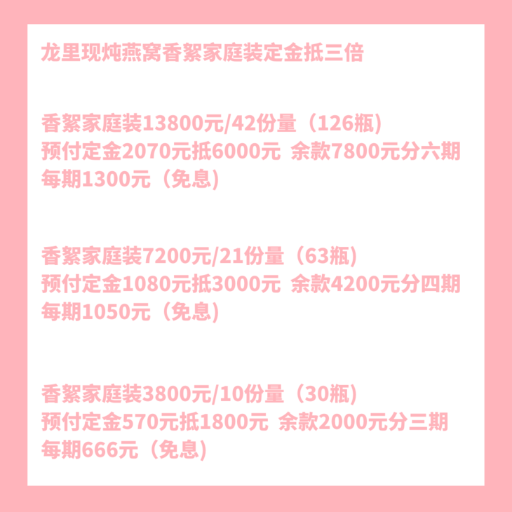 ▐►定金抵三倍 尾款免息分期◄▐家庭装燕窝:香絮(10份量/21份量/42份量)(单份量:75ml*3瓶)