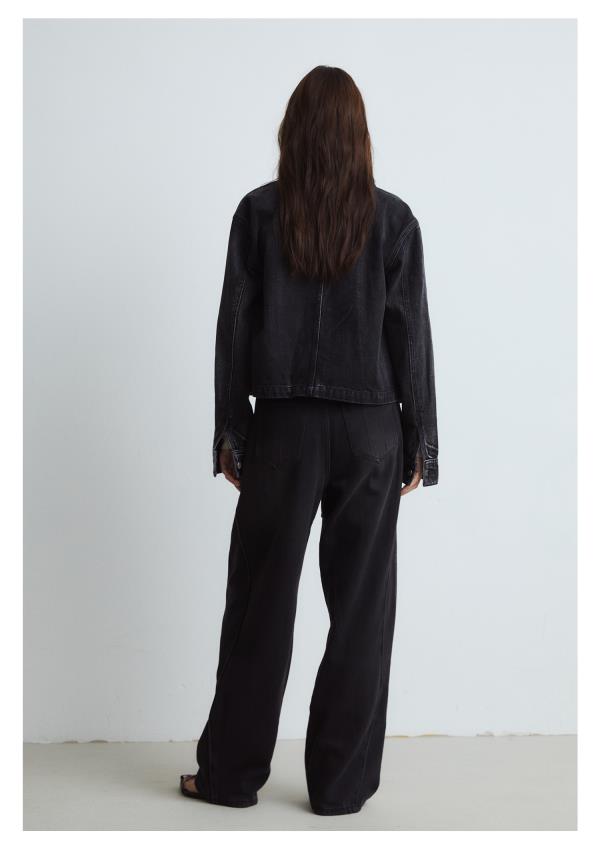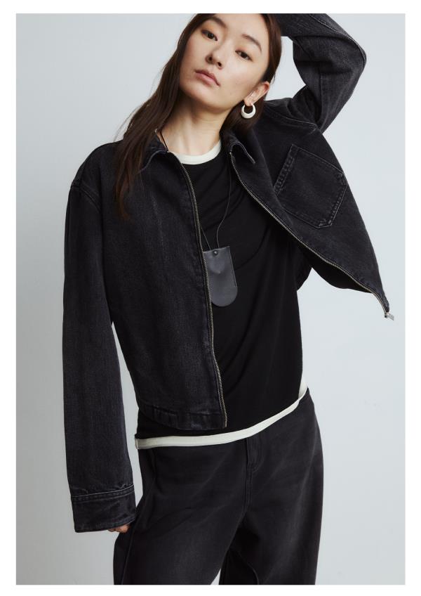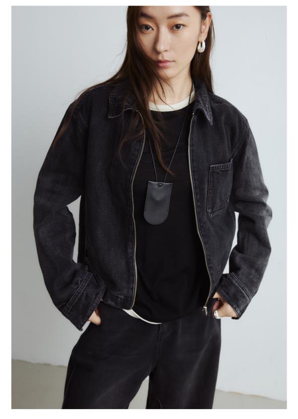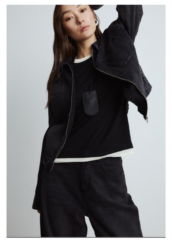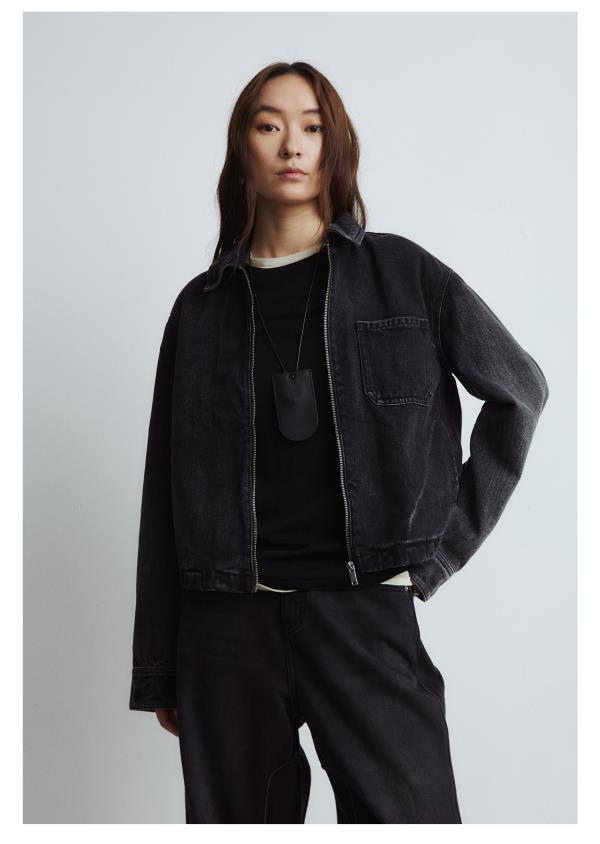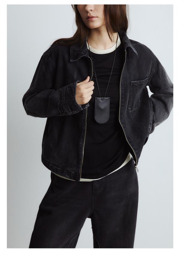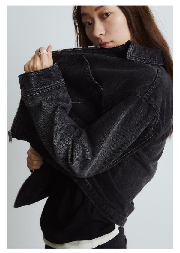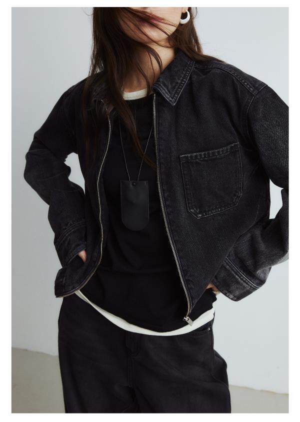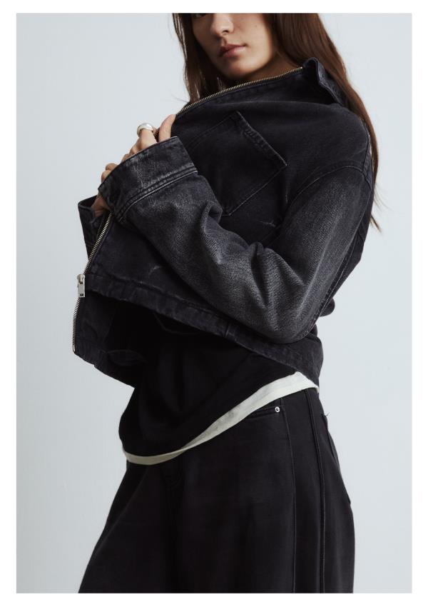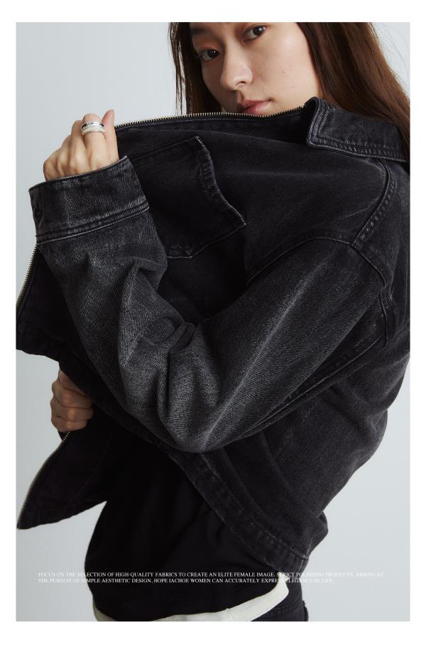 棉仓3561507002-IACHOE春季美式黑色小众短款牛仔外套复古翻领