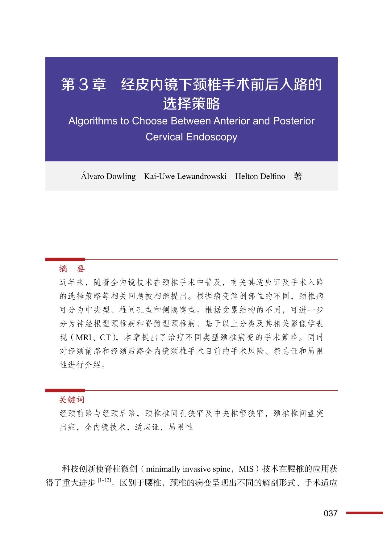 本书引进自 Bentham Books 出版社,是一部用于学习和提高脊柱微创外科手术技术水平的实用教科书。全书共 16 章,回顾了颈椎内镜的过去、现在和未来,合适的麻醉方案,颈椎内镜手术入路的选择、适应证和临床结果,同时概述了复杂的脊髓型颈椎病内镜减压术、椎弓根切除术、椎体切除术和椎间融合术等更先进的内镜复杂手术技术,还讨论了内镜辅助微创椎板成形术治疗脊髓型颈椎病和颈椎结核病灶清创与置管化疗病例的系列报道,以及颈椎内镜手术的后遗症、治疗失败、并发症及其处理等内容。本书简明扼要,条理清晰,汇集了目前颈椎内镜手术相关领域的新近研究成果,可以很好地满足国内脊柱微创外科医生学习和进阶的需要。