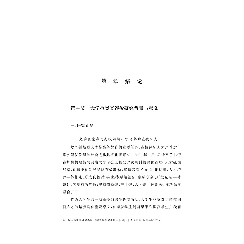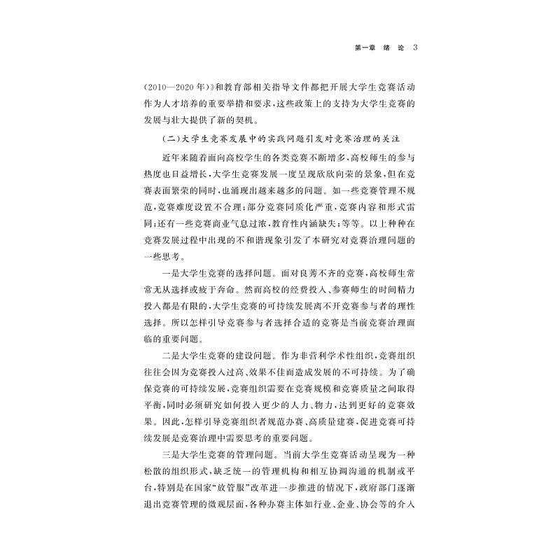 本书为浙江省社科后期资助项目,也是作者的博士学位论文。面对当前高校大学生竞赛快速发展的现实背景,为解决竞赛利益相关者面临的竞赛选择、竞赛建设与竞赛管理等实际问题,本书以组织效能为研究视角,以第四代评价理论与利益相关者理论为指导,通过对竞赛组织形态、管理模式和运行机制等的深入分析,选择从构建竞赛“三维质量”评价模型的研究角度,建立竞赛质量评价体系,开展高校大学生竞赛质量评价研究,回应了竞赛各利益相关方关切的竞赛治理与高质量发展问题,促进了新时代大学生竞赛高质量可持续发展。