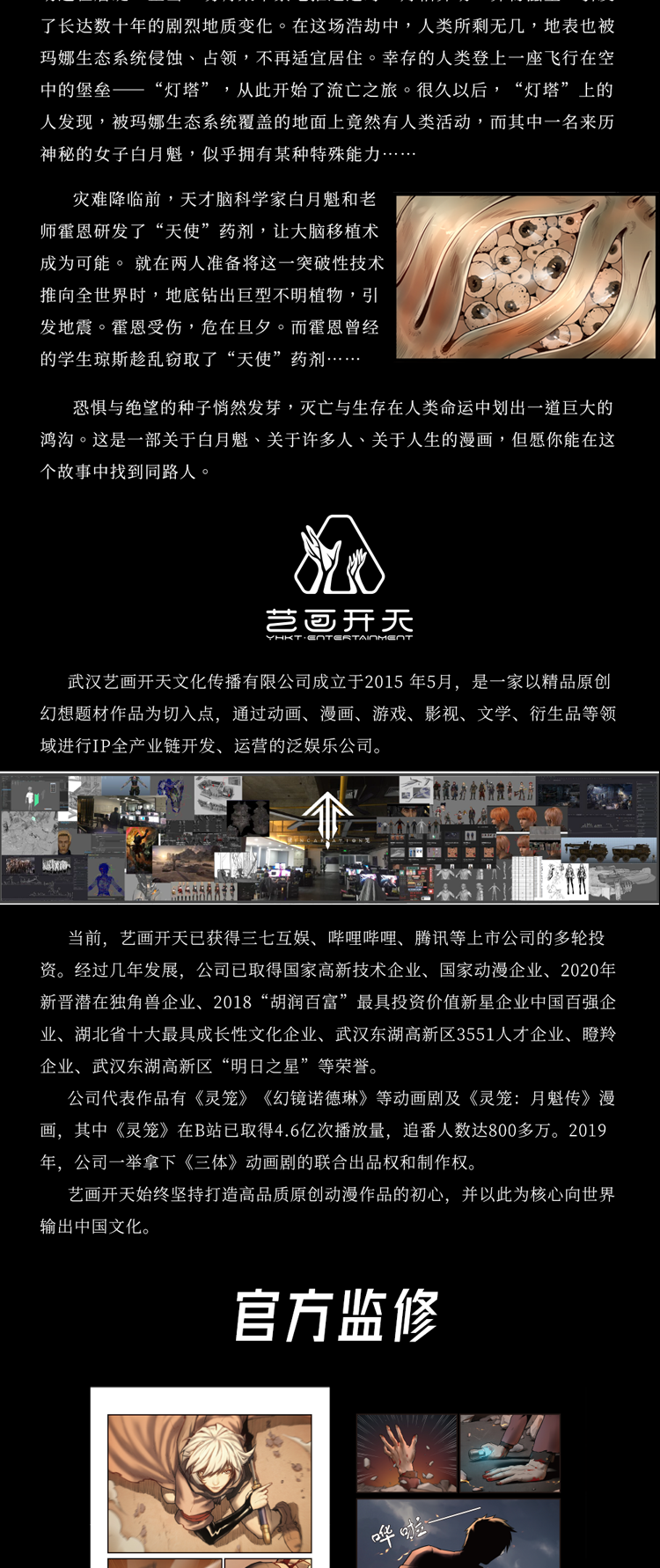 武汉艺画开天文化传播有限公司成立于2015 年5月,是一家以精品原创幻想题材作品为切入点,通过动画、漫画、游戏、影视、文学、衍生品等领域进行IP全产业链开发、运营的泛娱乐公司。
