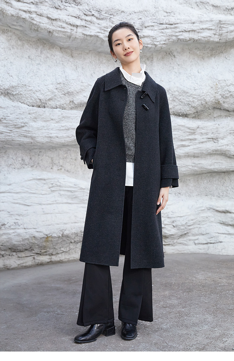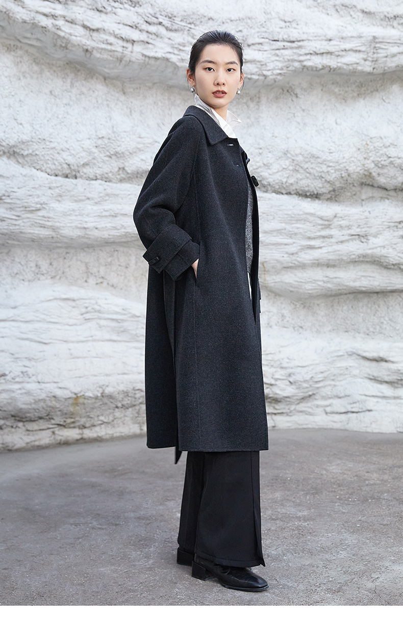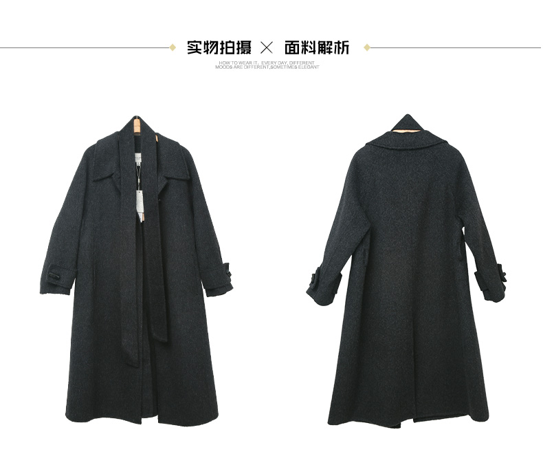 深灰色复古风系带双面羊绒大衣 长款过膝宽松显瘦羊毛呢外套 秋冬高级感气质女装