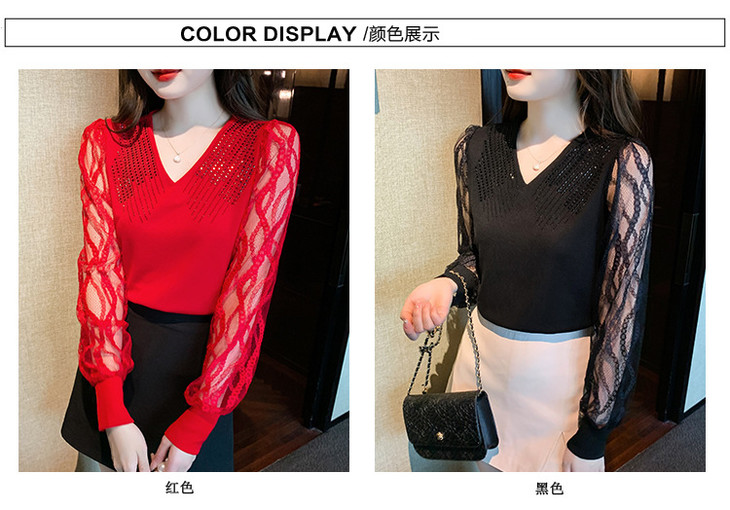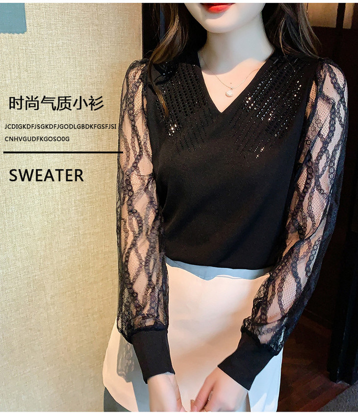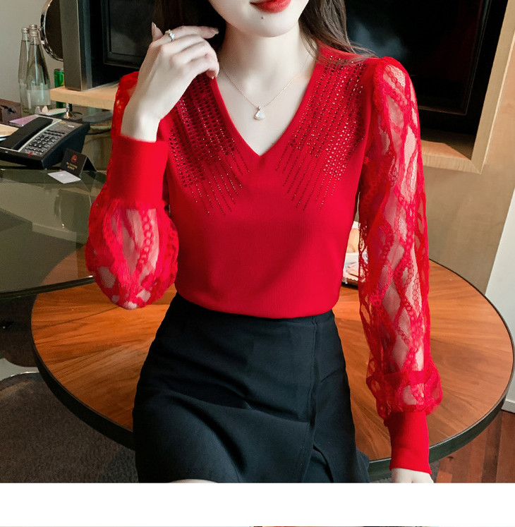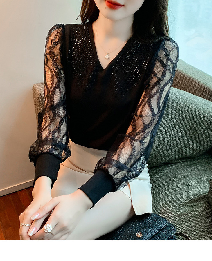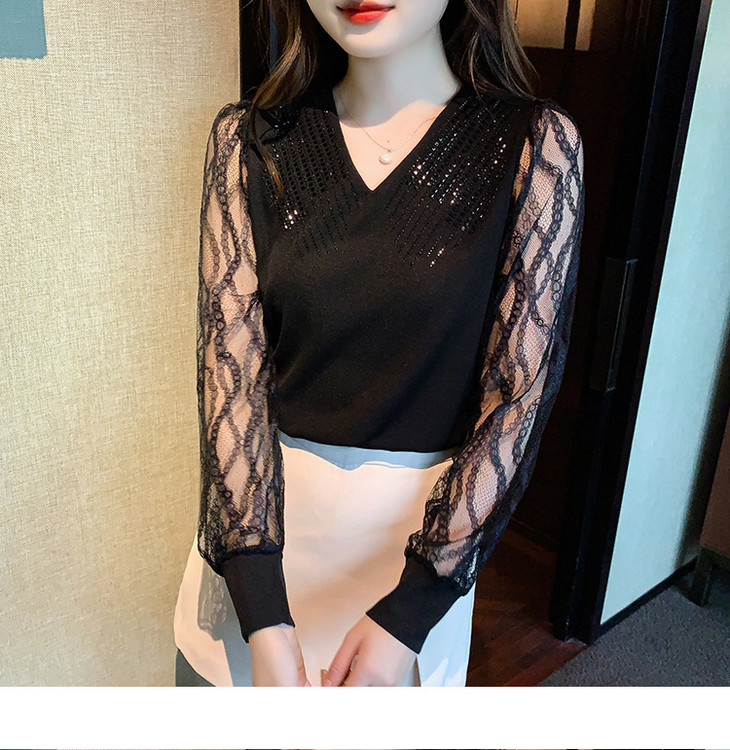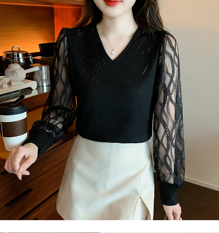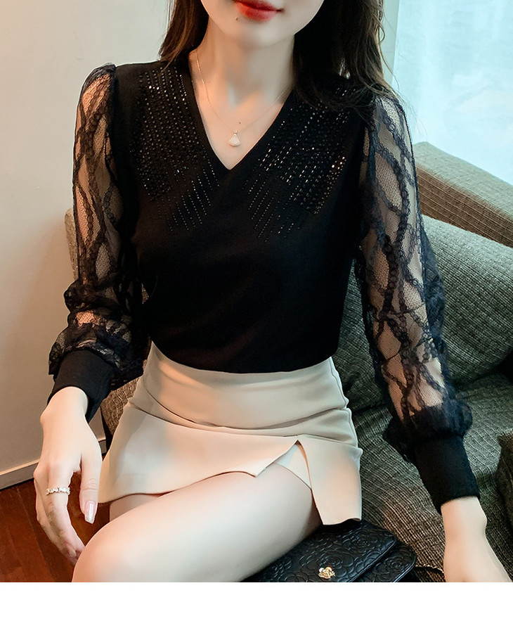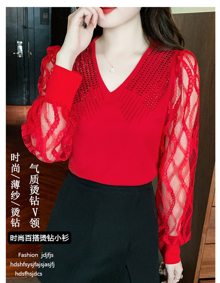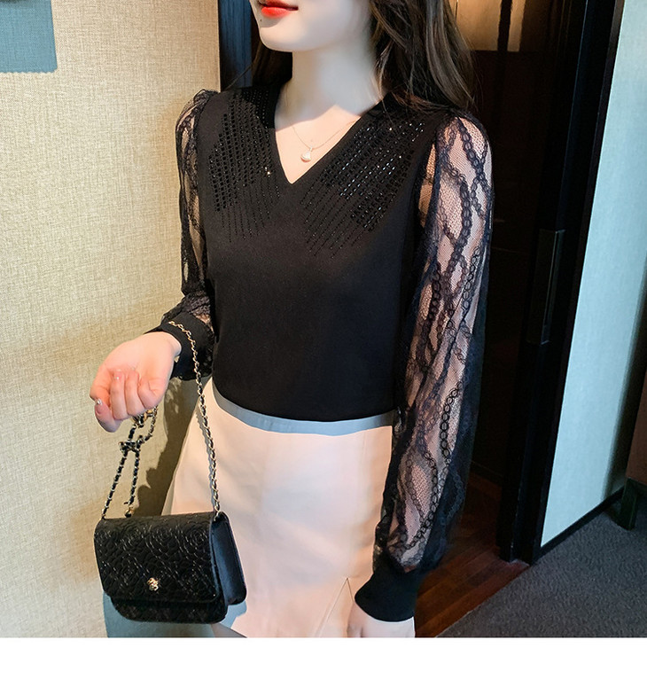 2022秋装新款泡泡袖蕾丝拼接设计感V领镶钻打底衫 TYL1893