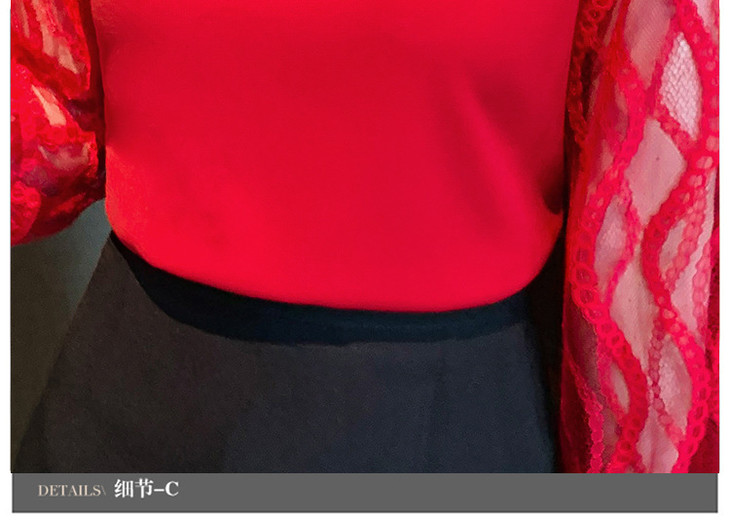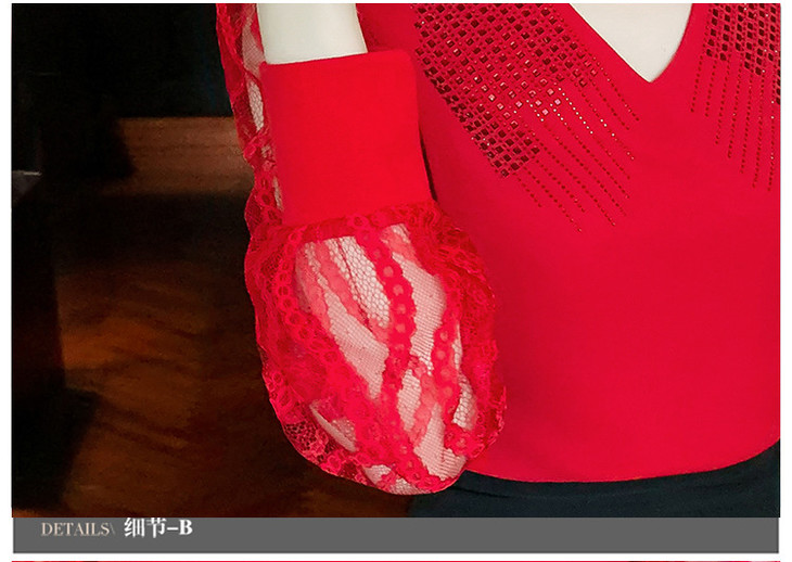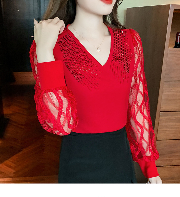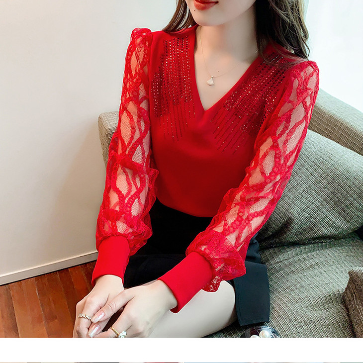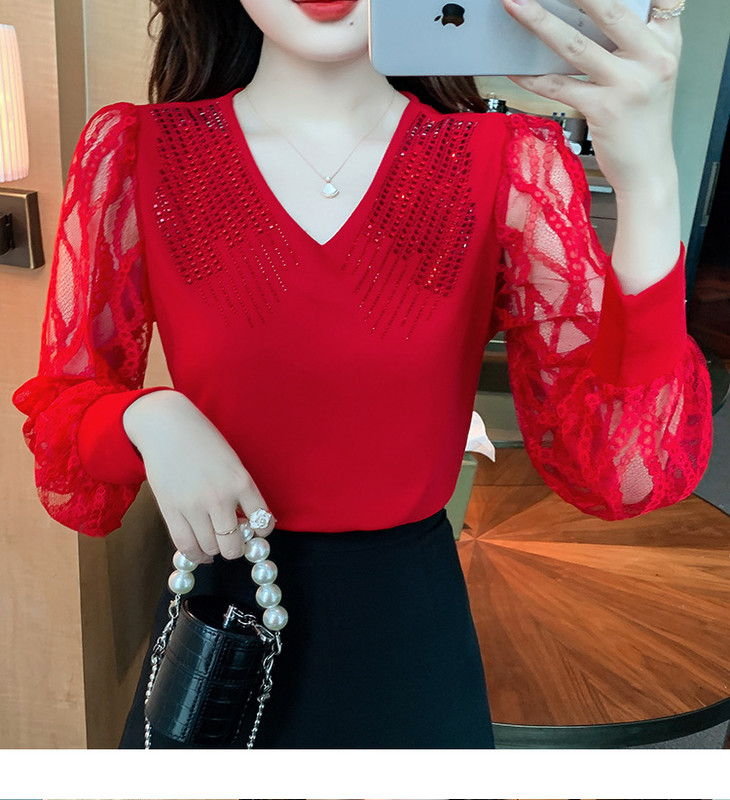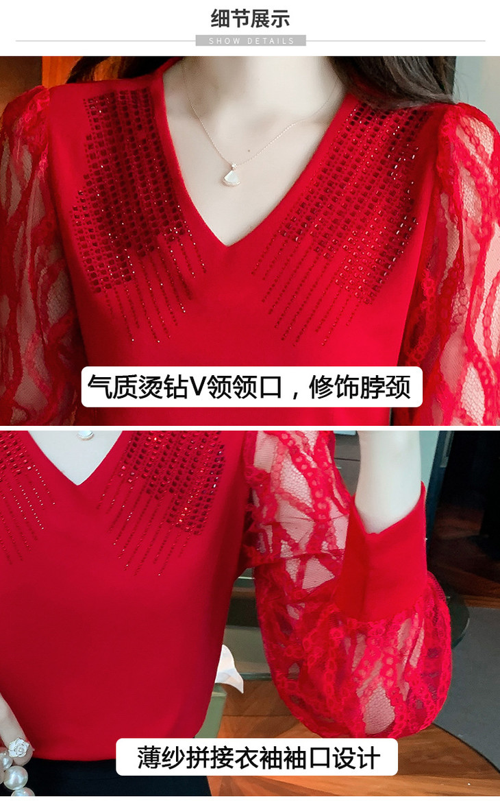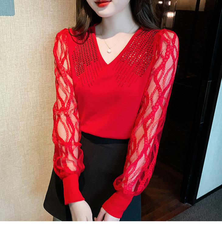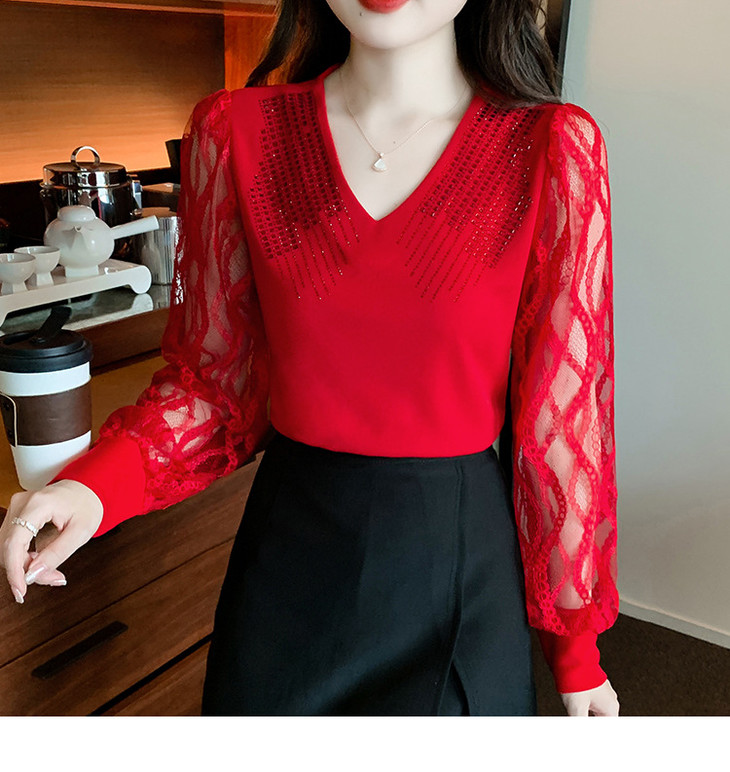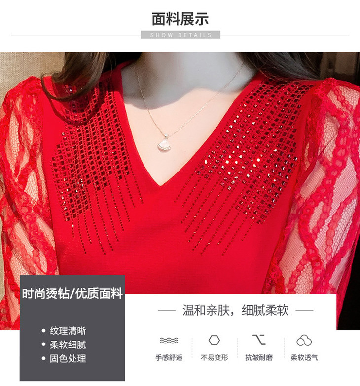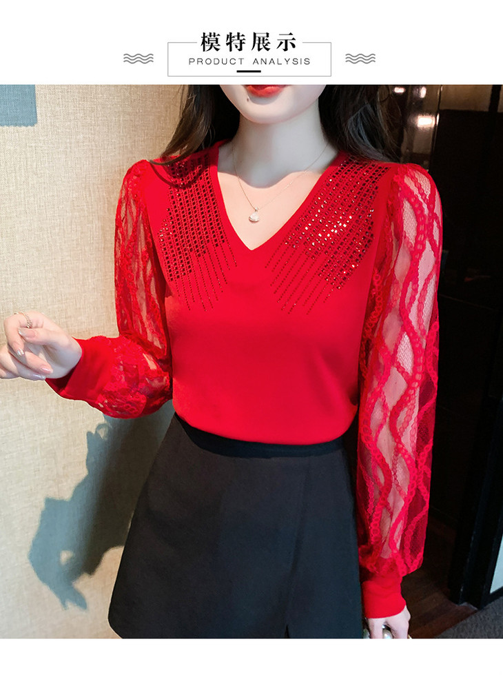 2022秋装新款泡泡袖蕾丝拼接设计感V领镶钻打底衫 TYL1893
