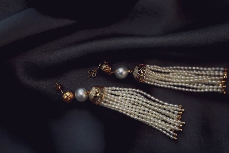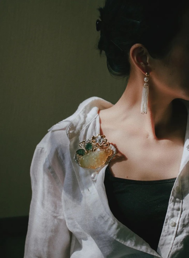 秋冬季节,有体量感的长耳环,和大型胸针,是衣着和容貌的最点睛之笔。我用了复古绳结作耳钉,akoya珍珠做主石,黄金镂空勾花,满镶钻石的花托下,满满坠着随形的珍珠米珠。流苏经过这一轮的调整,光泽极好,垂感和流畅度都更为一流,佩戴感觉摇曳又饱满大气。夏天里,你想要突破一贯自己佩戴小而精致的珠宝风格,走一下略“吸睛”的路线,却又不想过分夺目叛逆,重量:14.5g