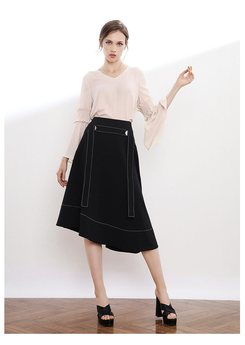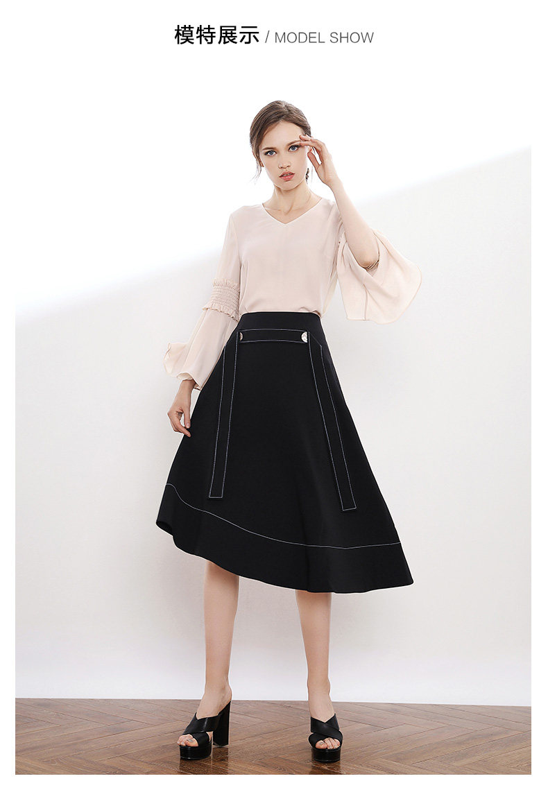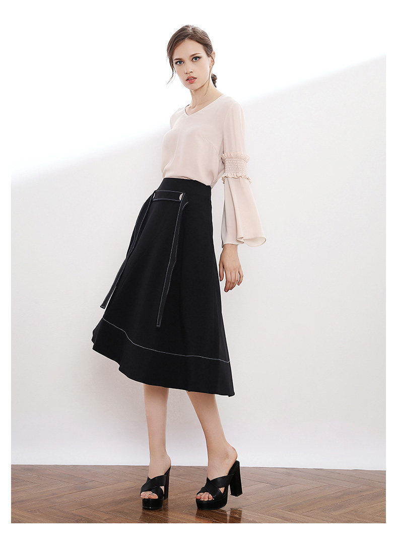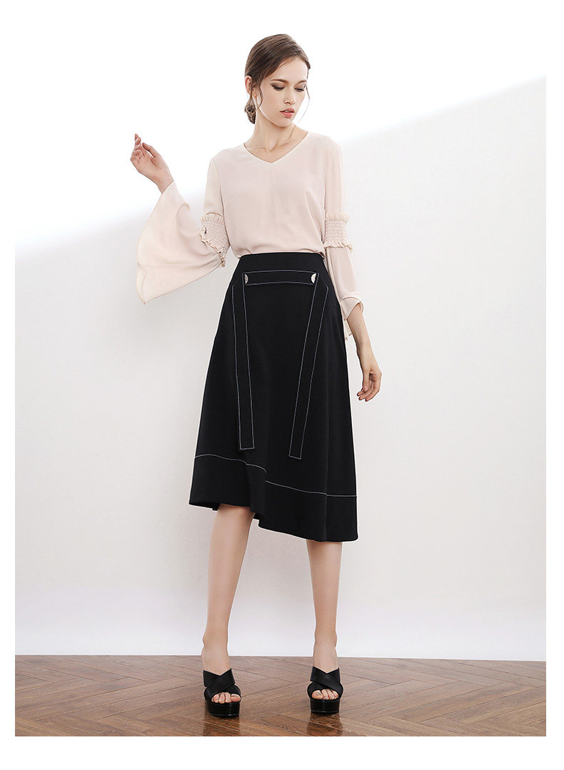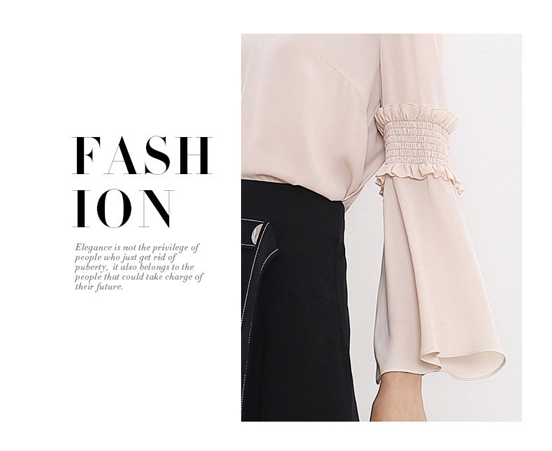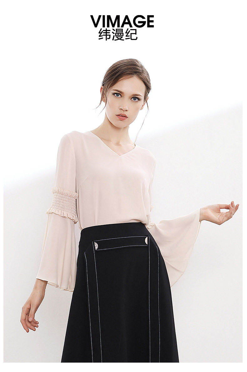 VIMAGE纬漫纪秋季女装拼接花边喇叭袖宽松修身雪纺衫上衣V913514