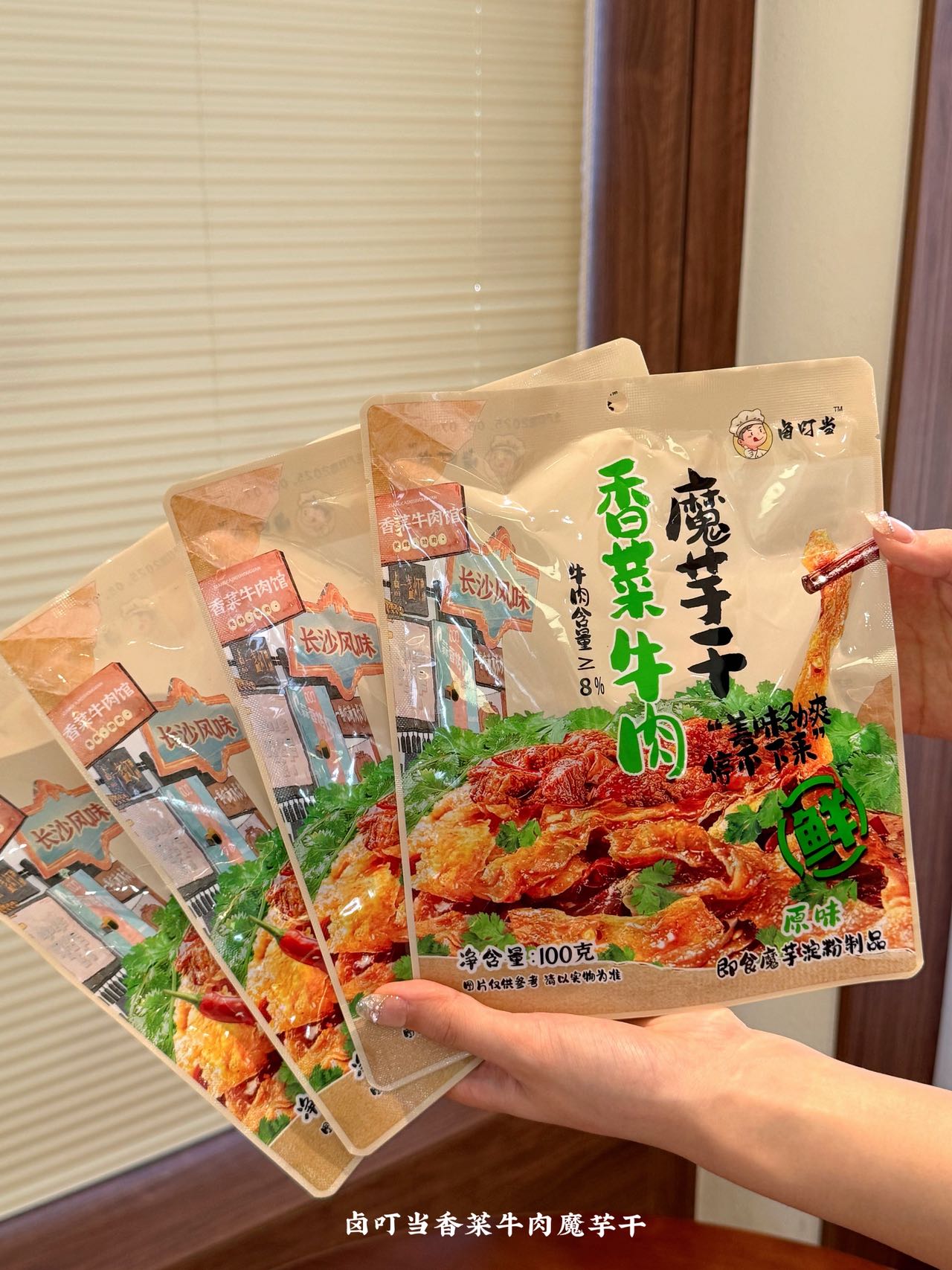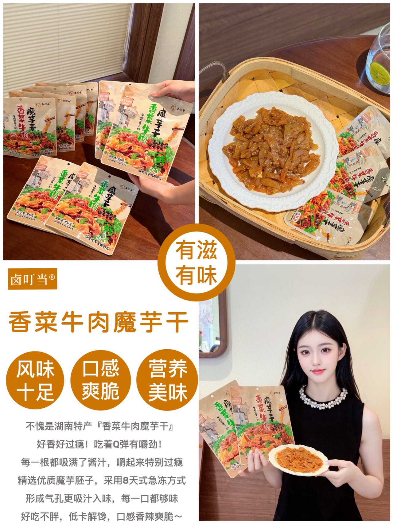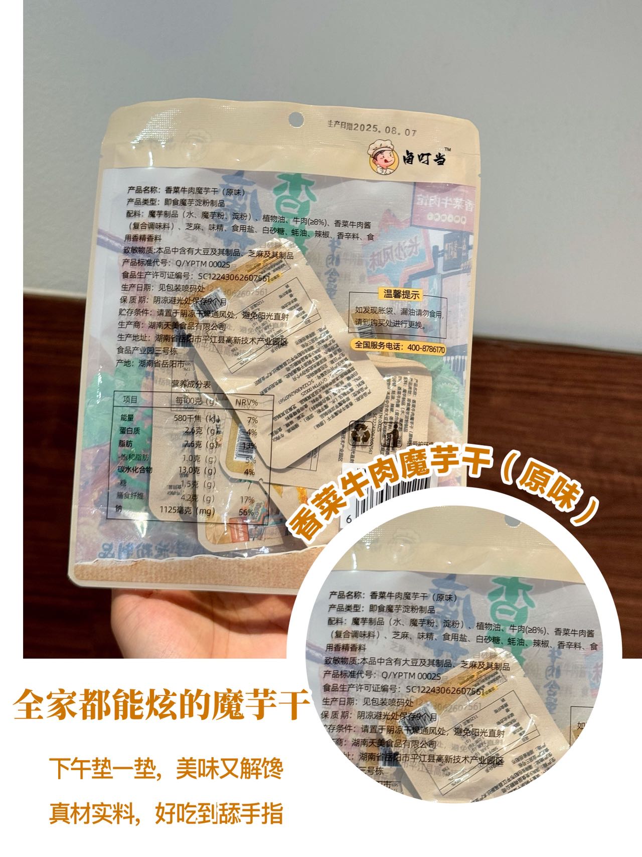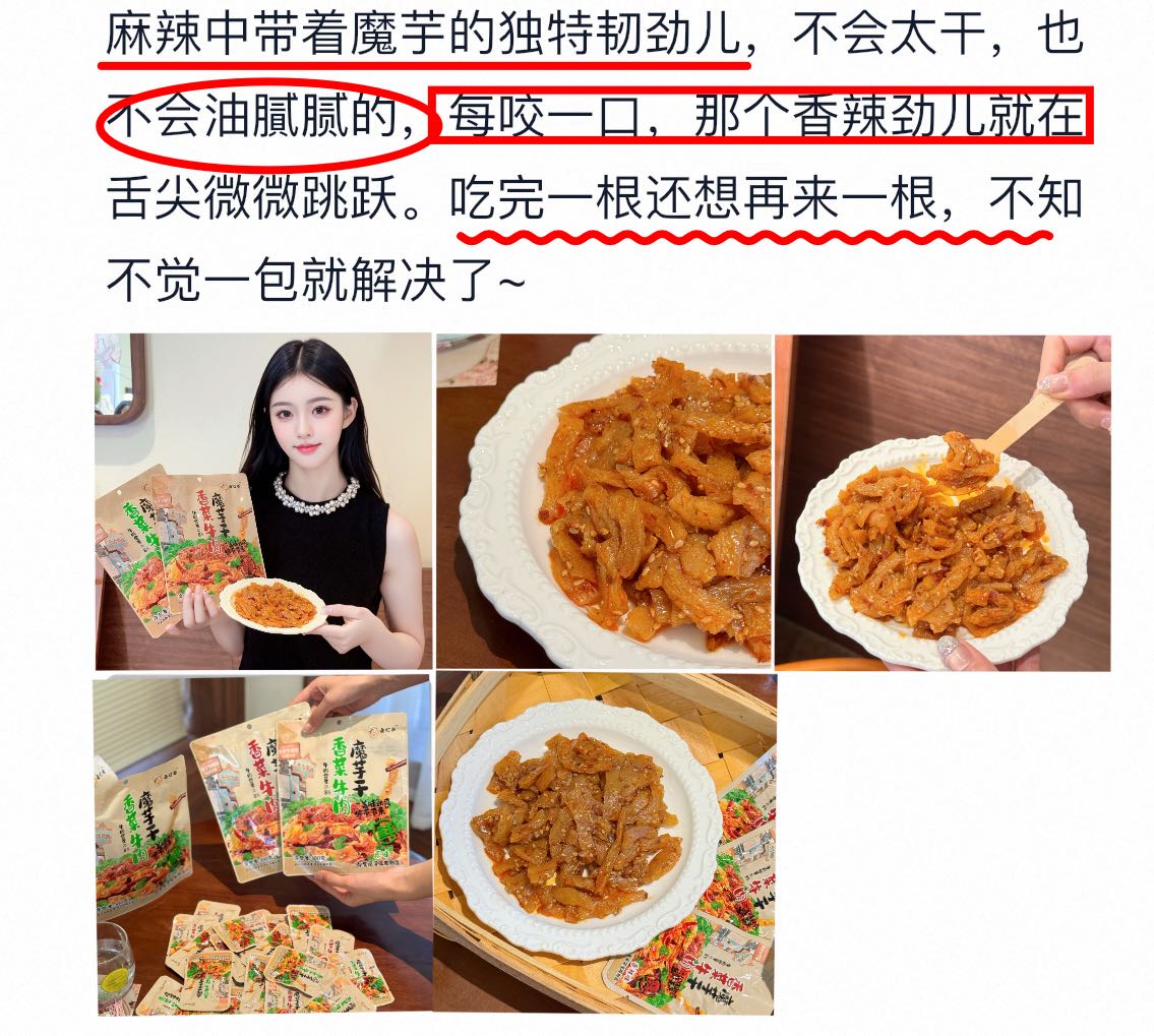 【品牌】卤叮当 【品名】香菜牛肉魔芋干 100g 【市场零售价】59.9元4包,79元6包 【团价】39.9元4包,59元6包 【规格】 【规格一】 ①原味100g*4包; ②香辣100g*4包; ③原味100g*2包+香辣100g*2包 【规格二】 ①原味100g*6包; ②香辣100g*6包; ③原味100g*3包+香辣100g*3包 【生产日期】2025年9月 【质保期】9个月 【产地】湖南省岳阳市 【储存方法】常温存放,避免高温与潮湿处,开封后尽快食用 【食用方法】开封即食(如有漏气或其他质量问题,请勿食用) 【快递】申通、中通、圆通、邮政随机 不支持指定 【发货地】宁波/长沙两地随机 【发货时间】48-72小时 【加邮费地区】北京+1 【不发货地区】新疆、西藏、港澳台 【售后说明】 (1)食品不支持7天无理由退换货,快递发出后,不支持拦截拒收 (2)收货请当面验收,如遇到破损、少件、错发等情况,务必在签收24小时内申请售后,提报售后请提供快递面单图,产品问题图(所有的售后都基于提供照片或视频为凭证,未提供凭证或超过售后时效,不予处理,请理解! (3)由于顾客未及时接听电话、未及时取货、储存不当造成的问题,不售后,不赔付。 (4)商品本身没有质量问题,因个人口感喜好不同、商品色泽、个人感官认知等,不做售后。(5)包装在快递过程中有磨损、变形、有碎纸屑等,产品不影响正常食用的属于正常现象,不作为售后受理,介意勿拍 【注意事项】本品中含有大豆及其制品,芝麻及其制品
