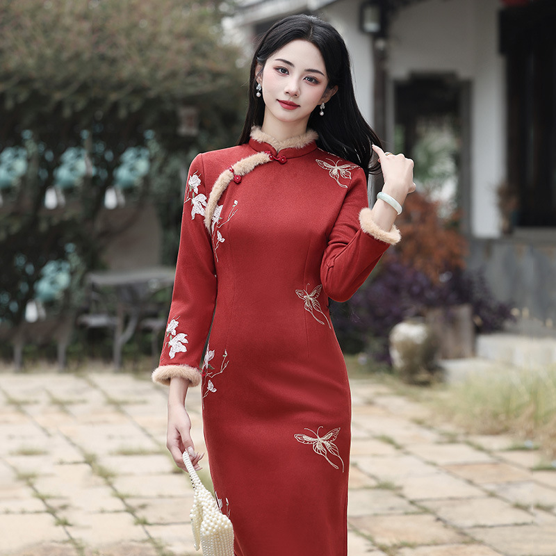 WZY9488 加绒加厚冬装国风新中式长款长袖旗袍改良年轻款女复古秋冬季