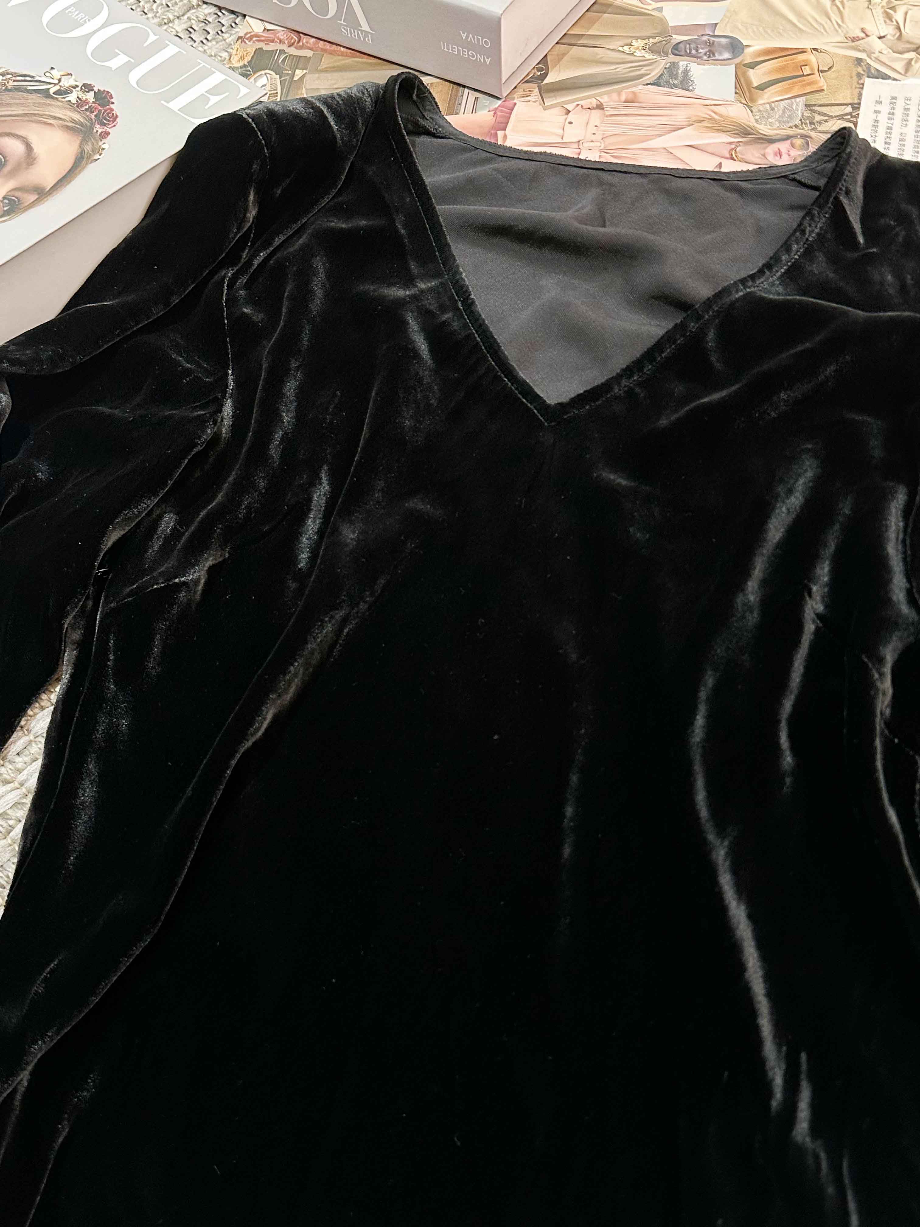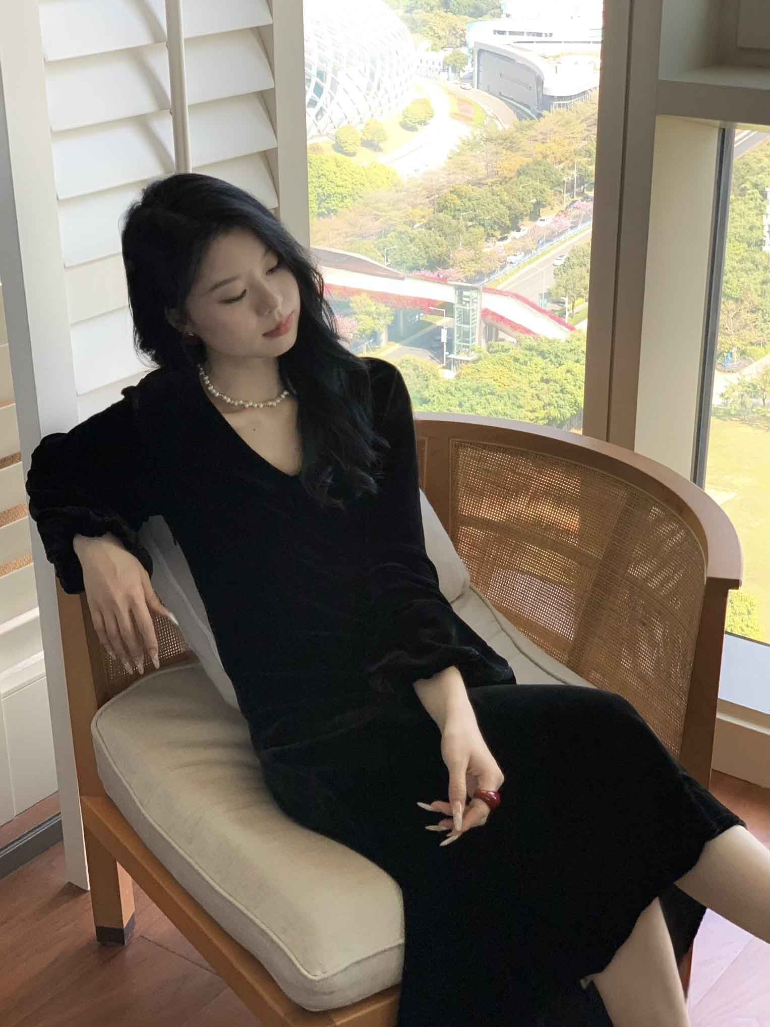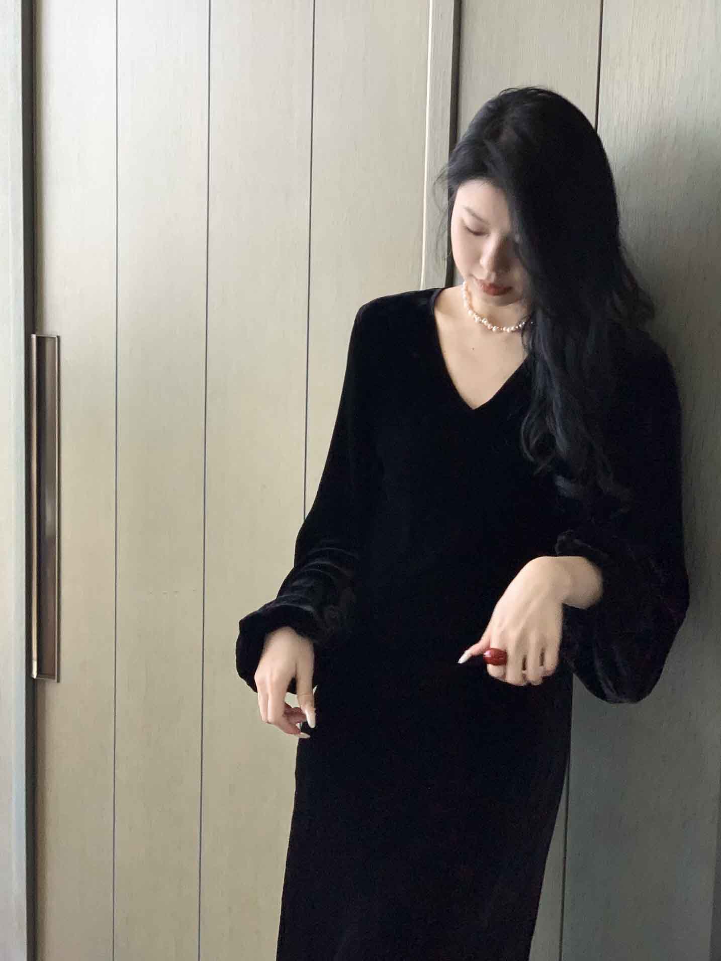 顺丰包邮洛诗琳13038春季新款气质真丝丝绒V领收腰连衣裙10885