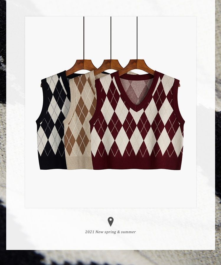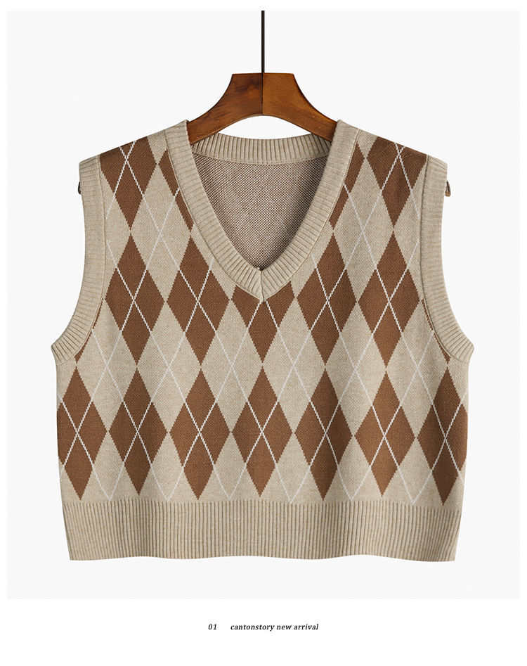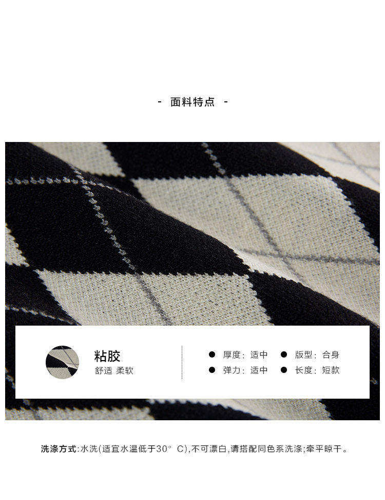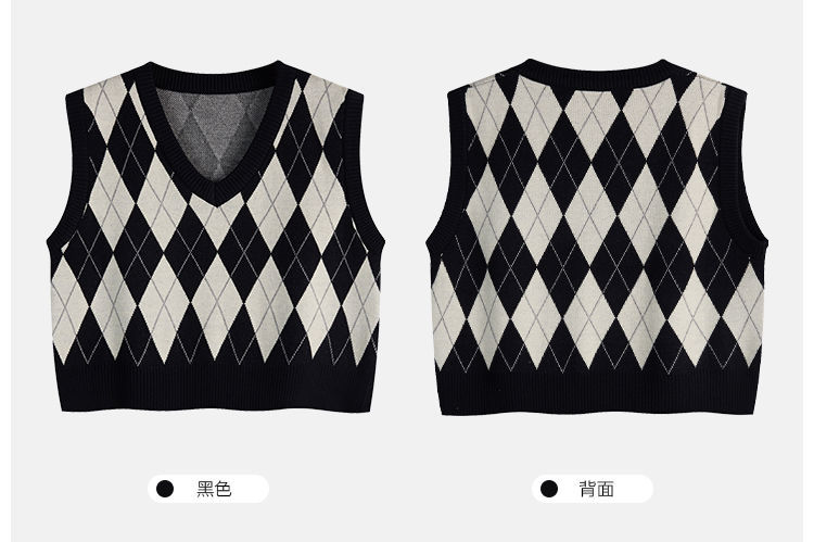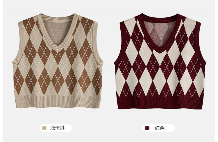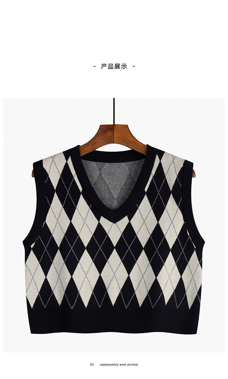 v领菱格马甲女外搭春秋季2021年新款复古叠穿针织背心短款坎肩