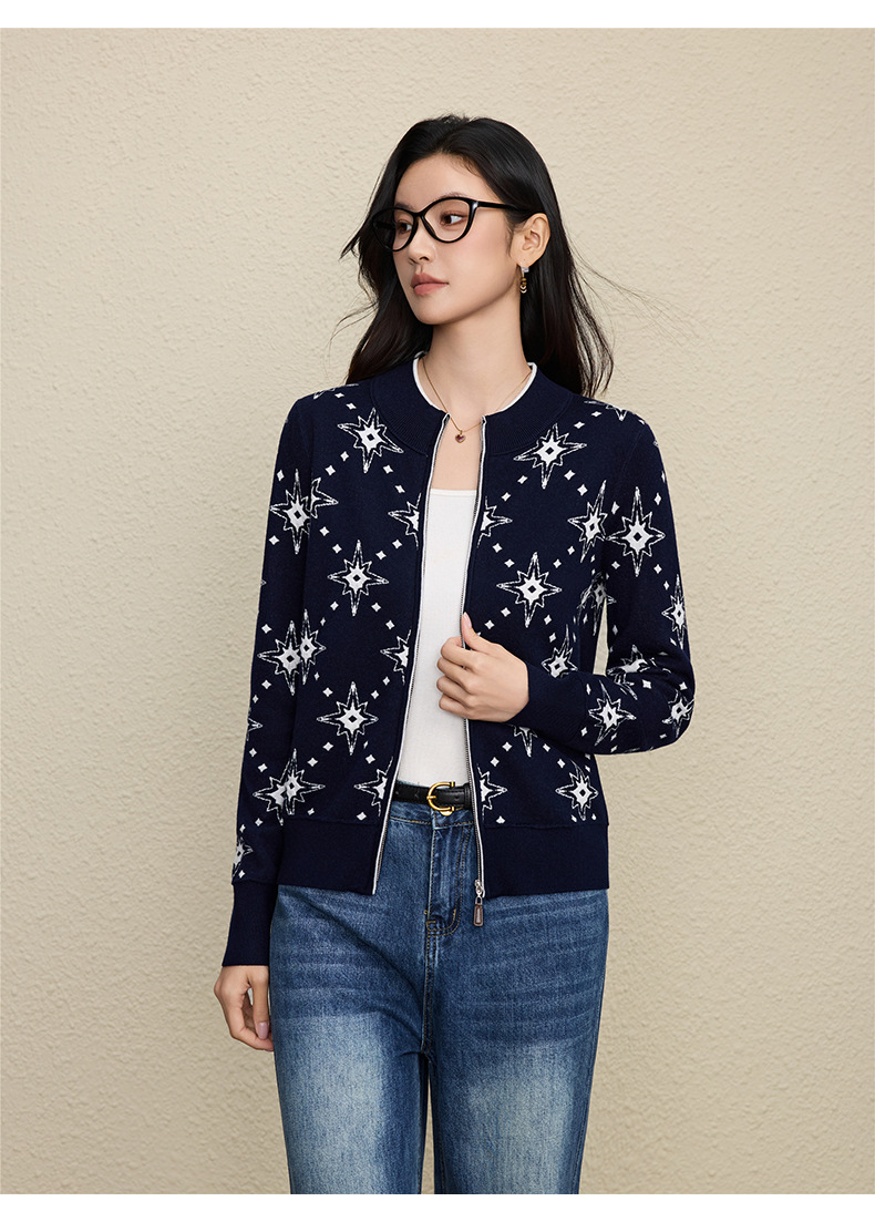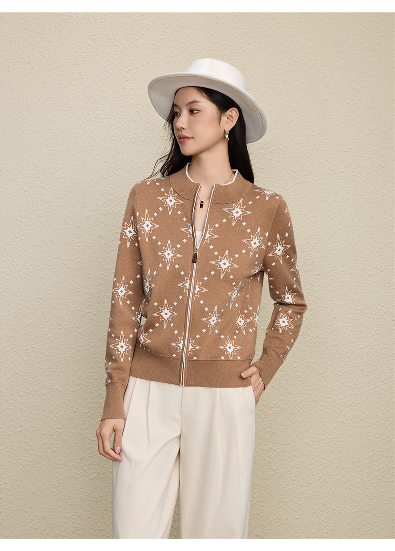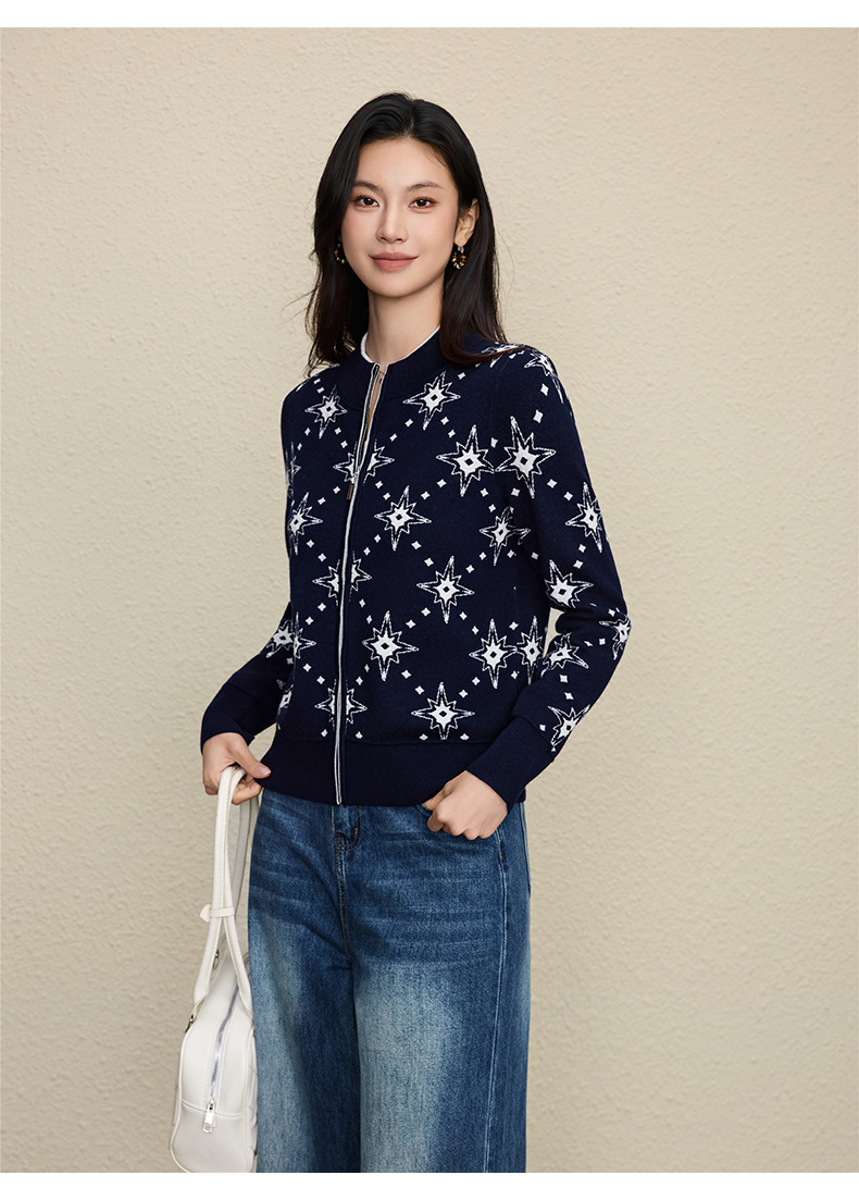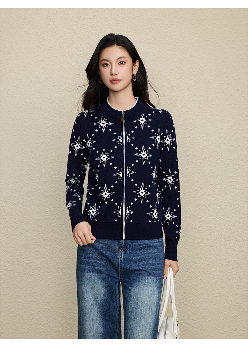 「自」全新升级【铂金会员284/天猫379/差价95】(14202)洛诗琳重工提花星星图案羊毛开衫2025秋冬立领拉链外套女