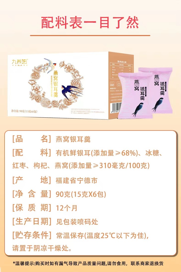 品名:燕窝冻干银耳 规格:6包90g/盒*2盒;拍几份发几个包裹,不一定能同时到达,请耐心等待 发货产地:福建古田 包装方式:盒装 保质期:12个月 物流信息:默认圆通/韵达/申通快递,不支持指定快递 发货区域:新疆、西藏不发;上海、北京、甘肃、宁夏、青海+2元;内蒙+5元; 物流详情:周六、周日及节假日除外,正常48小时内发货,到货时间约为2~5天,请耐心等待 售后说明:收到货后有质量问题,在24小时内都可以拍照(坏品+快递单面箱子一起拍)上传,申请按坏品比例理赔或联系客服,生鲜食品性质特殊,不支持7天无理由退换货;因地址错误,手机号联系不上,拒收等造成的损失无法售后,请理解; |
