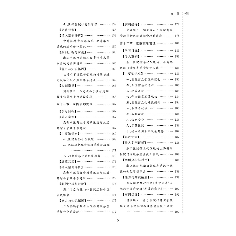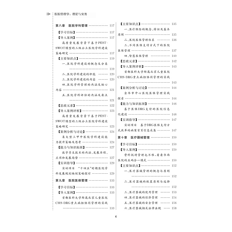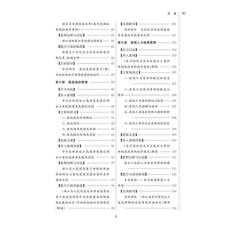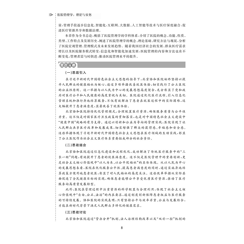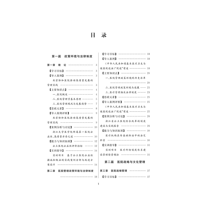 按照“综合理论-应用管理”的学科体系,将教材内容设计为政策环境与法律制度、医院战略与文化管理、医院资源管理、医疗服务管理、医院运营经济管理和医院发展新形态管理六篇章的“案例讨论与实操项目”内容体系。政策环境与法律制度篇、医院战略与文化管理篇、医院资源管理篇、医疗服务管理篇、医院运营经济管理篇、医院发展新形态管理篇。教材每个章节拟遵循【学习目标】→【导入案例】→【主要知识点】→【思政元素】→【导入案例评析】→【案例分析与讨论】→【能力和知识拓展】→【实训与指导】的结构及体例进行编写。本教材以现代医院管理制度建设和公立医院高质量发展为核心,突出 “新体系、新趋势、新效能、新动力、新文化以及党对公立医院的全面领导。