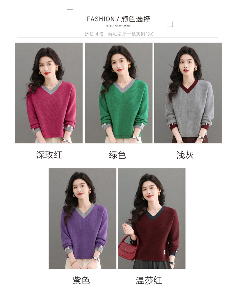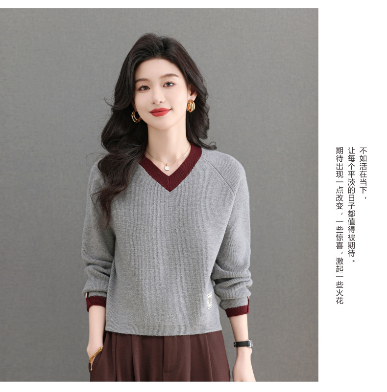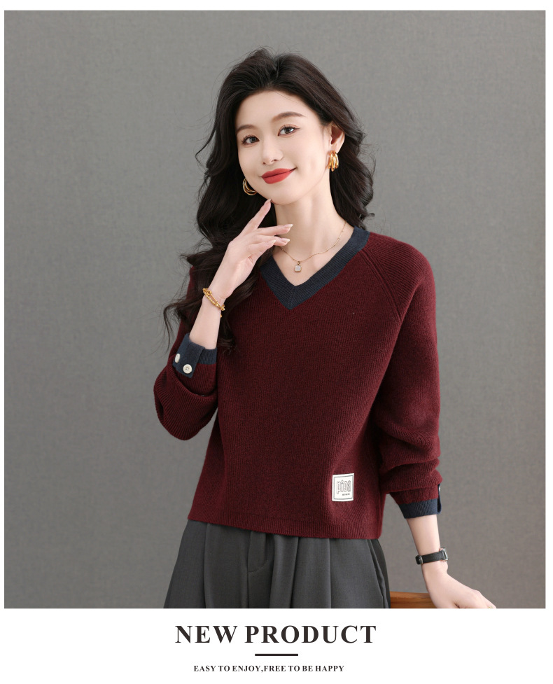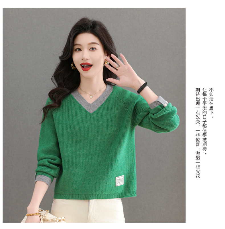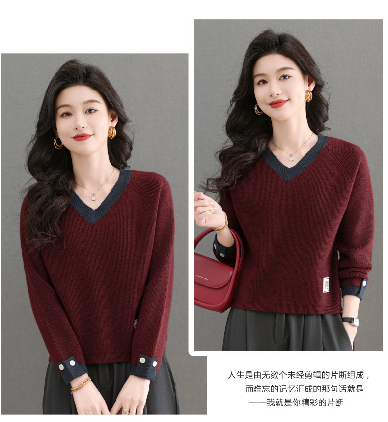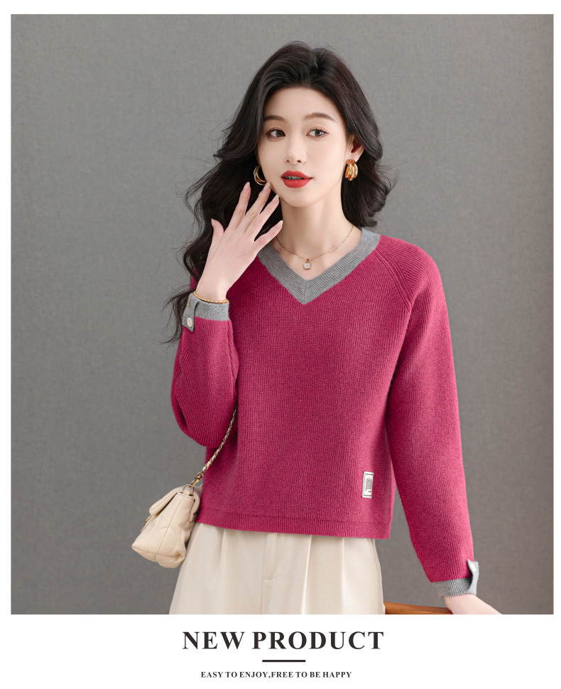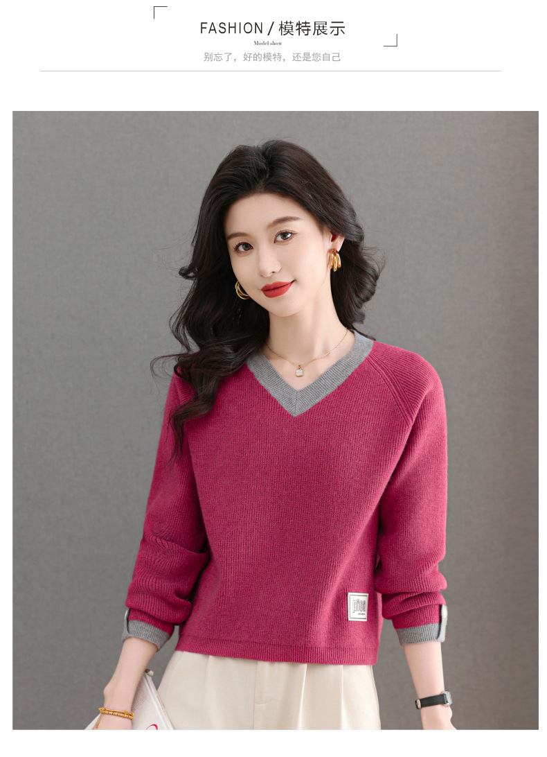 CC-103-A988V领短款毛衣女士2025春秋季新款小个子洋气拼色针织打底衫上衣服
