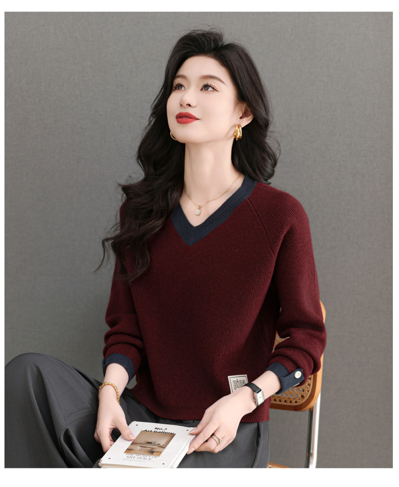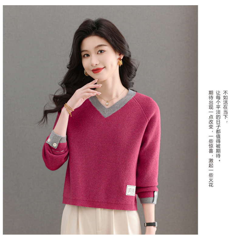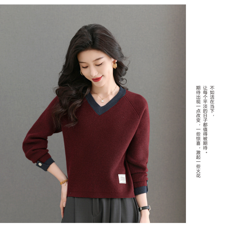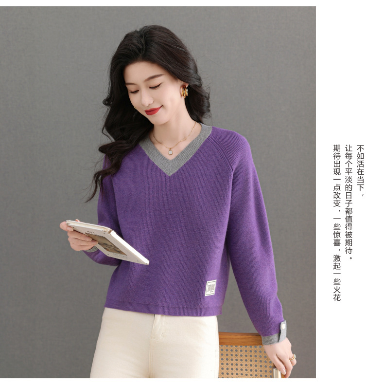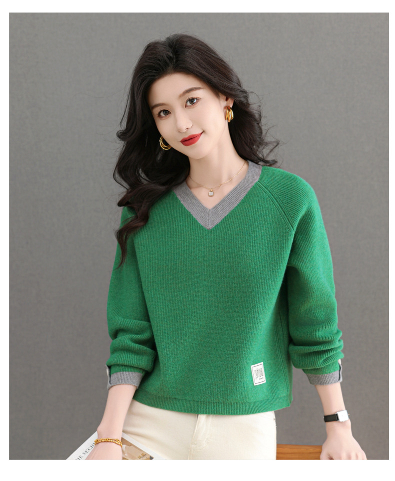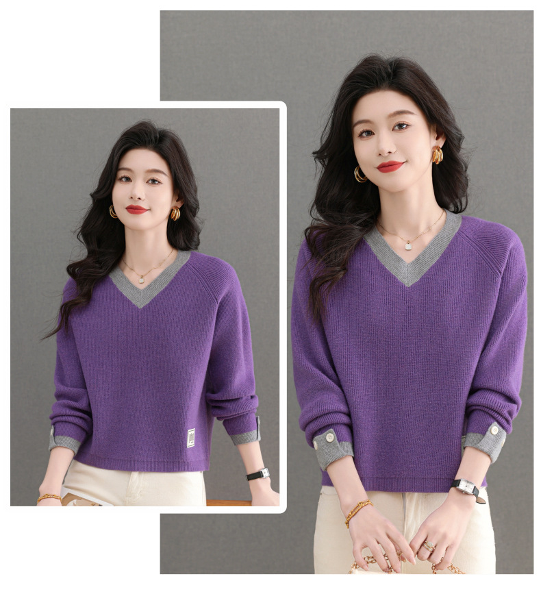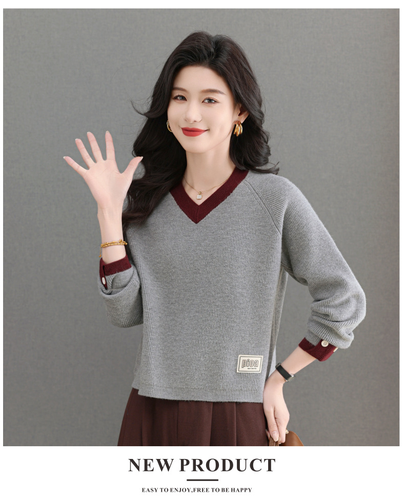 CC-103-A988V领短款毛衣女士2025春秋季新款小个子洋气拼色针织打底衫上衣服