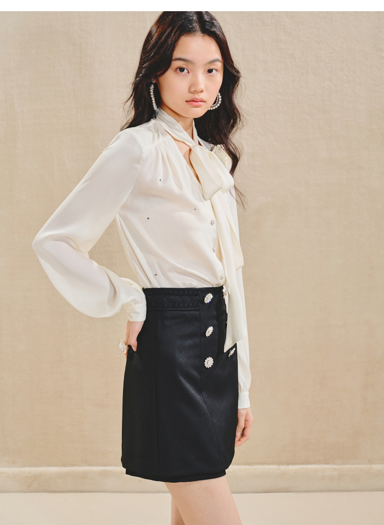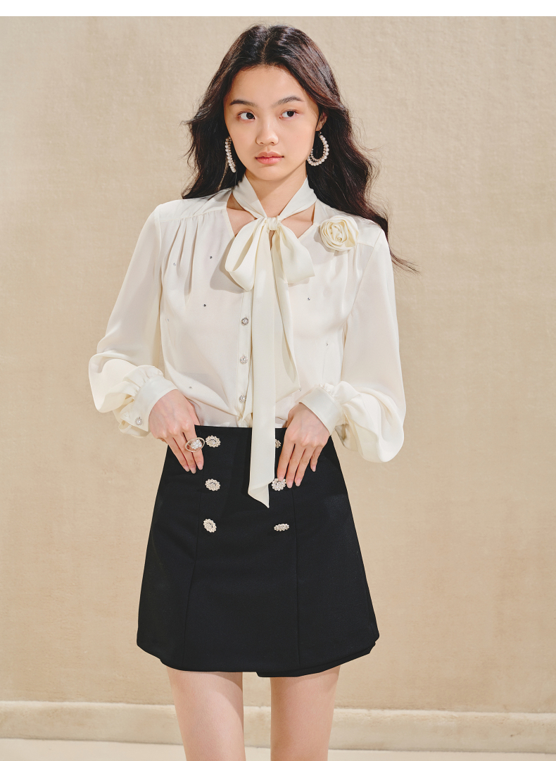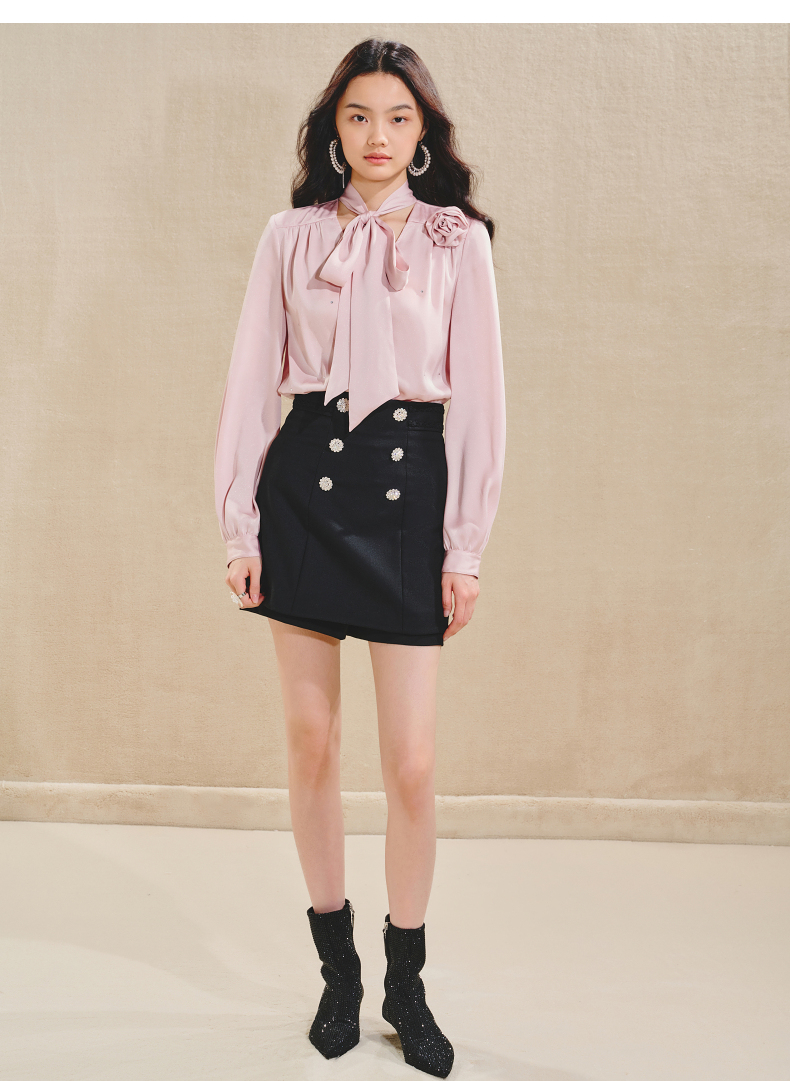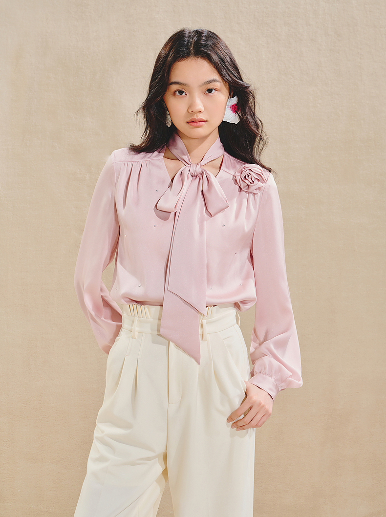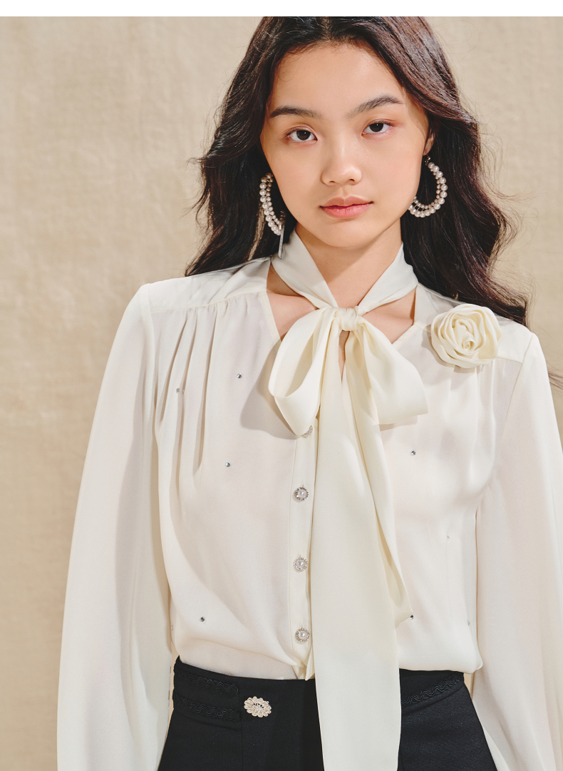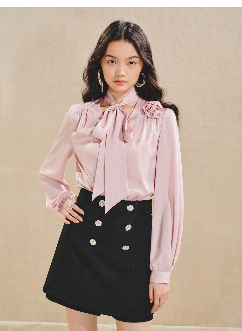 玛克门店发货:MAXRIENY优雅慵懒风缎面衬衫女立体玫瑰装饰上衣(货号:MS85TP503)