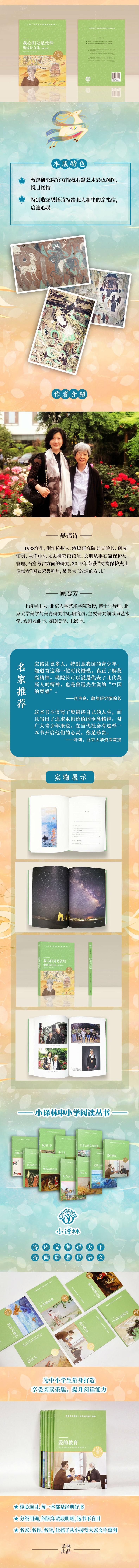 “小译林中小学阅读丛书”专为中小学生量身打造,核心选目,名家、名作、名译,引领学生“读好书,读整本书”,高附加值,实用,有趣,长知识。本书是“敦煌的女儿”樊锦诗特别送给青少年的励志之书,讲述其守一不移的传奇人生,深度讲解精美伦的敦煌艺术,呈现感人肺腑的“莫高精神”,本书亦可作为参观莫高窟的导览手册。内含敦煌研究院授权石窟艺术彩色插图,图文并茂,悦目怡情;特别收录樊锦诗写给北京大学新生的亲笔信,情真意切,启迪心灵。