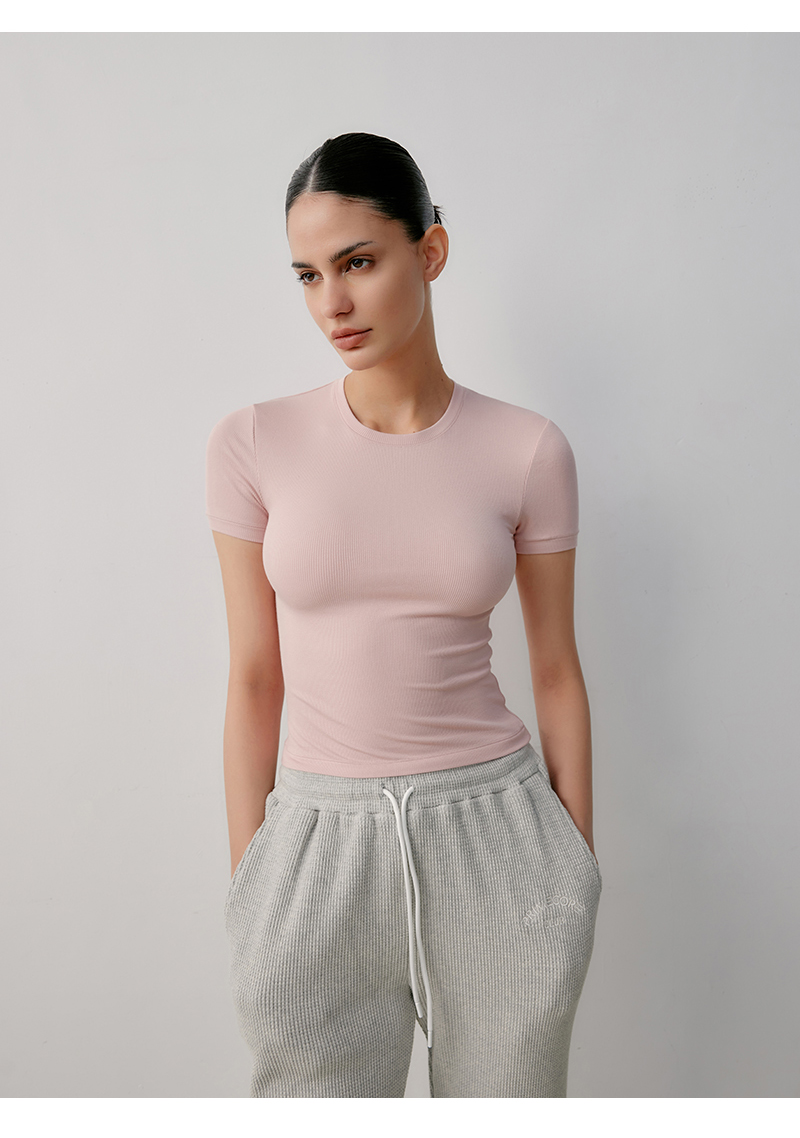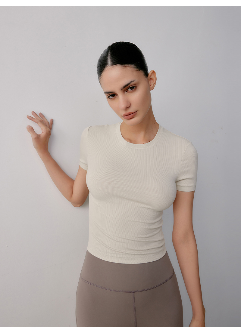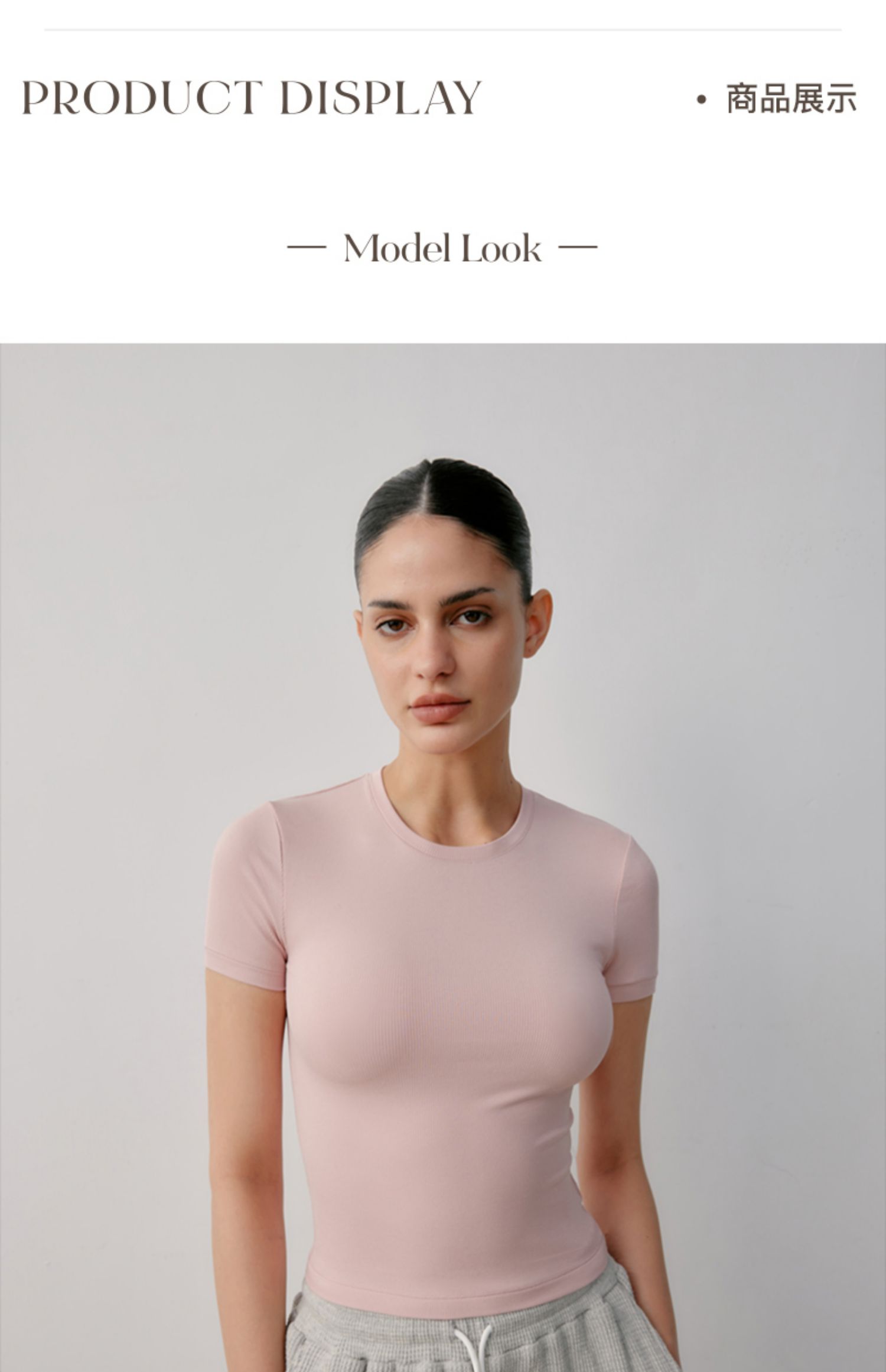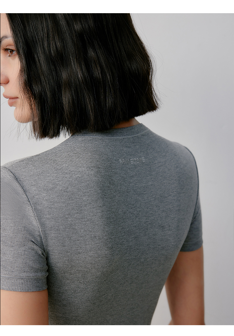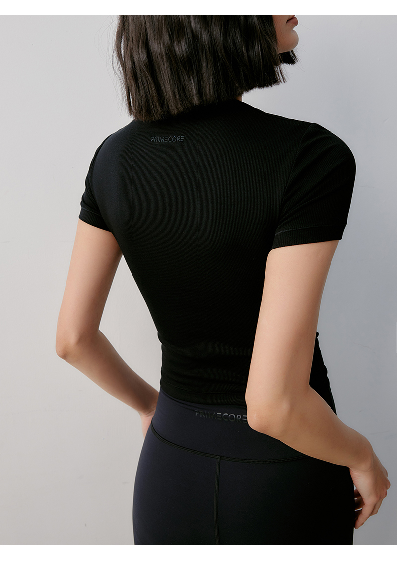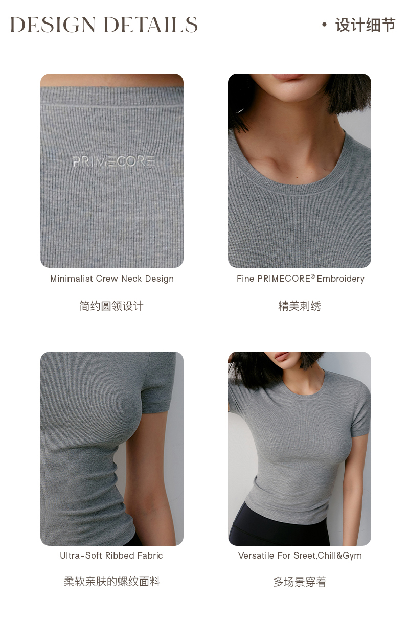PRIMECORE 紧身t恤女式修身短袖螺纹t恤法式上衣紧身短袖修身打底