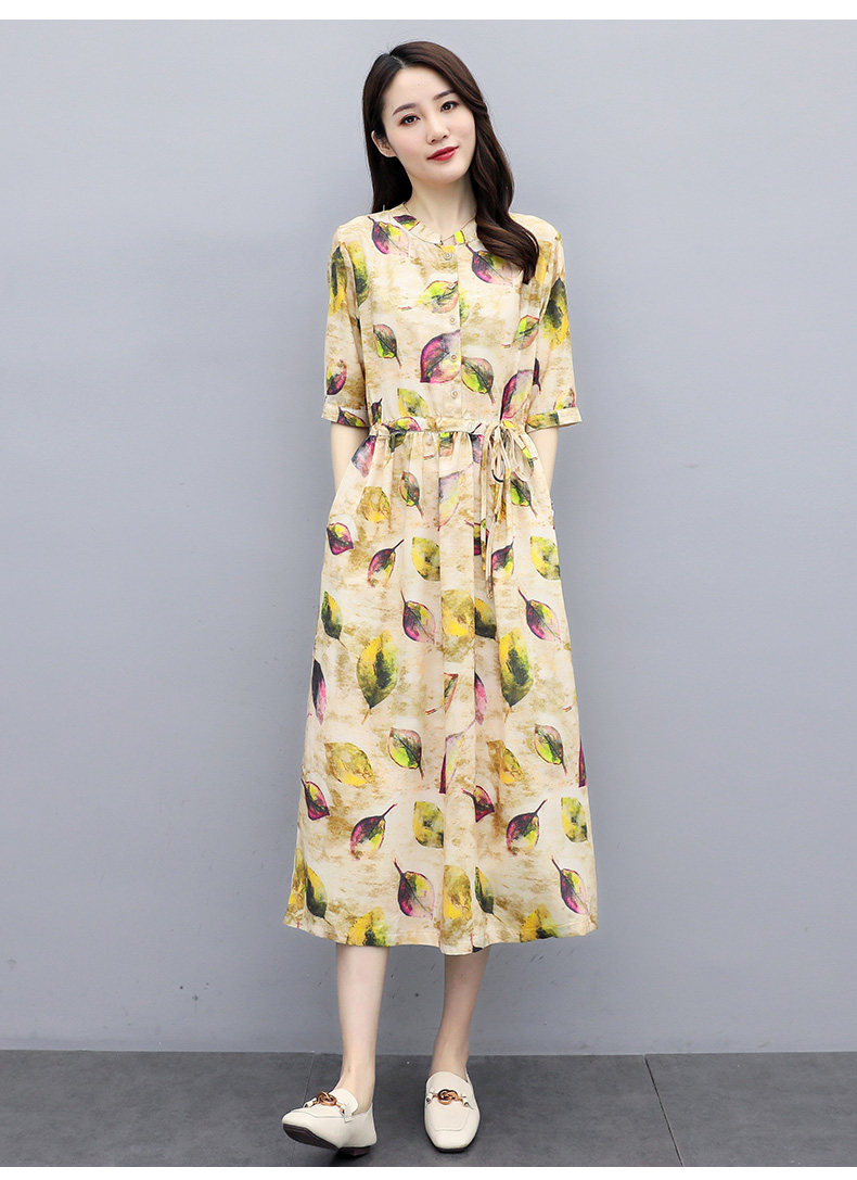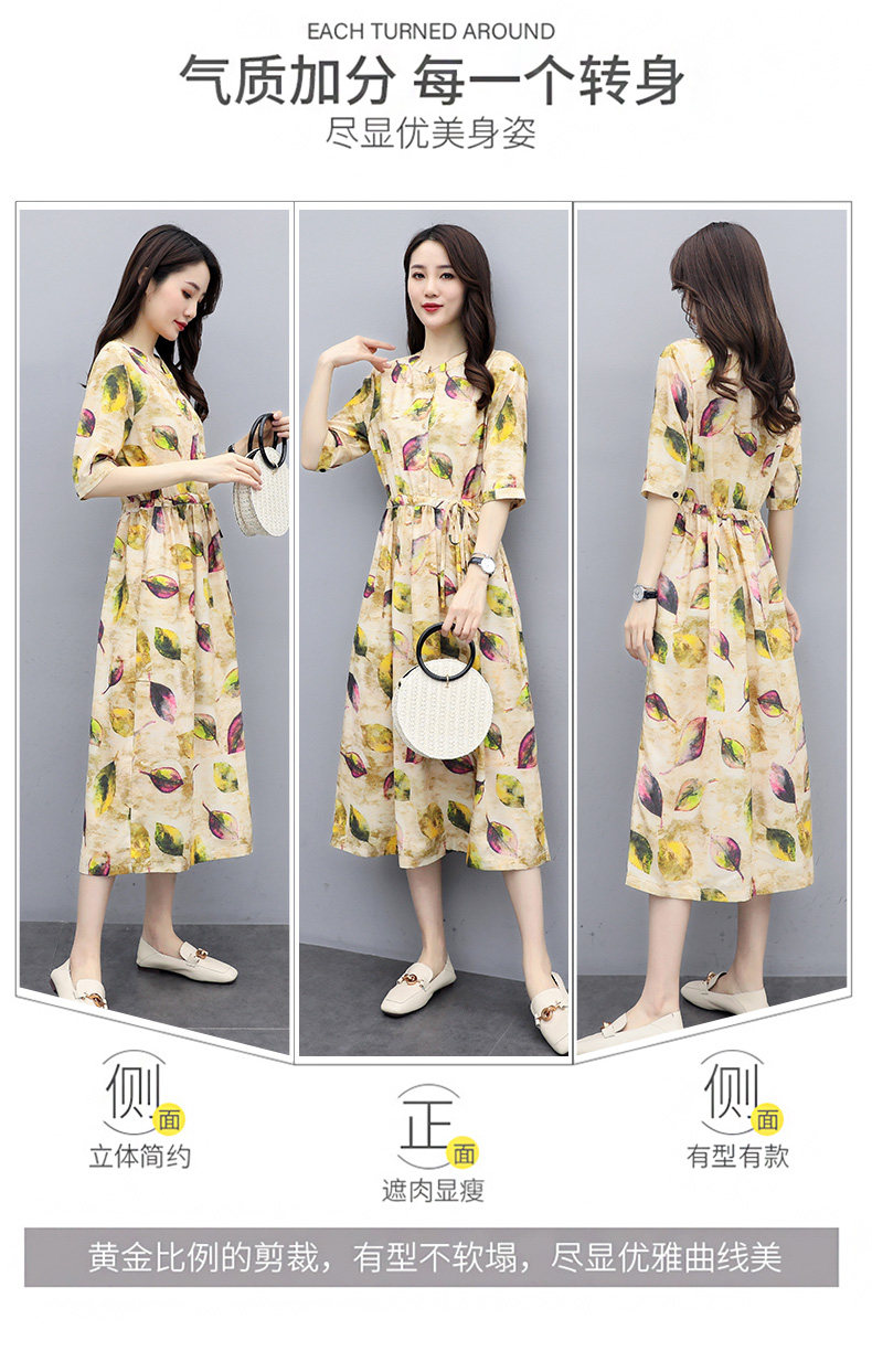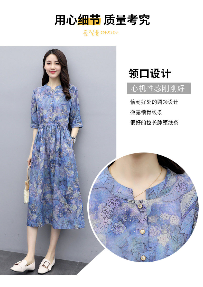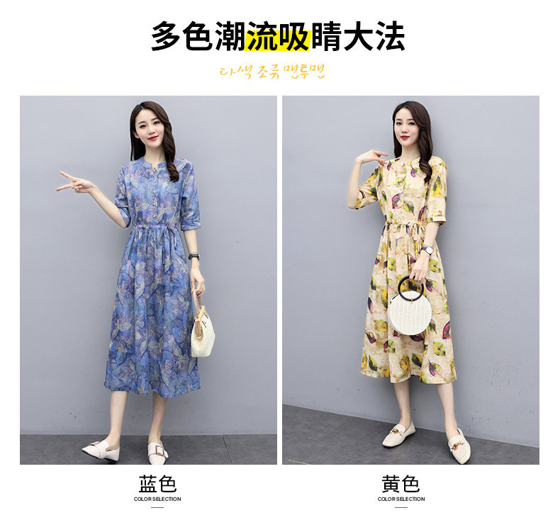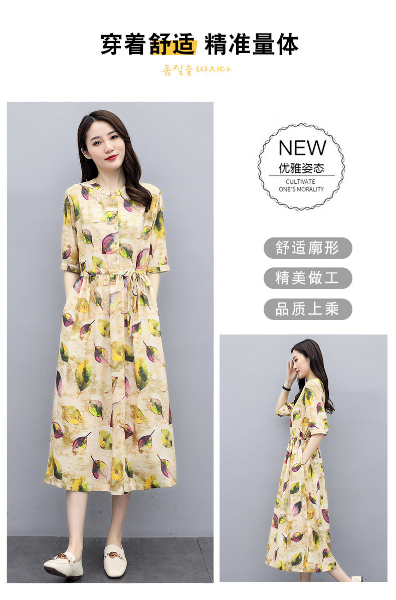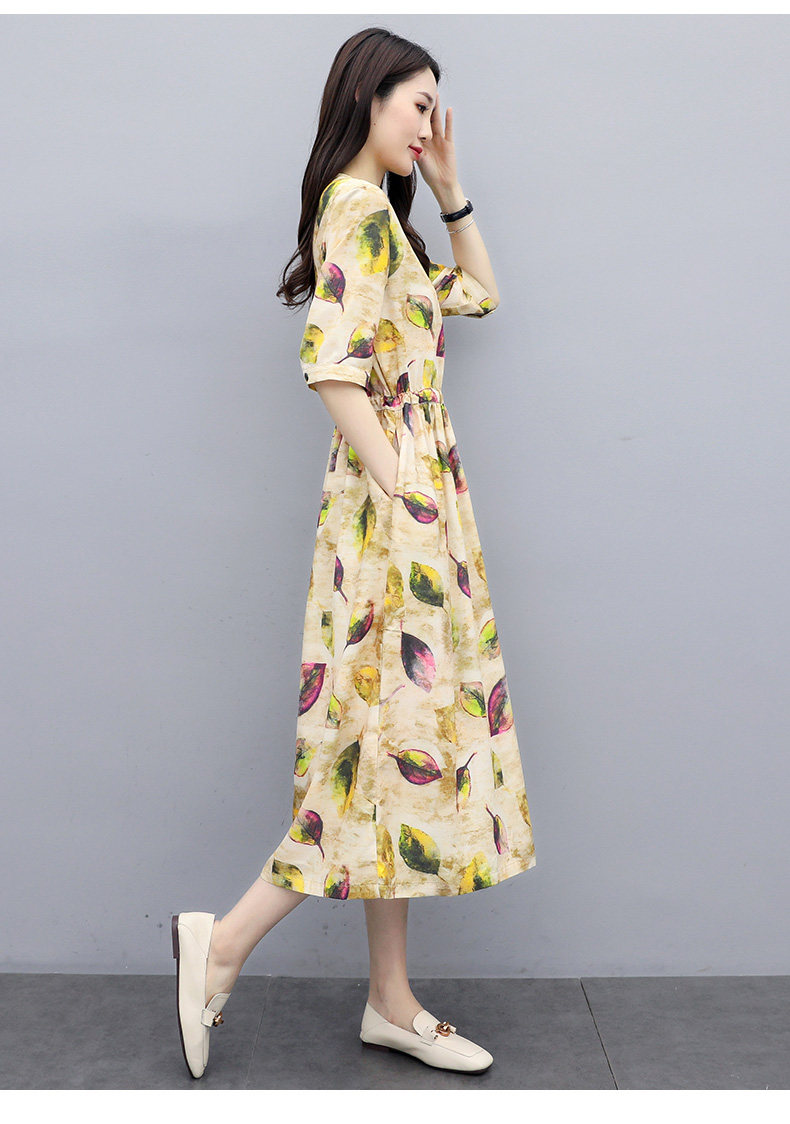 NRJ-8011春装新款收腰休闲气质中长款印花棉麻连衣裙
