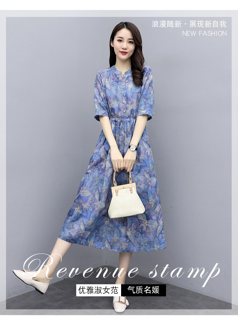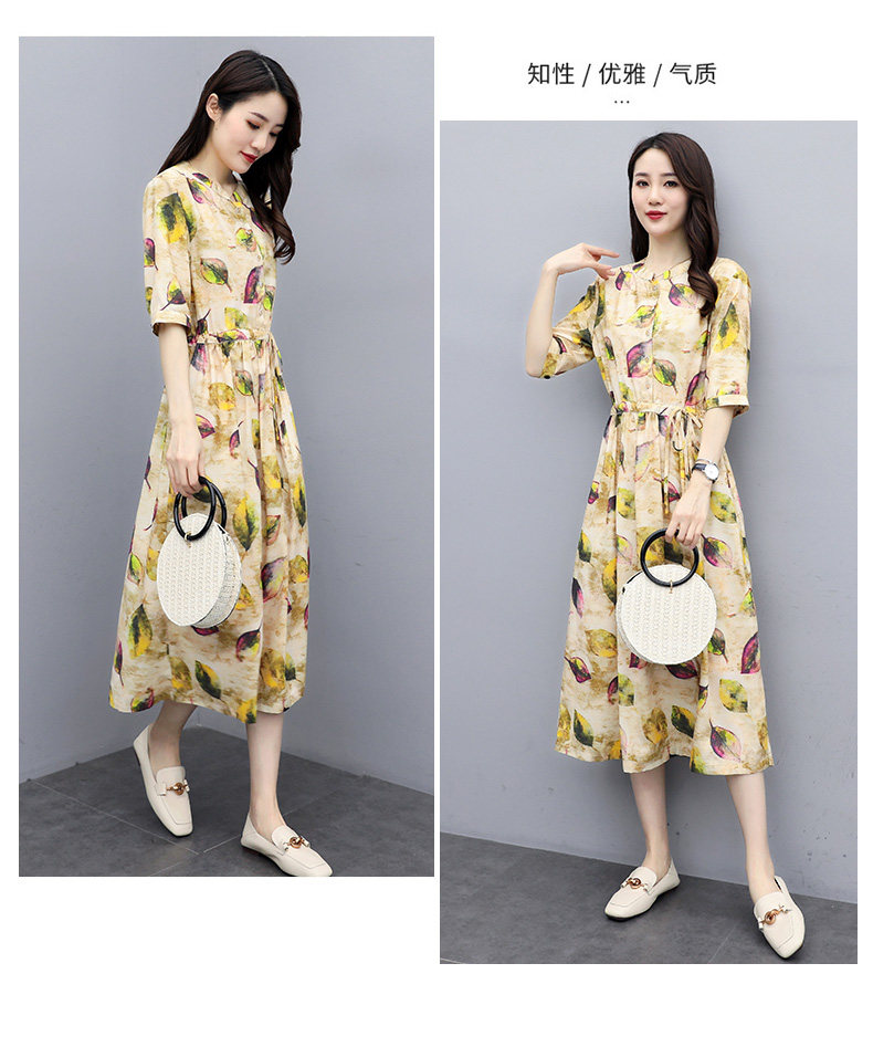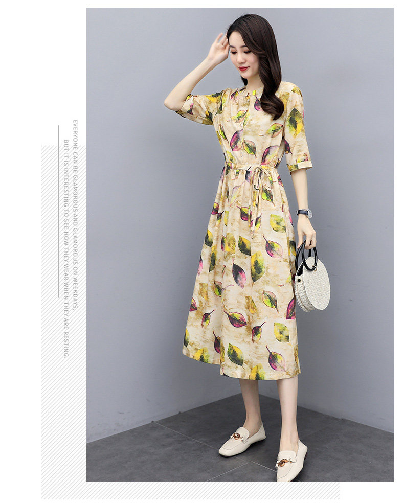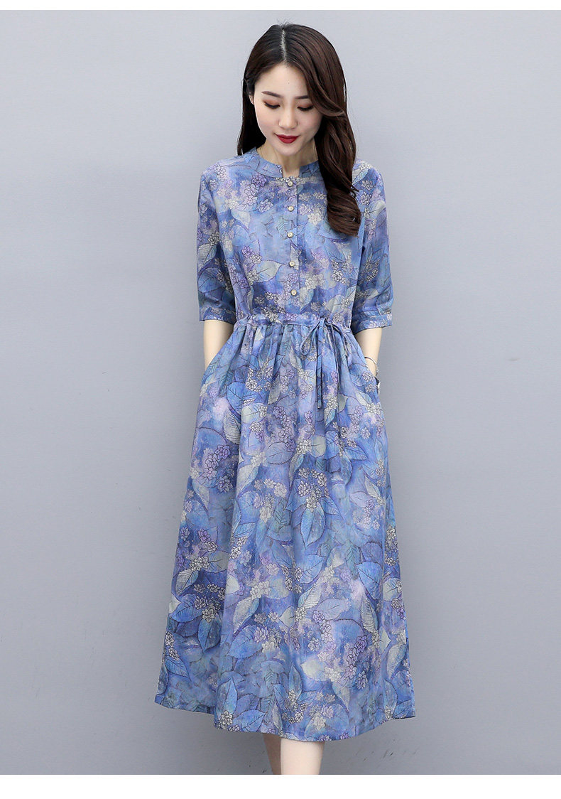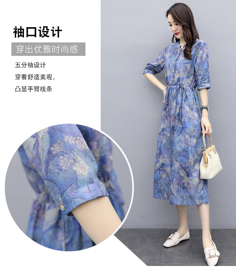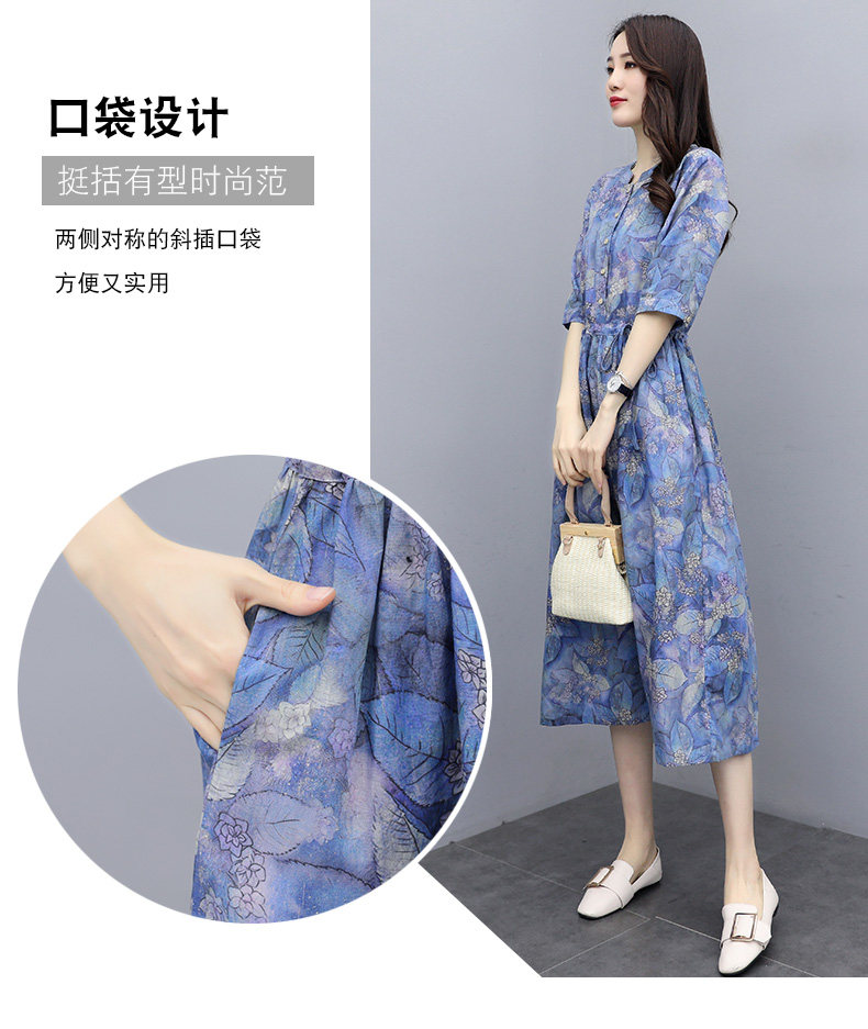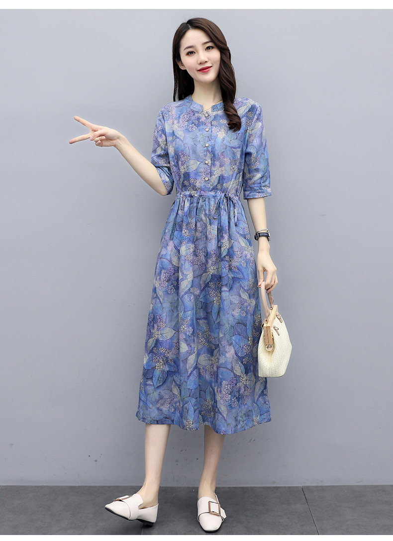 NRJ-8011春装新款收腰休闲气质中长款印花棉麻连衣裙