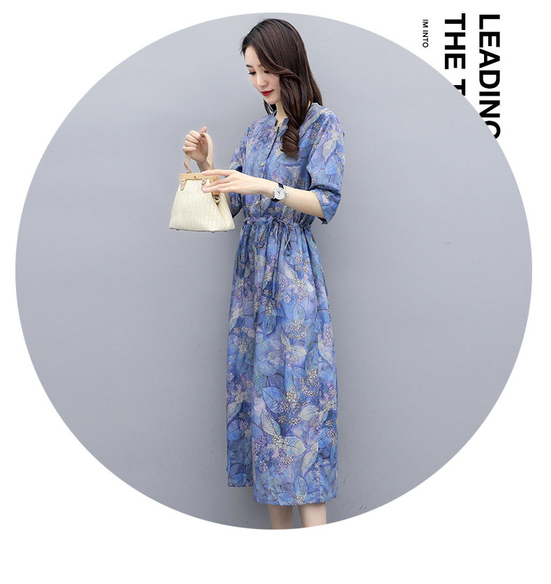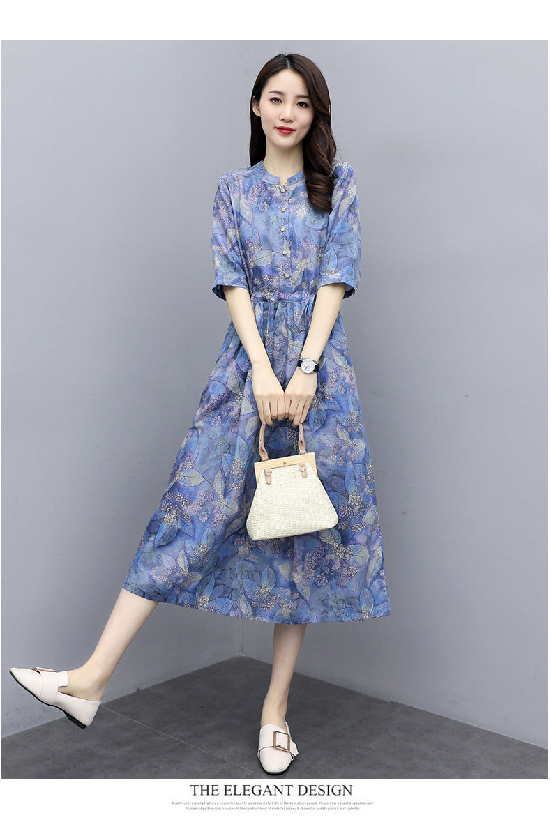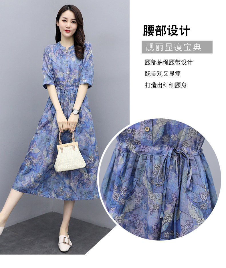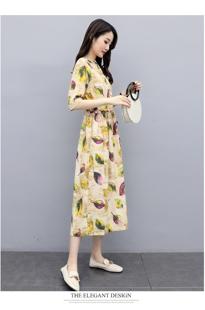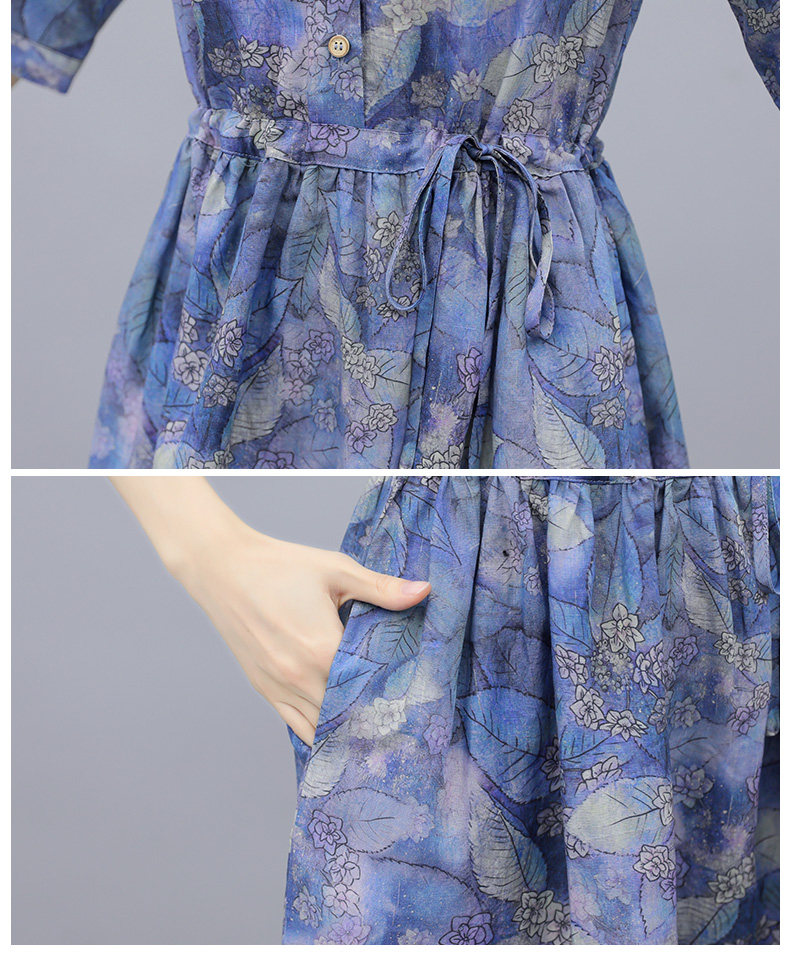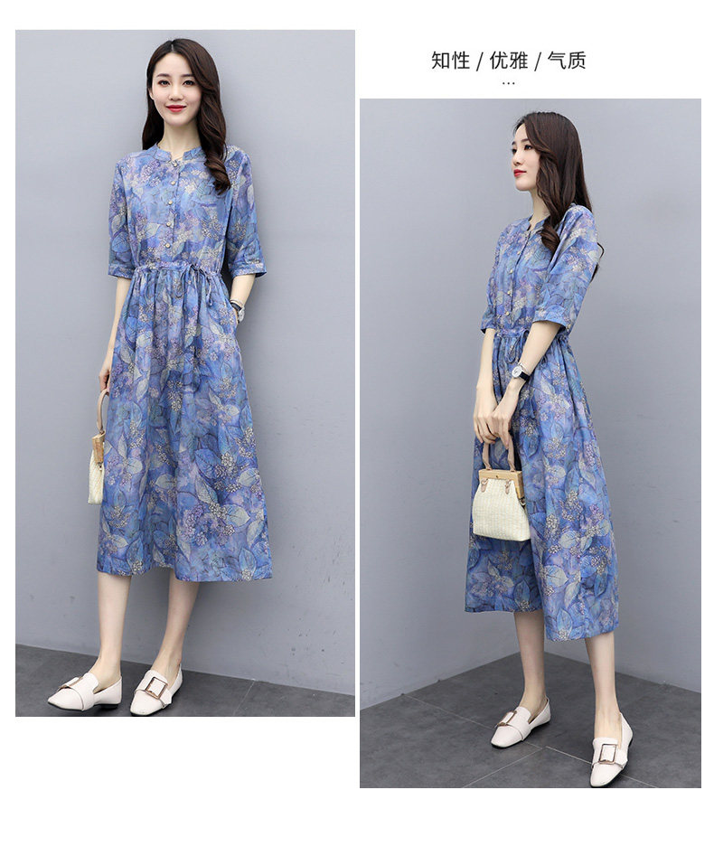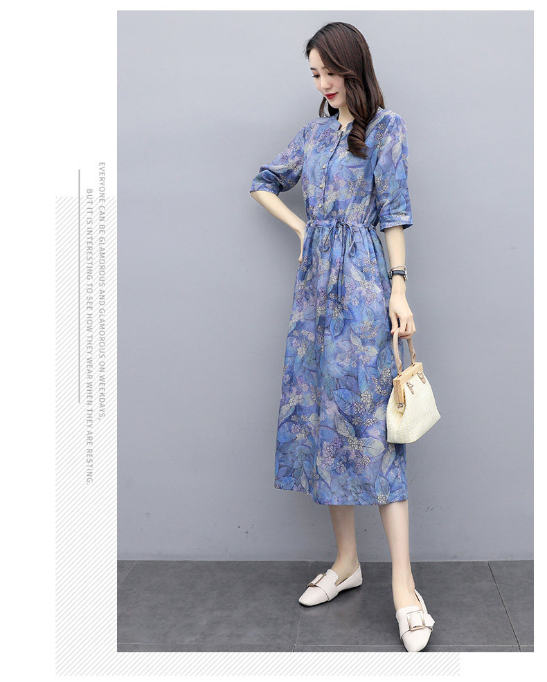 NRJ-8011春装新款收腰休闲气质中长款印花棉麻连衣裙