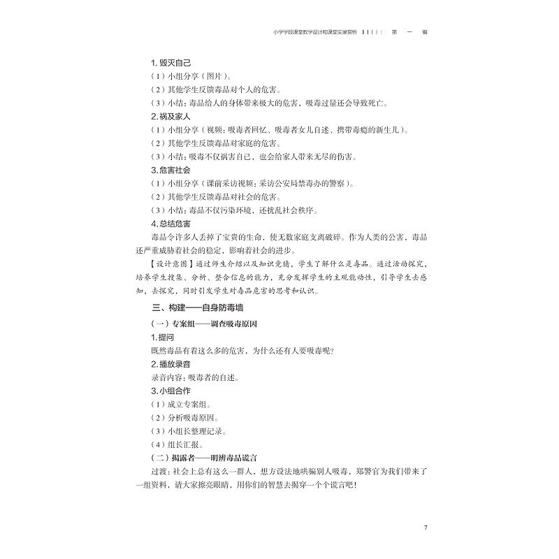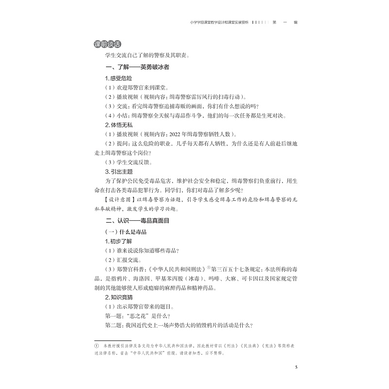 本教材分为小学阶段、初中阶段、高中阶段、大学阶段,结合不同阶段的教育目标和理念进行禁毒与法治教育。教学设计与实践的理论基础主要采用建构主义教学理论,从学生已有的知识及经验的起点出发,开展生活化的情境学习,通过创设情境搭建起学习的脚手架,以问题为引领,采取案例分析法、情境探究法、合作学习法开展学习活动,充分发挥学生的主动性、积极性和创造性,从中建构认知、发展情感、培育思维、形成价值、养成行为,由此提升自身的生活,彰显素养培育的价值所在。强调课程实施的实践性和开发性,要落实以学生的发展为本,切实落实学生的主体地位,让学生自主学习和合作交流相结合,将知识传授的过程转变为知识生成的过程,使学生在知识的生成和构建过程中,积极思考,增强辩证思维能力。