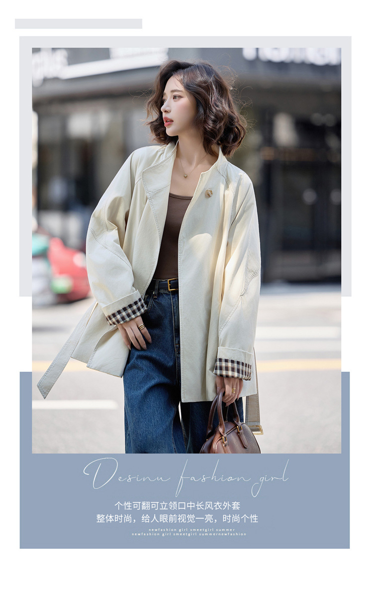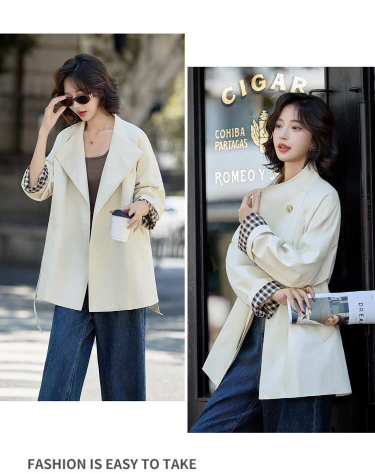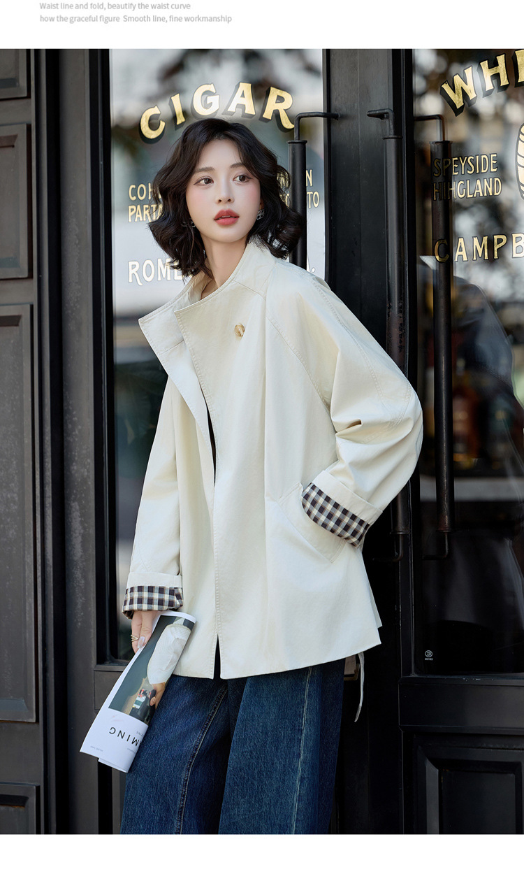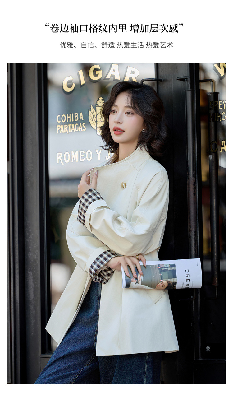 HR MEIQIN5698韩系休闲风衣外套宽松翻领格纹拼接上衣 商品图0
