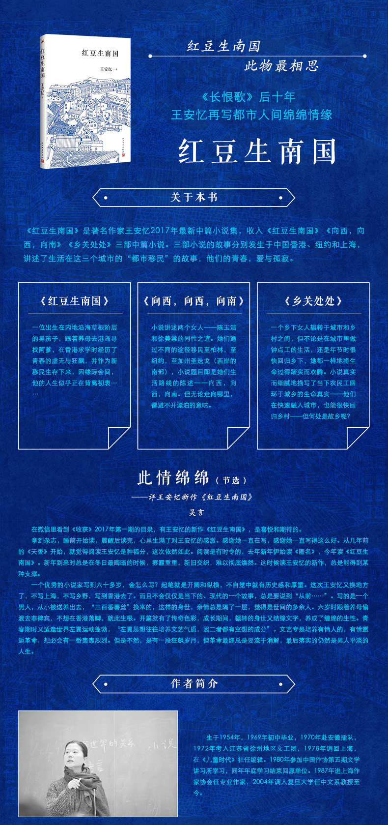 《红豆生南国》是著名作家王安忆2017年最新中篇小说集,收入《红豆生南国》《向西,向西,向南》《乡关处处》三部中篇小说。三部小说的故事分别发生于中国香港、纽约和上海,讲述了生活在这三个城市的“都市移民”的故事,他们的青春,爱与孤寂。