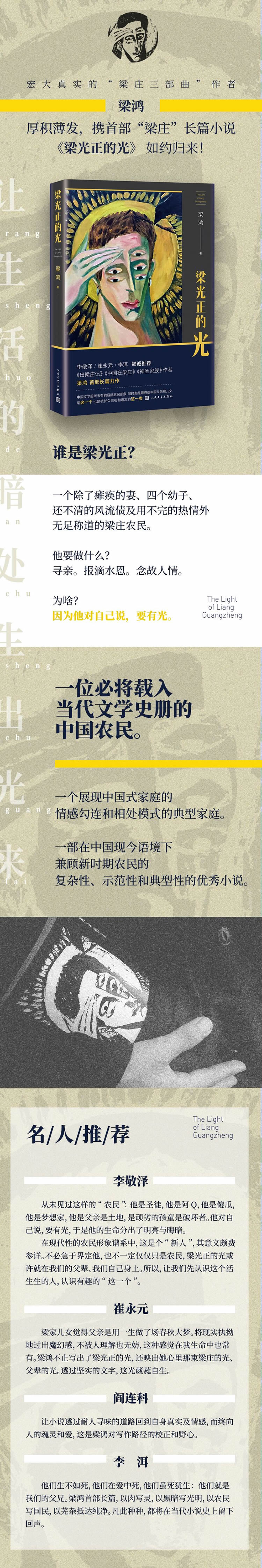 《梁光正的光》是在“梁庄三部曲”等影响极大的非虚构作品之后,梁鸿首部挑战自我完成的长篇虚构力作。故事同样发生在并非实有的“梁庄”,并以她的父亲富有典型意义的一生为原型;不仅继续保持了作者在非虚构写作中表现出来的对近四十年中国社会发展变革现实的关切和介入精神;还因首次采用小说方式,文本飞扬的想象力和厚重现实性得以真正比肩,这部小说可以说彻底释放了作者在声名卓著的“非虚构”写作中长久被压抑和稀释的虚构才华。