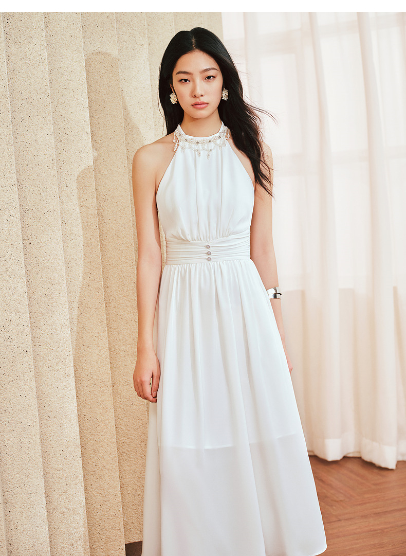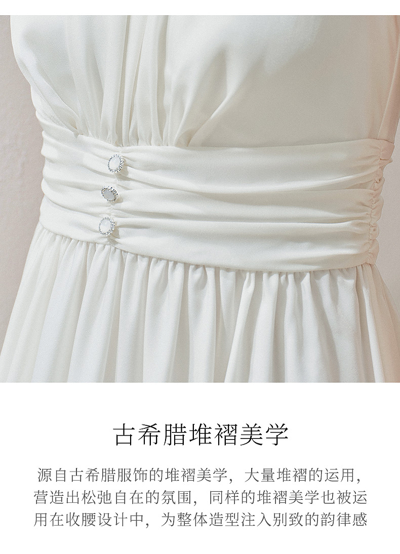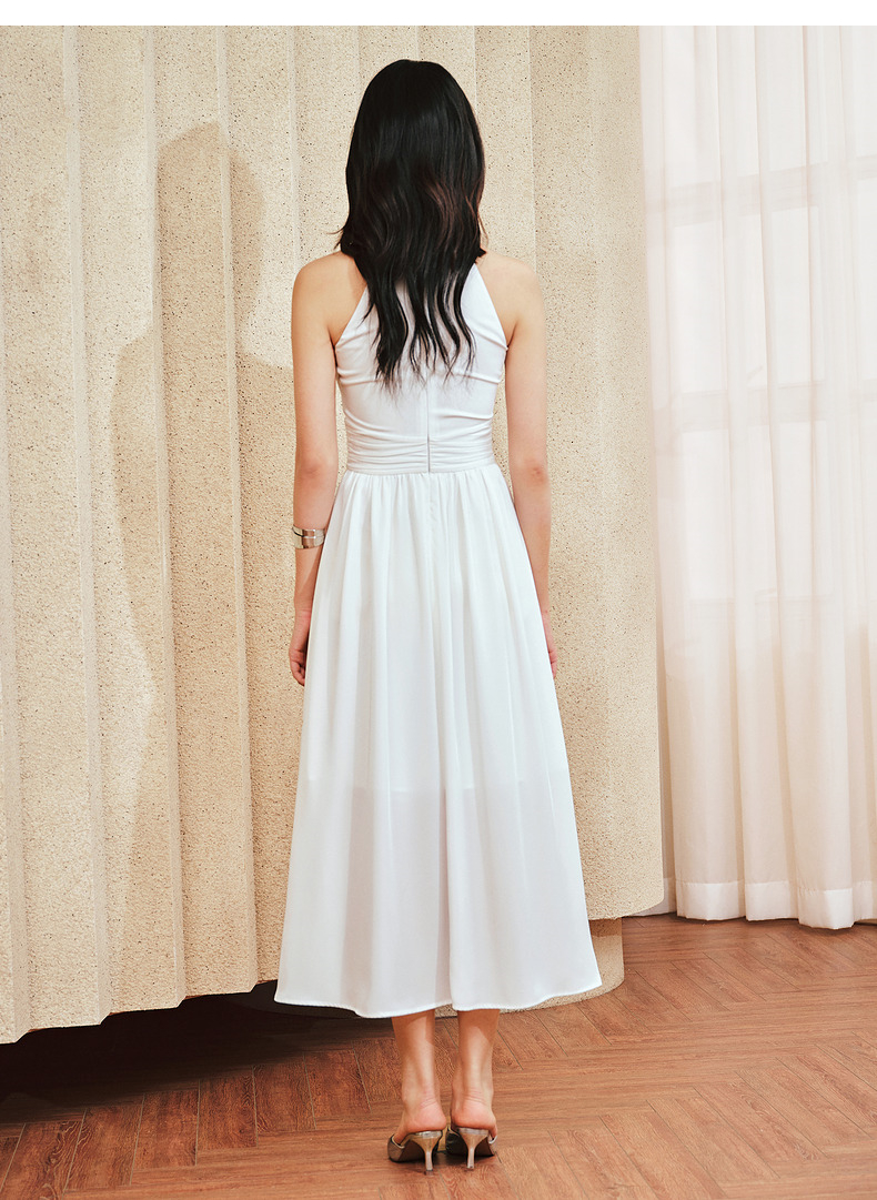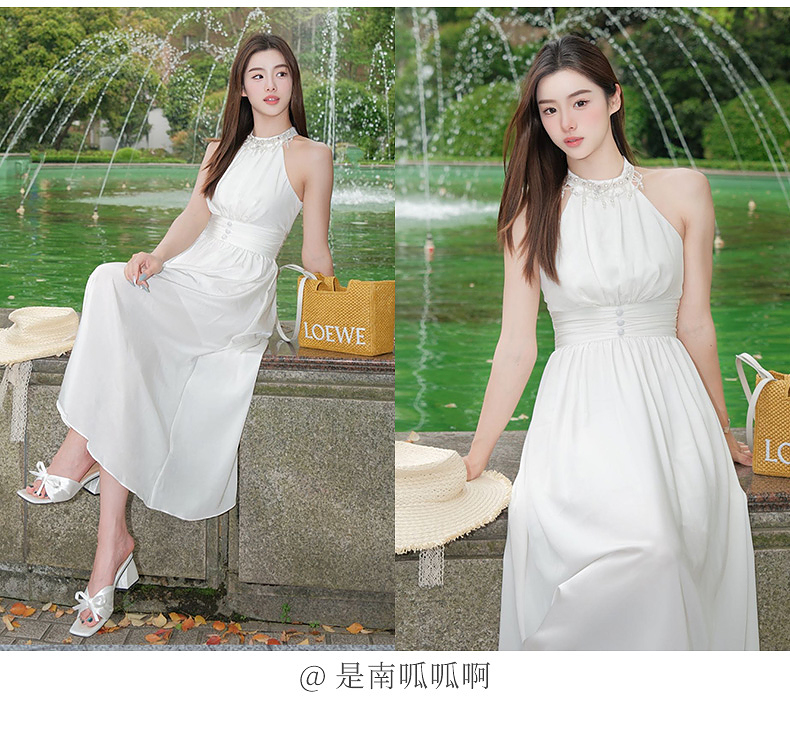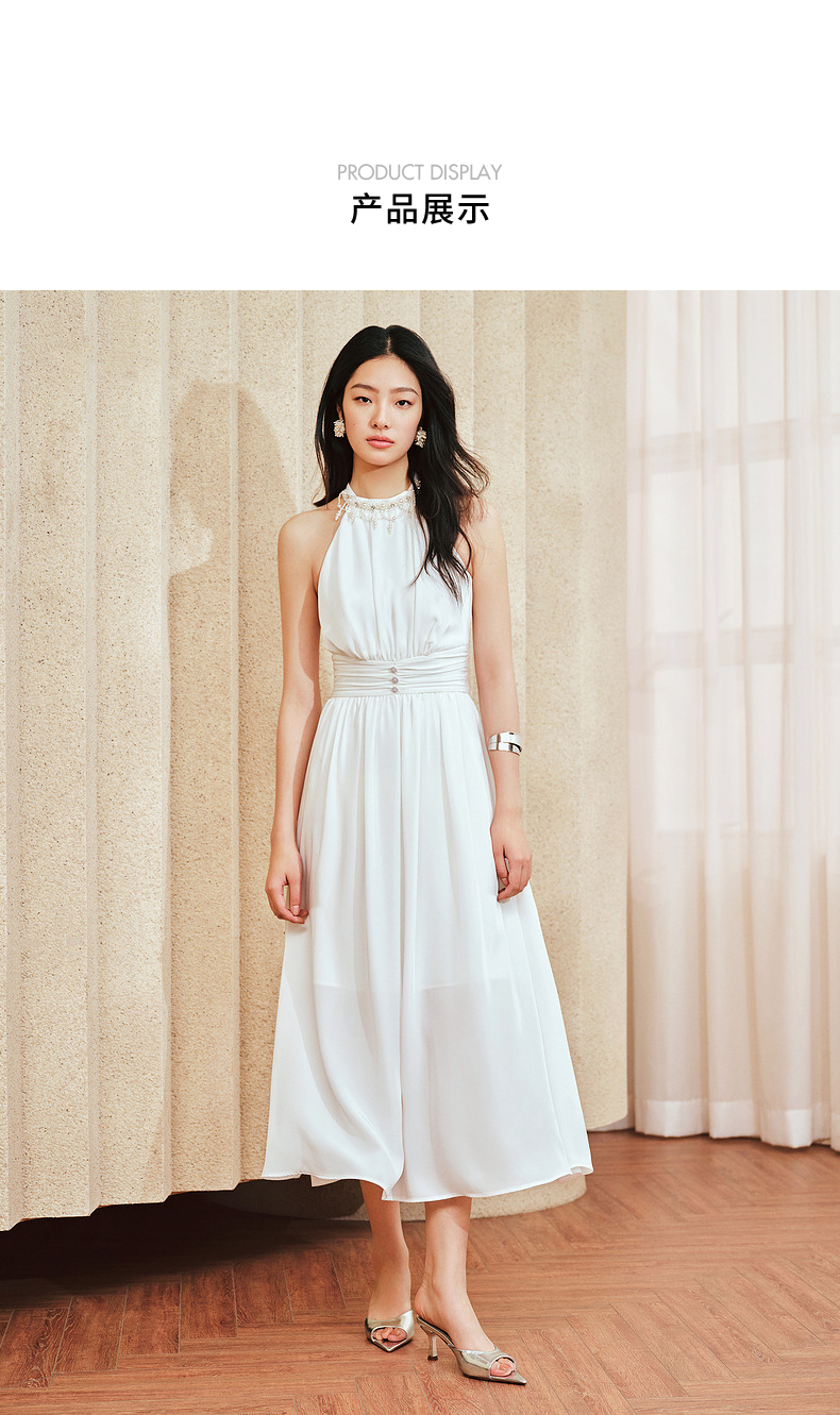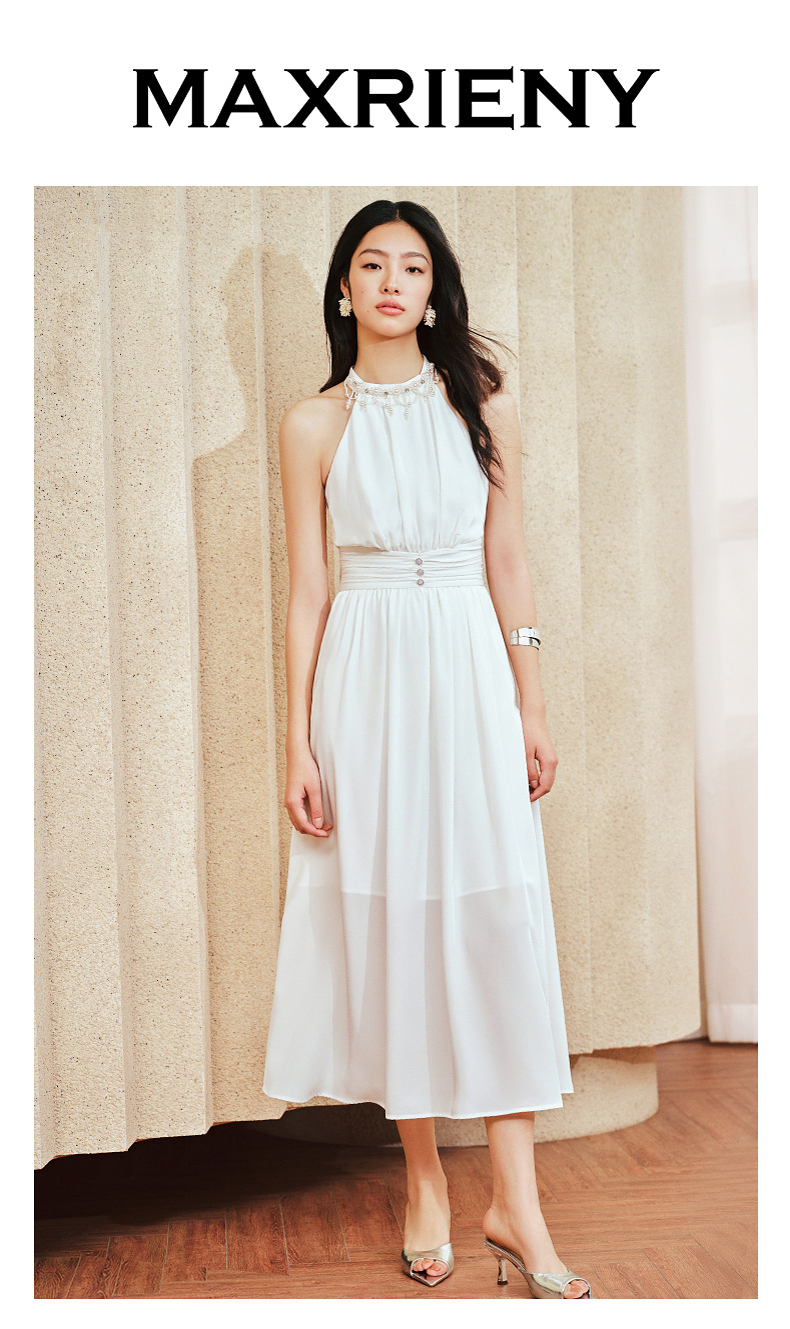 MAXRIENY千金名媛风连衣裙2024夏季新款高腰节收褶无袖挂脖裙子(货号:MS85DR011)