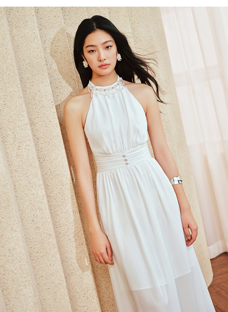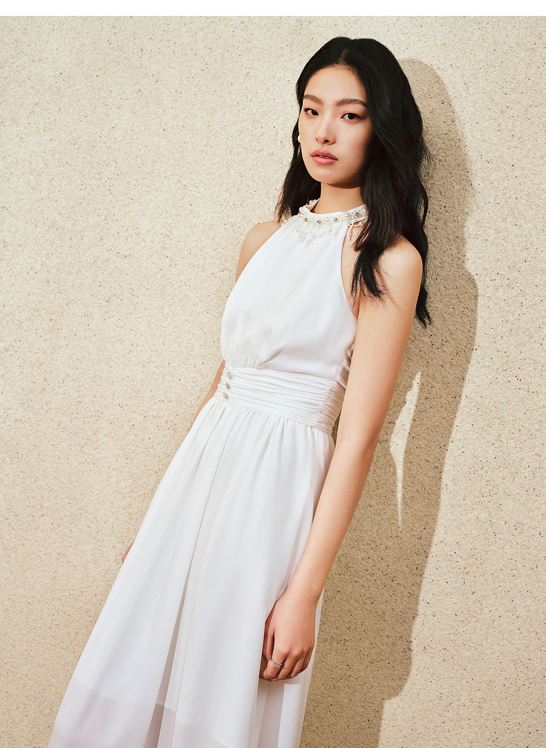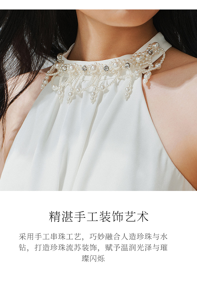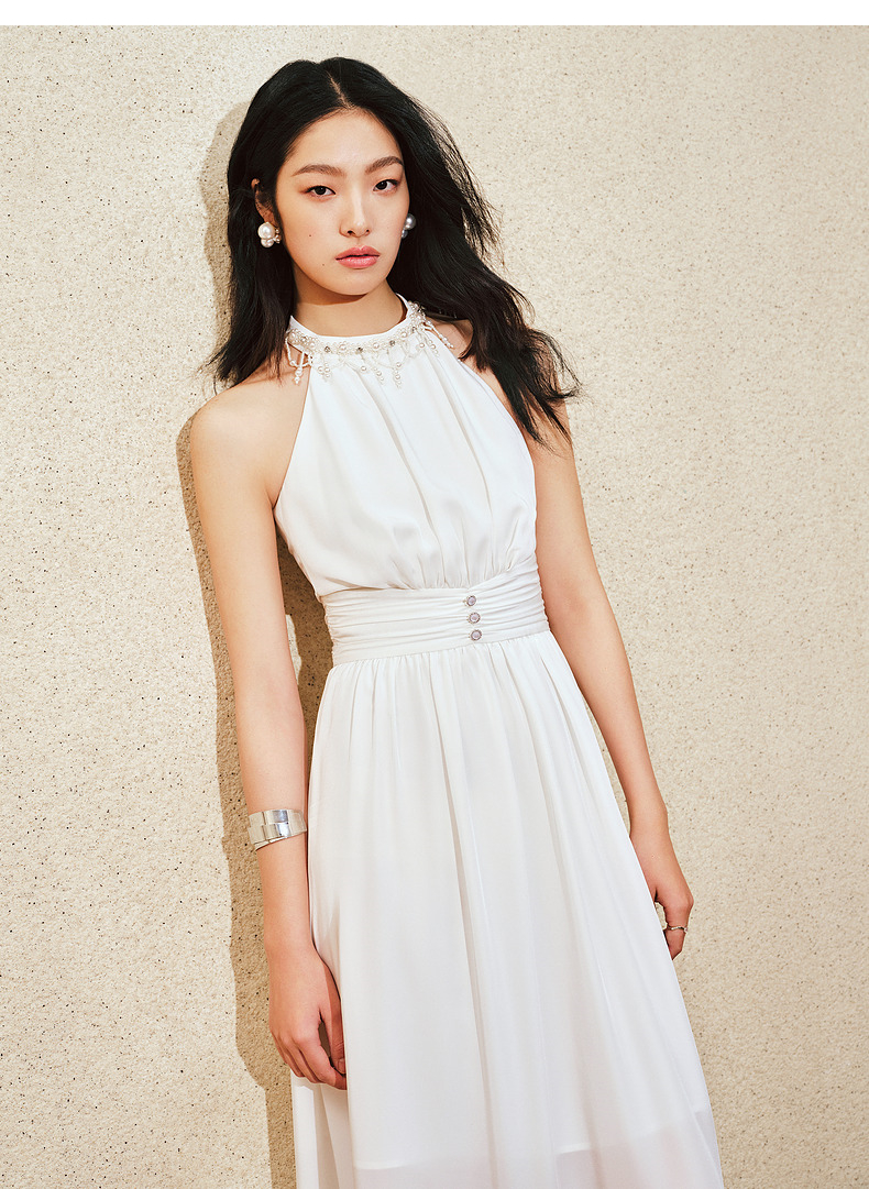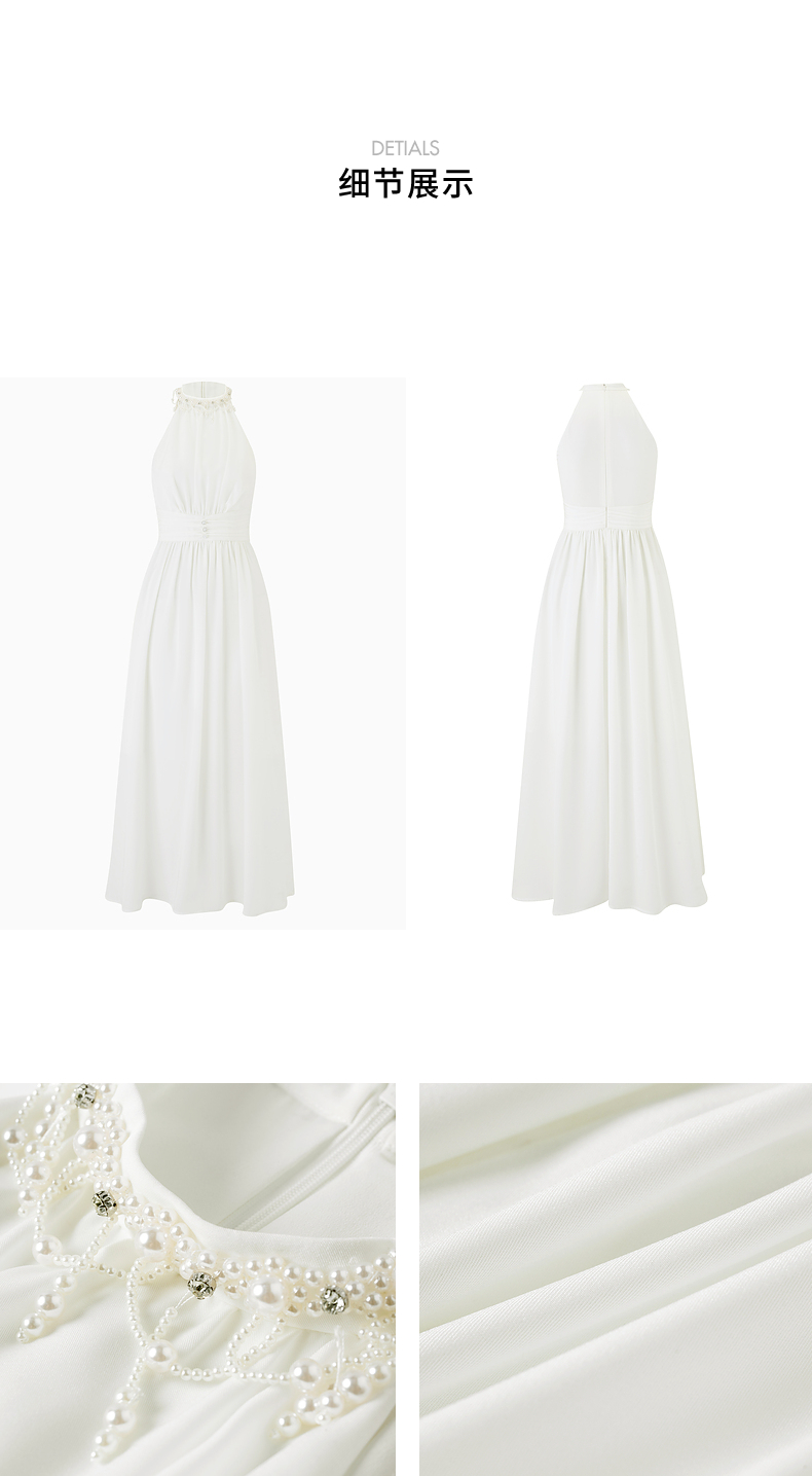 MAXRIENY千金名媛风连衣裙2024夏季新款高腰节收褶无袖挂脖裙子(货号:MS85DR011)
