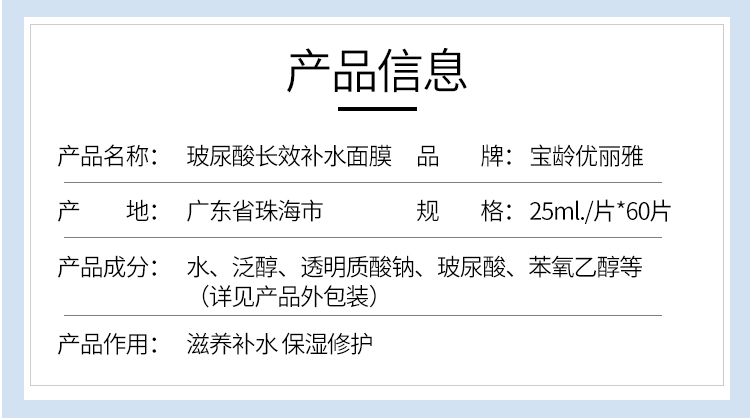 宝龄 优丽雅 | 玻尿酸长效补水面膜 60片/盒 | 立即补水 密集修护 商品图3