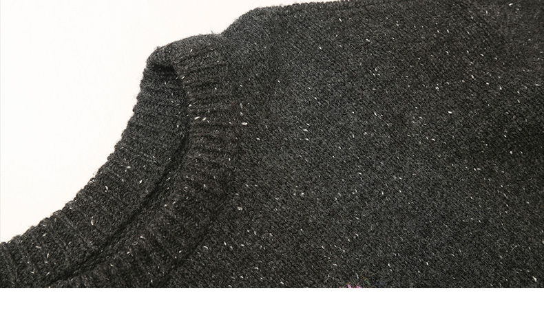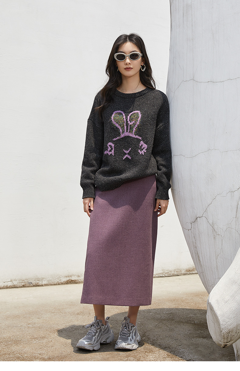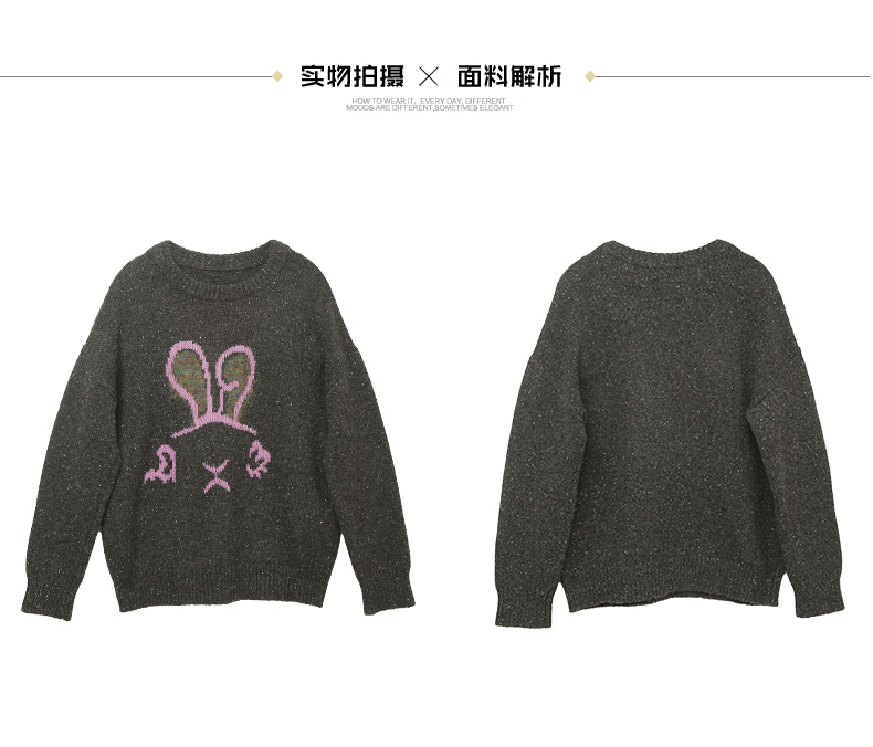 童趣风深灰色彩点针织毛衣 圆领宽松落肩 粉色兔子提花减龄显瘦秋冬上衣