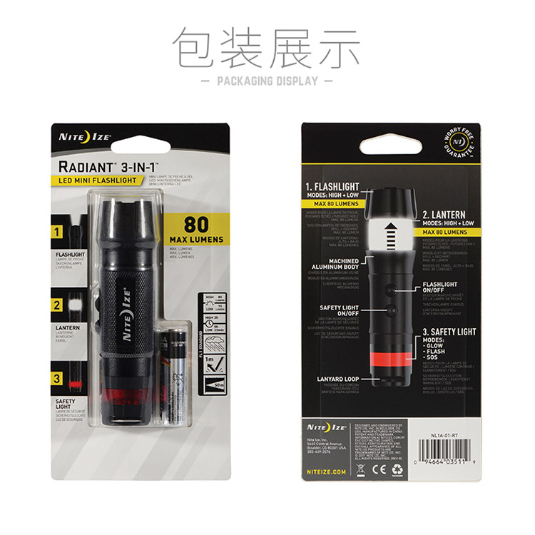 美国奈爱三合一手电户外可折叠便携式迷你营灯信号灯多功能手电筒