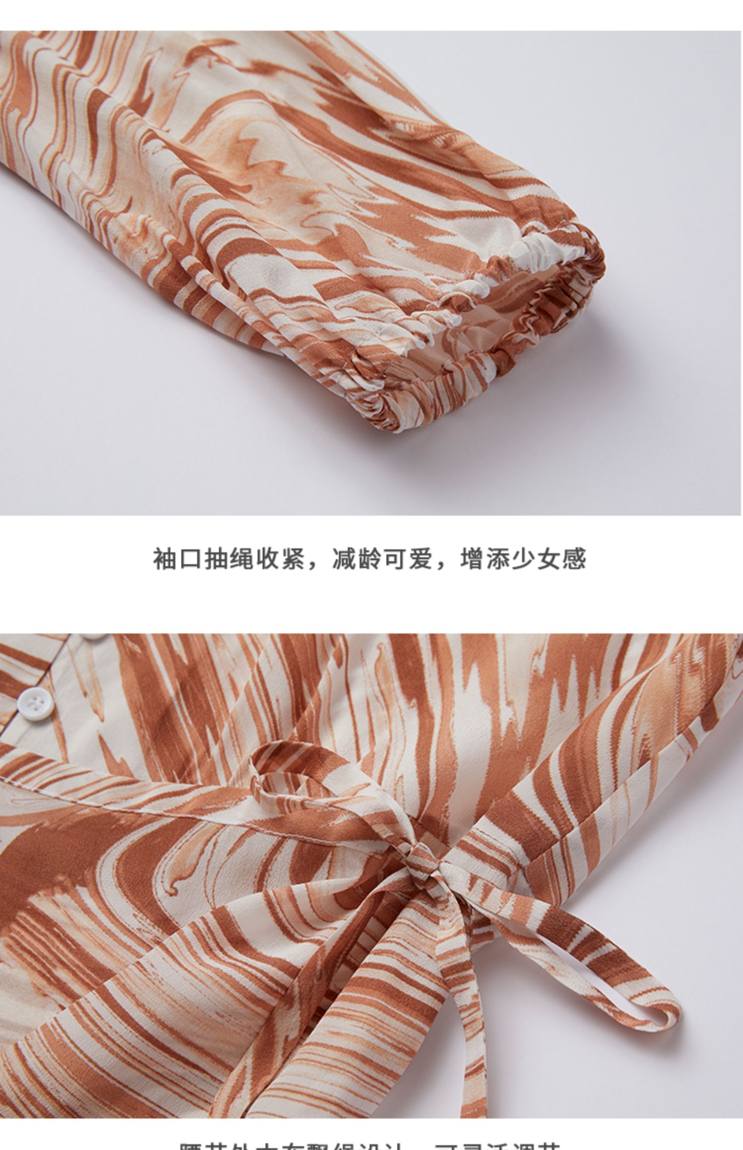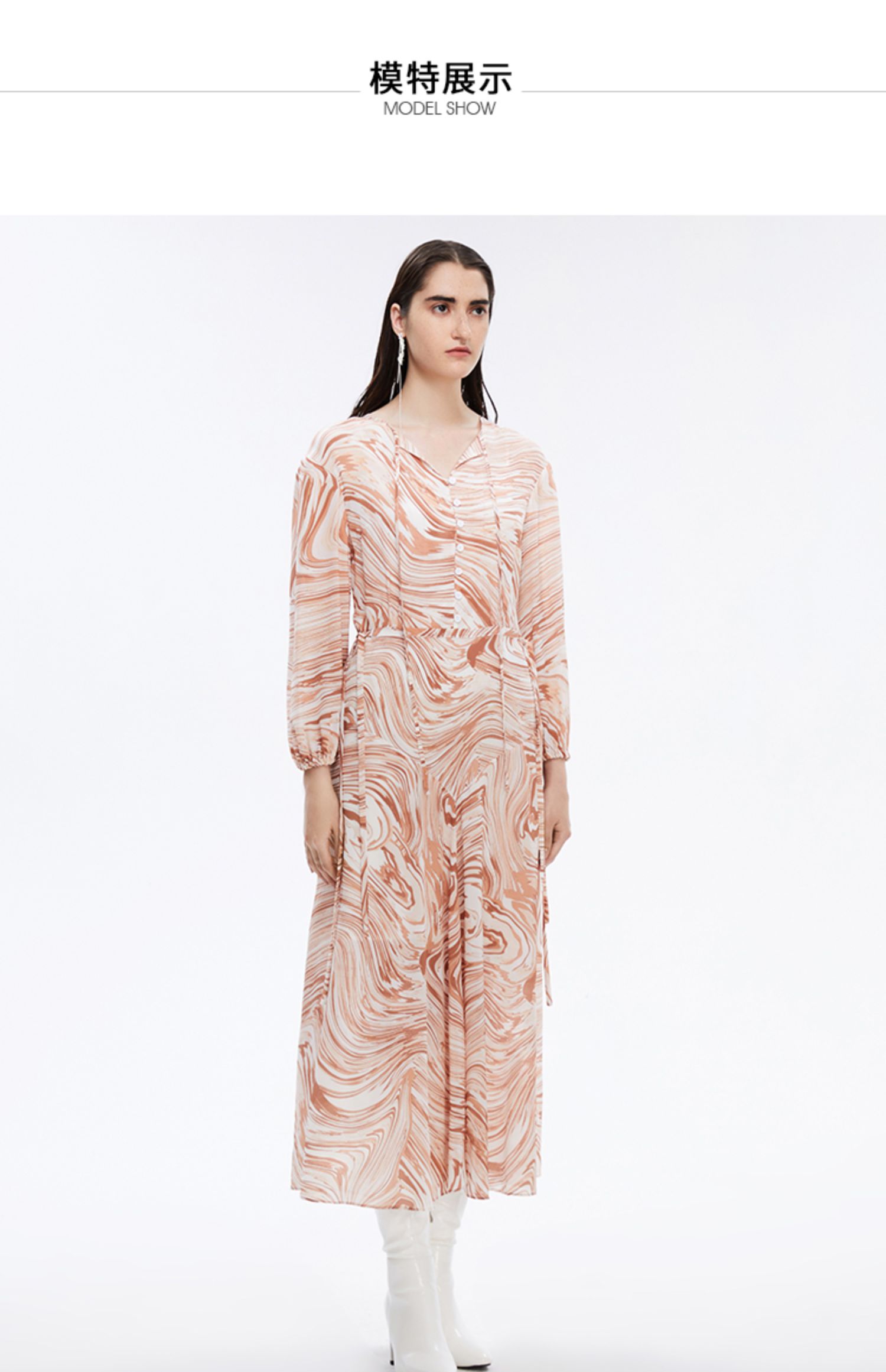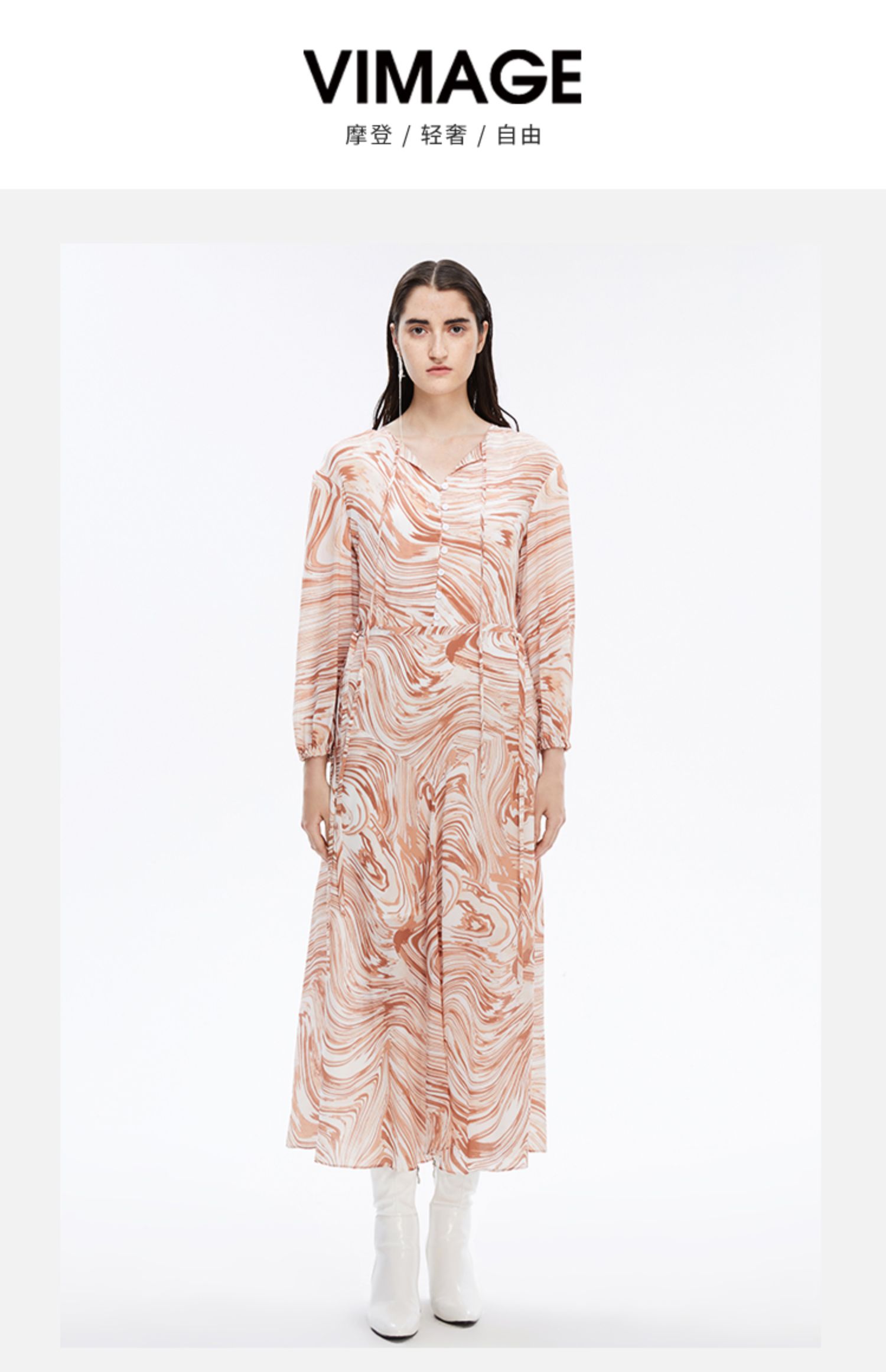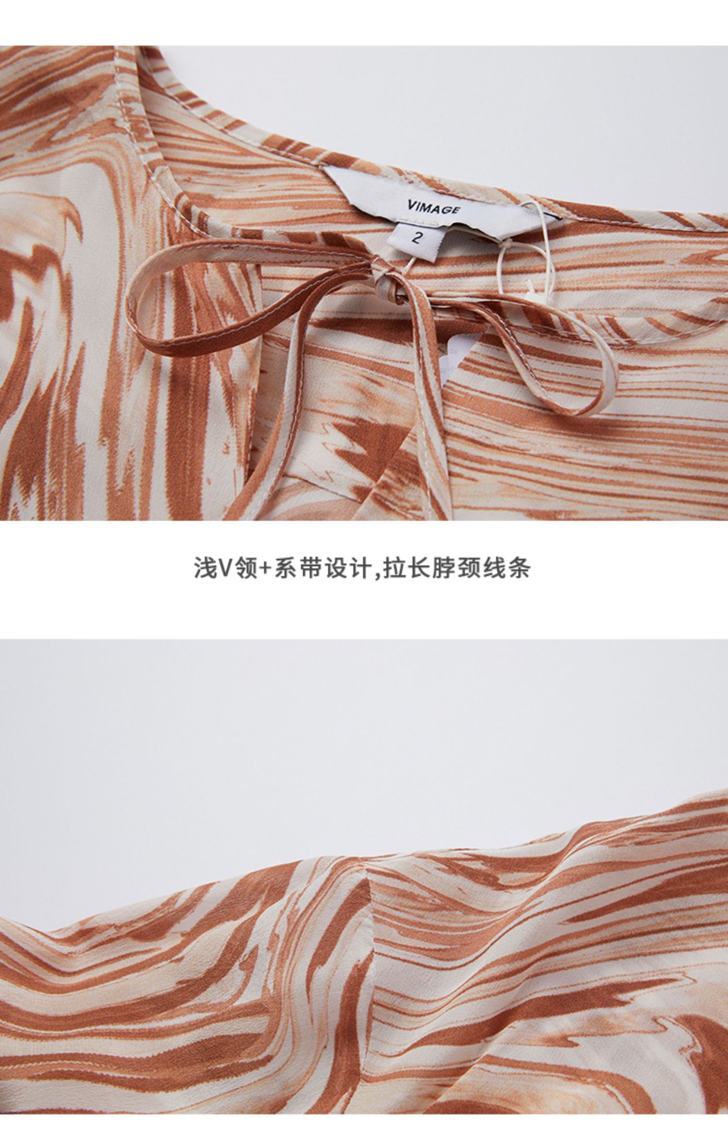 VIMAGE/纬漫纪新款秋季V领系带松紧袖口落肩式印花连衣裙女V1607241