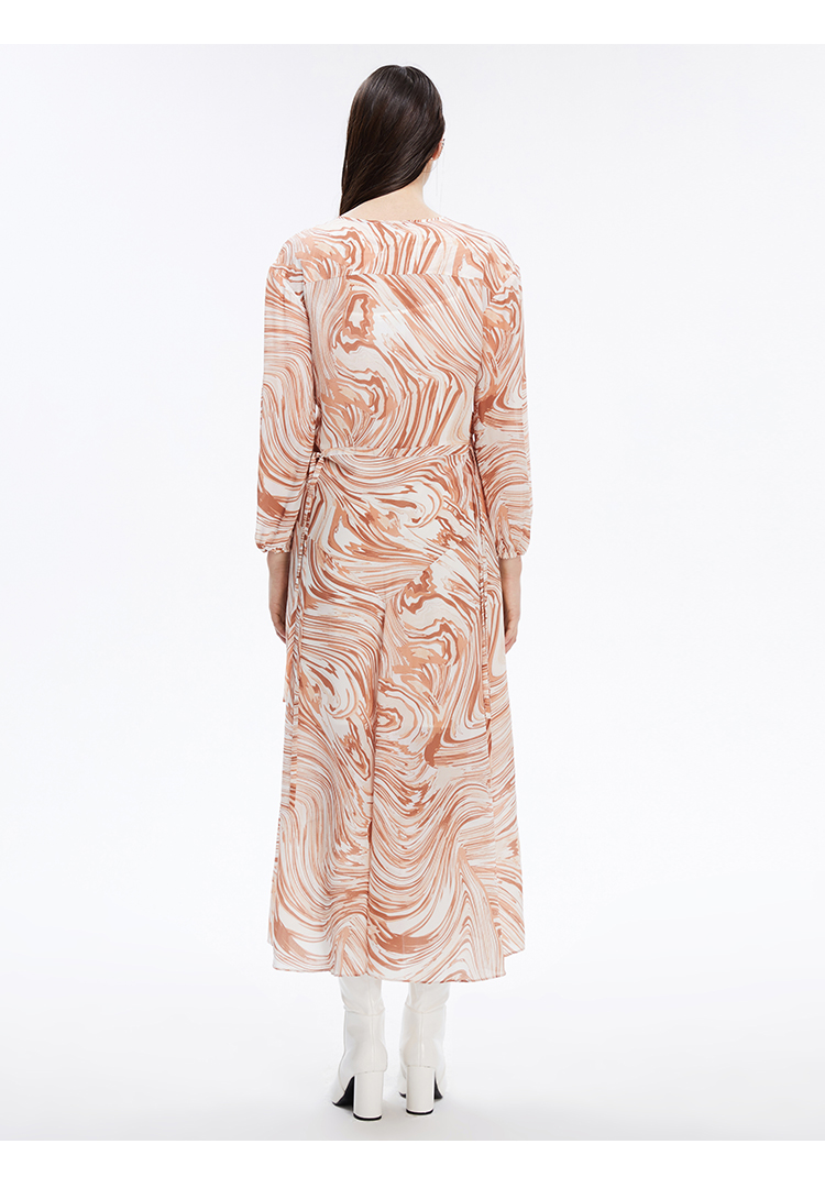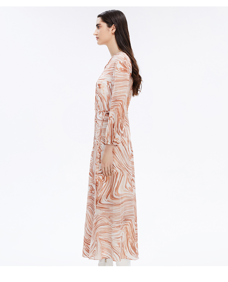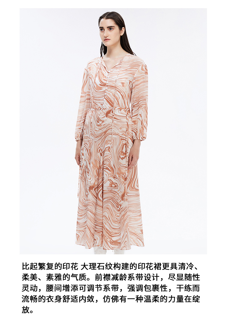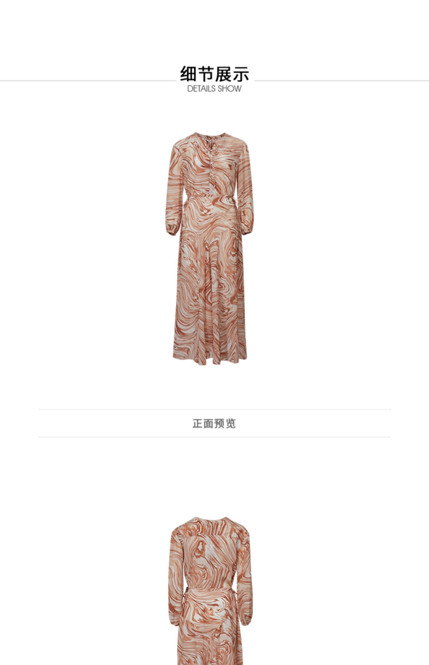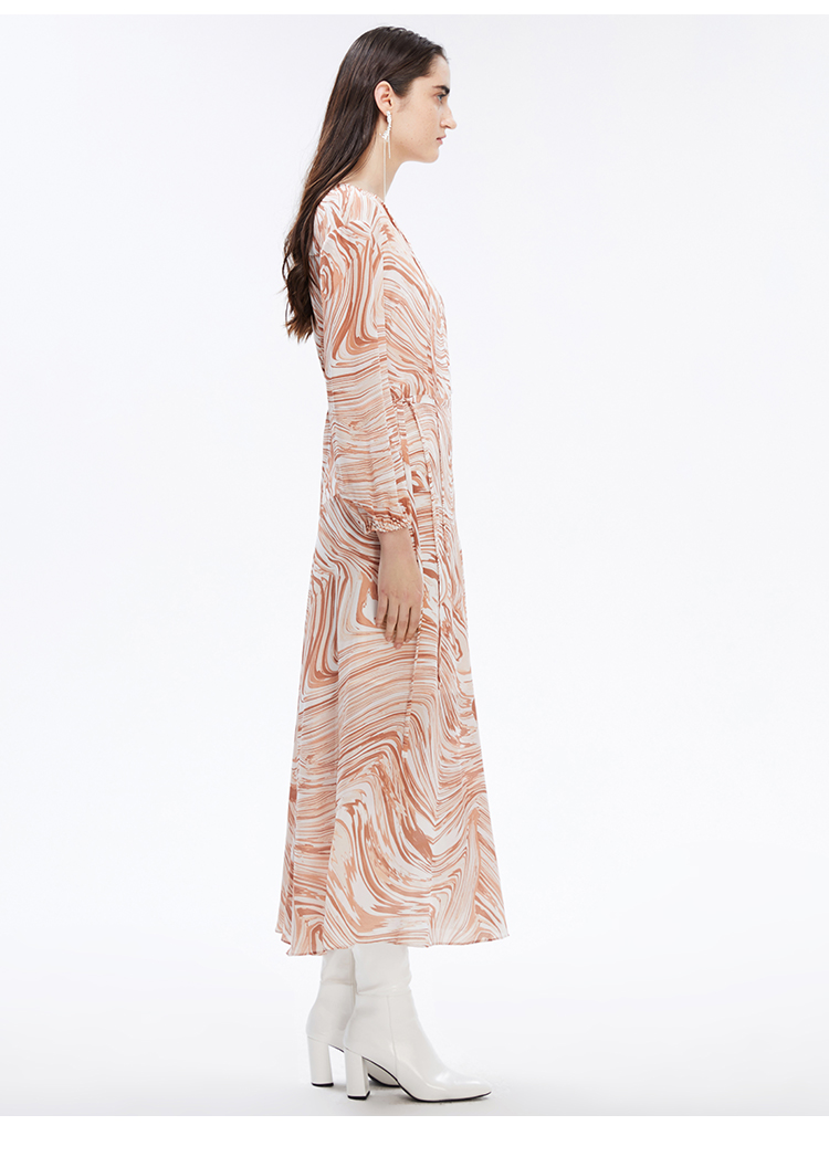 VIMAGE/纬漫纪新款秋季V领系带松紧袖口落肩式印花连衣裙女V1607241