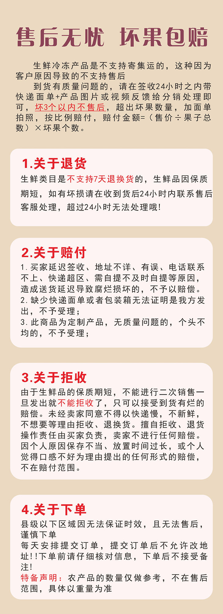 ②因生鲜产品具有特殊性和相关规定,下单时请一定认真确认收件信息,因客户原因导致转寄、延派、误派、口感问题等不在理赔范围,生鲜产品不支持拒收、退货,如遇包装受损等问题需签收反馈售后。