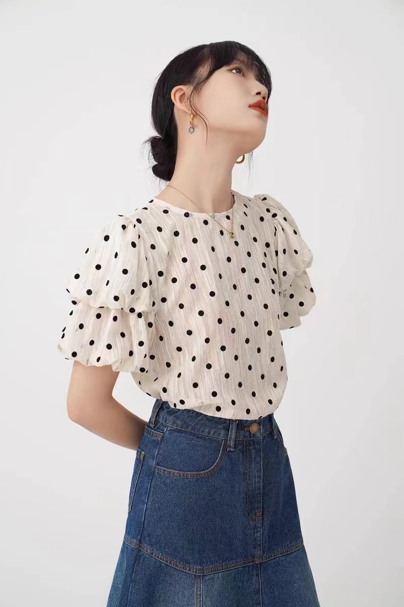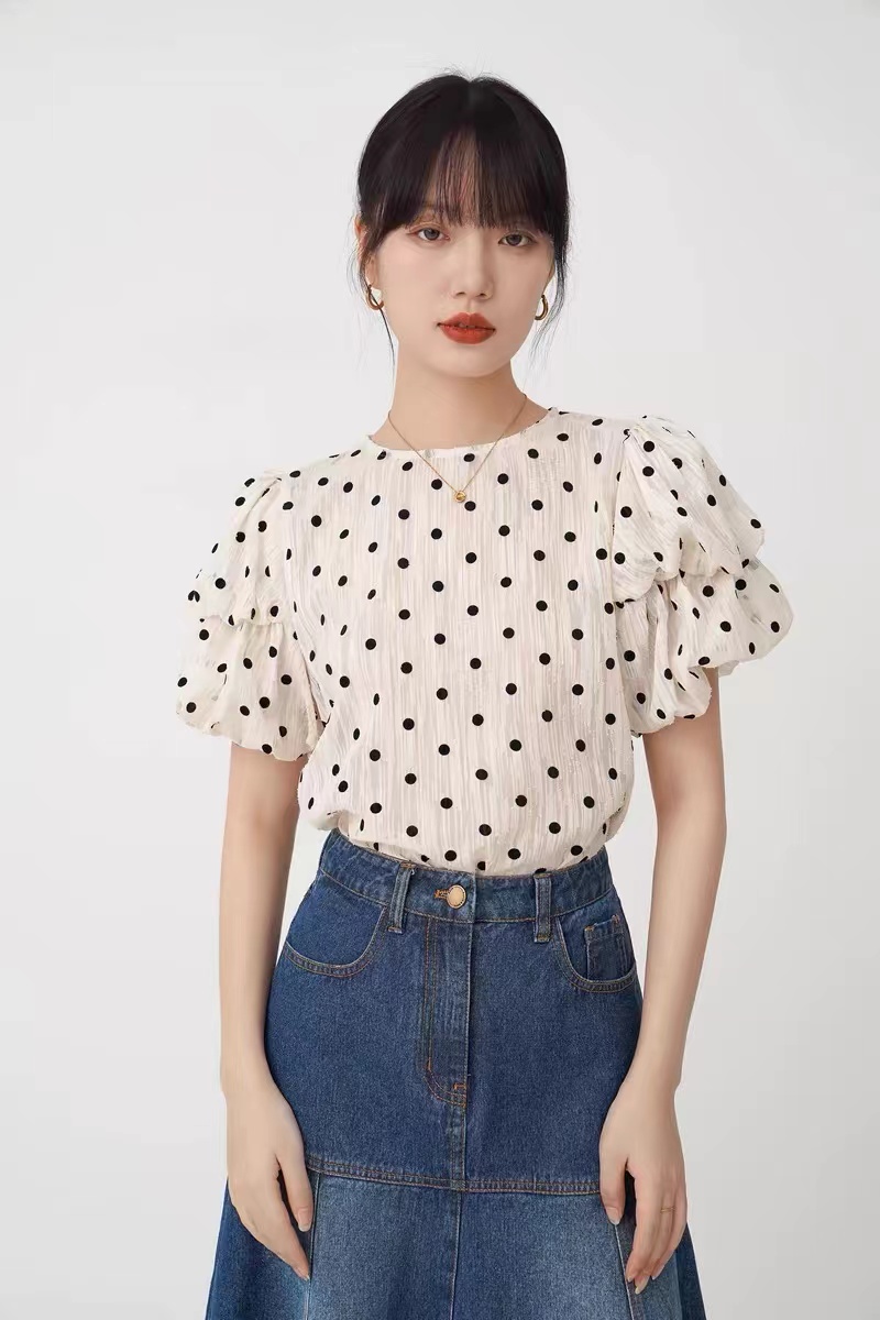 七夕促→ 好看的哦~81813波点泡泡袖小衫上衣-喜出