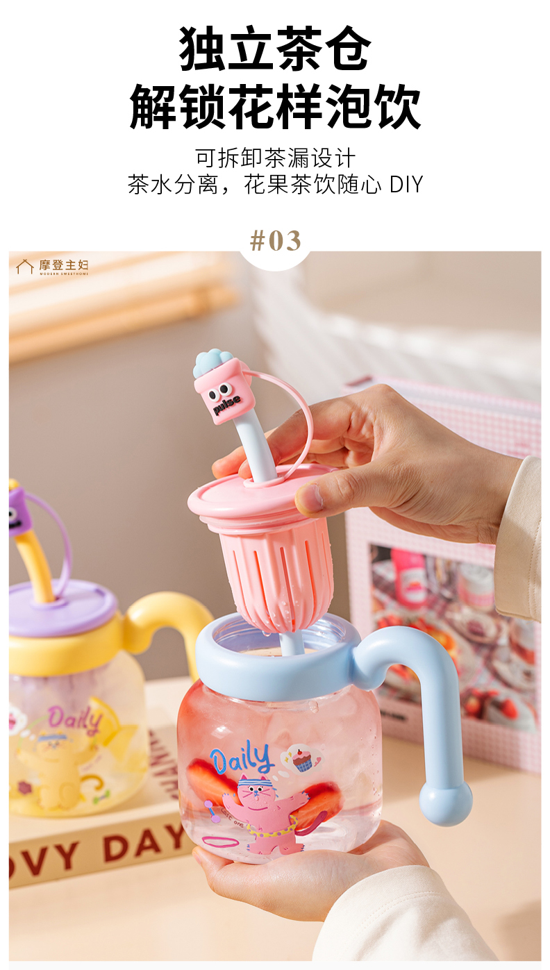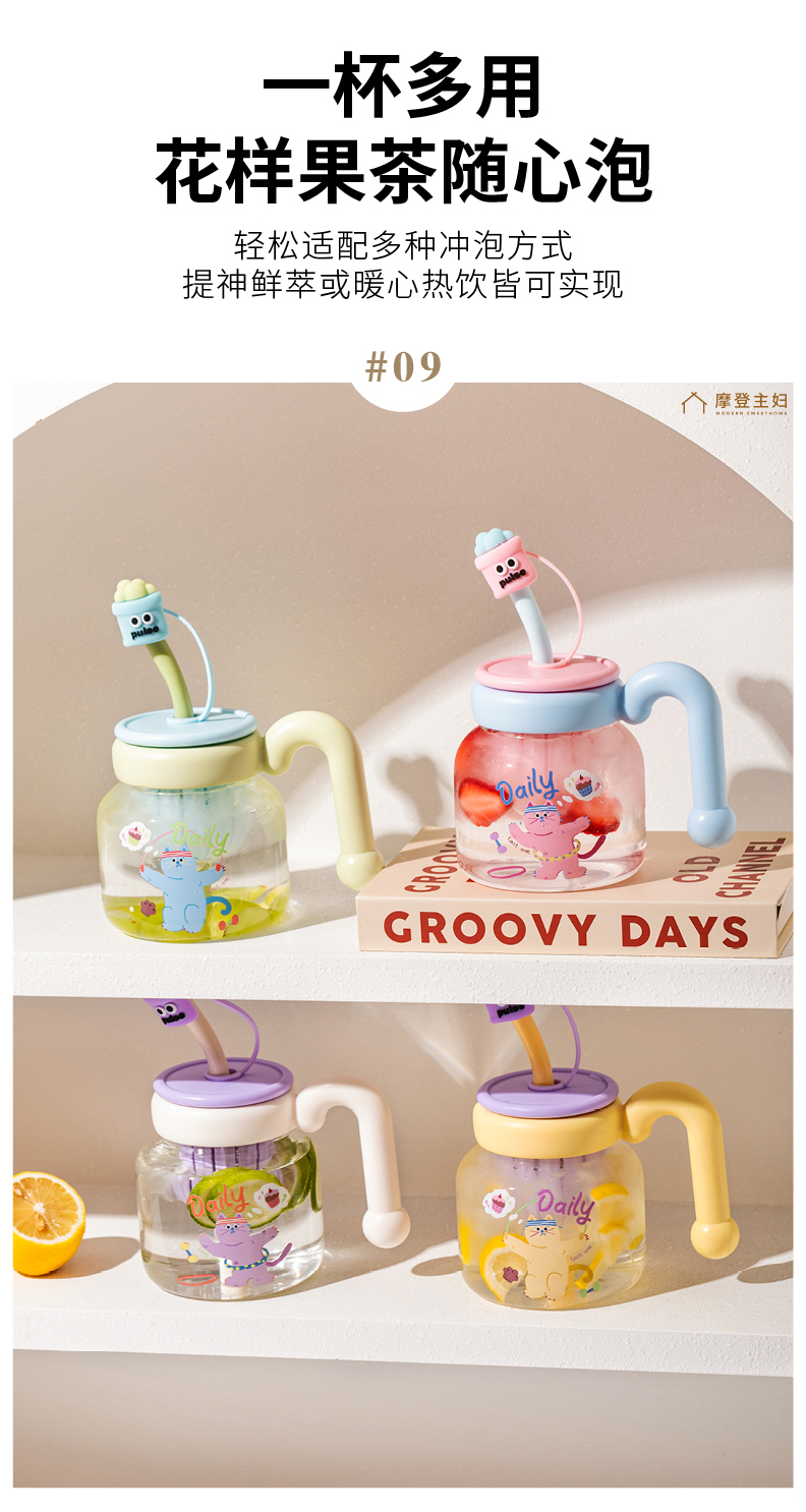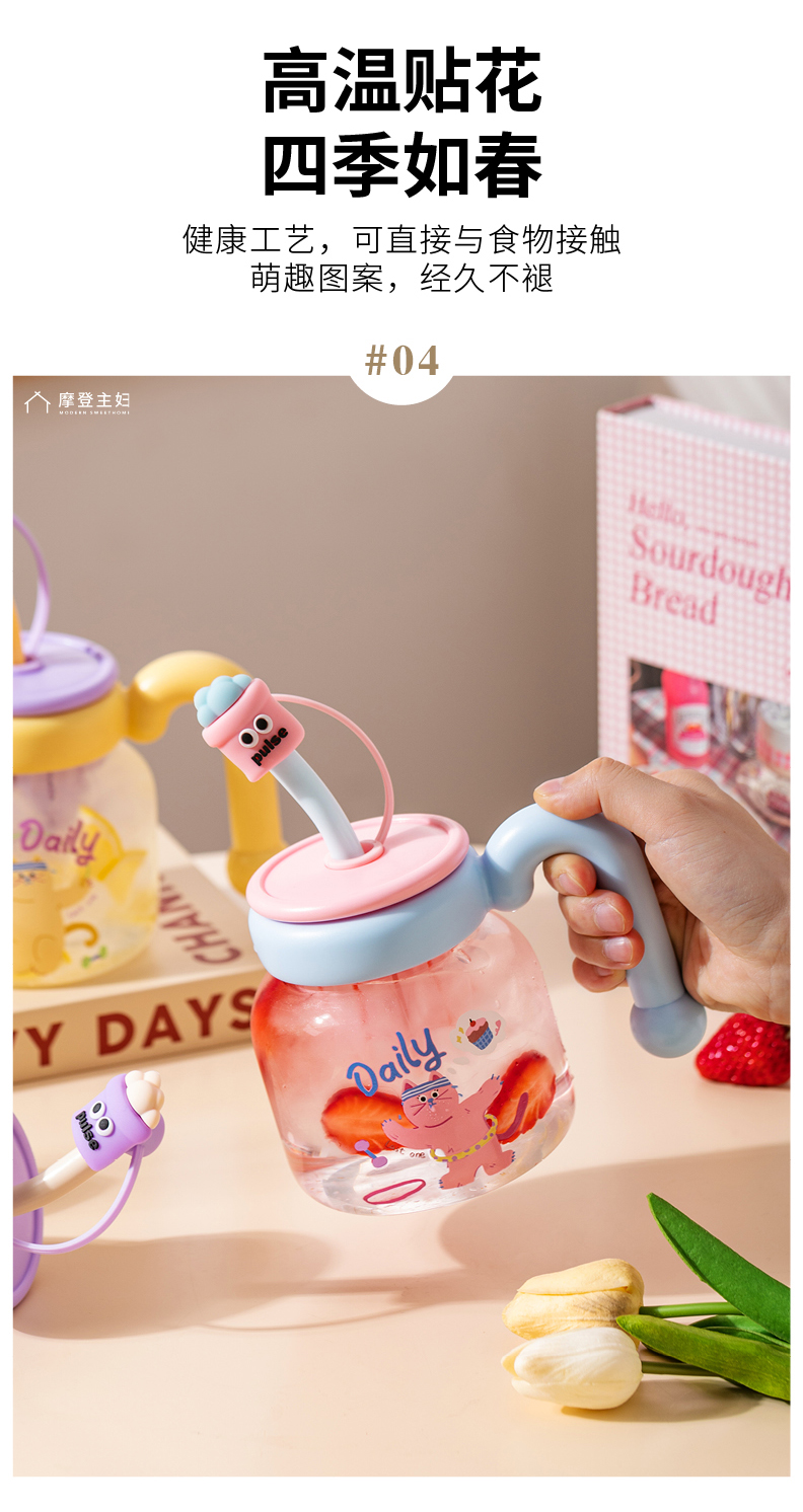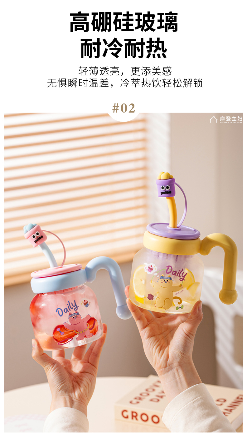 摩登主妇带把手玻璃水杯2025新款吸管杯子茶水分离杯高颜值果汁杯