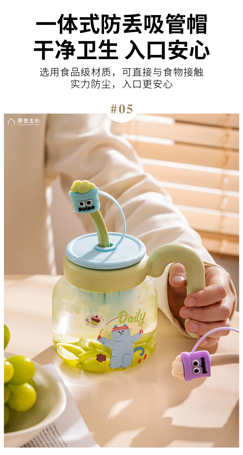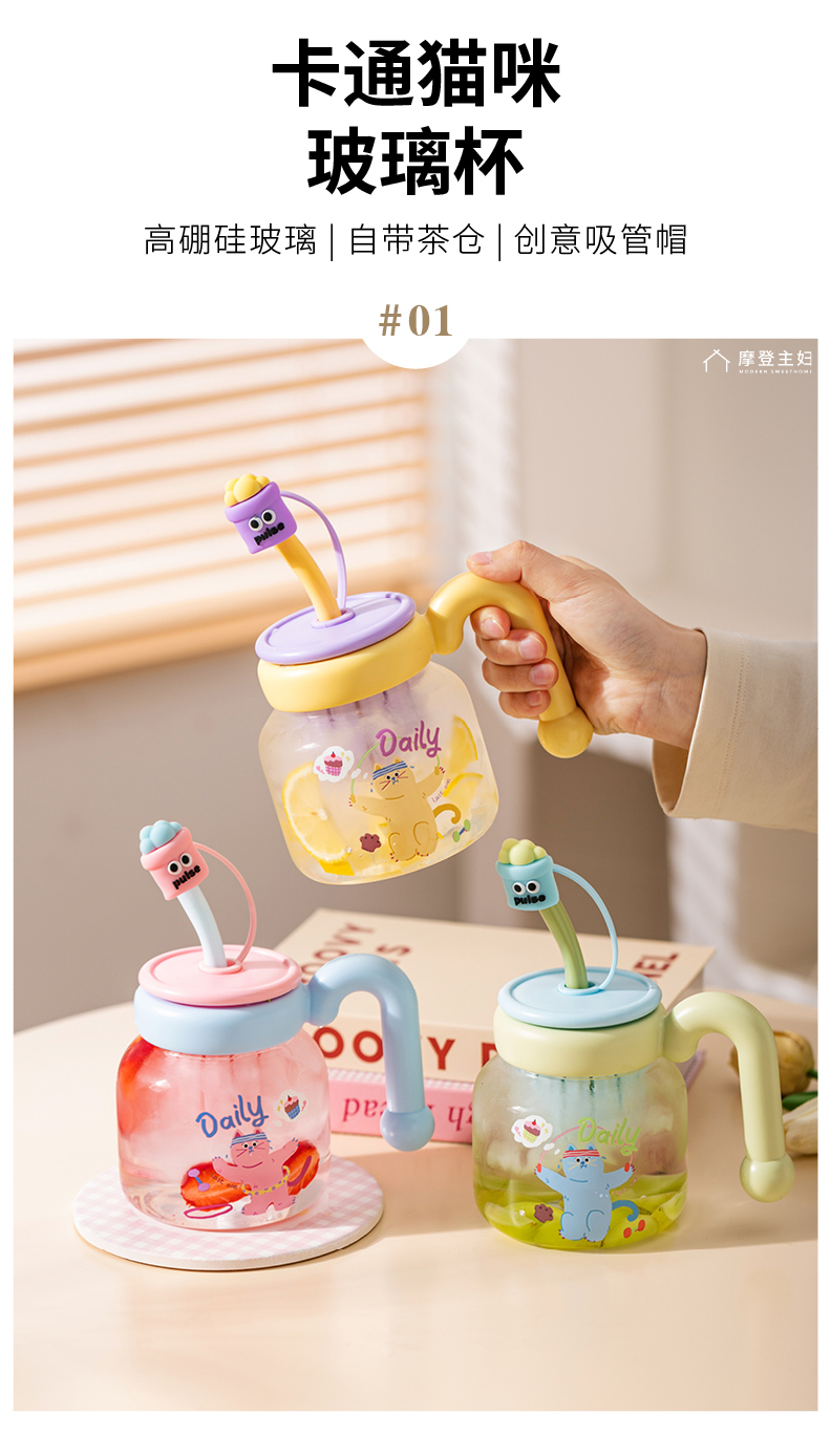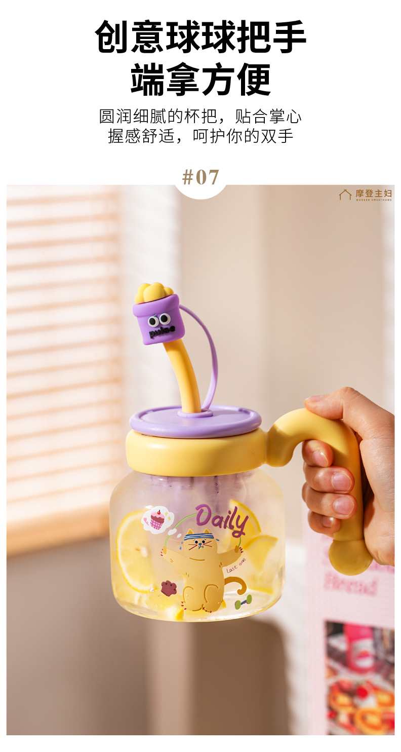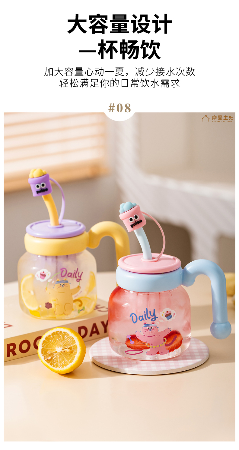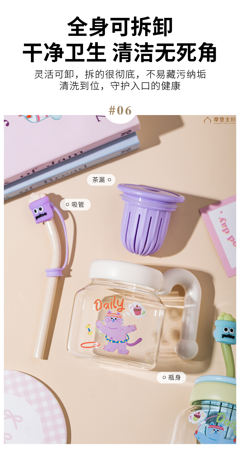 摩登主妇带把手玻璃水杯2025新款吸管杯子茶水分离杯高颜值果汁杯