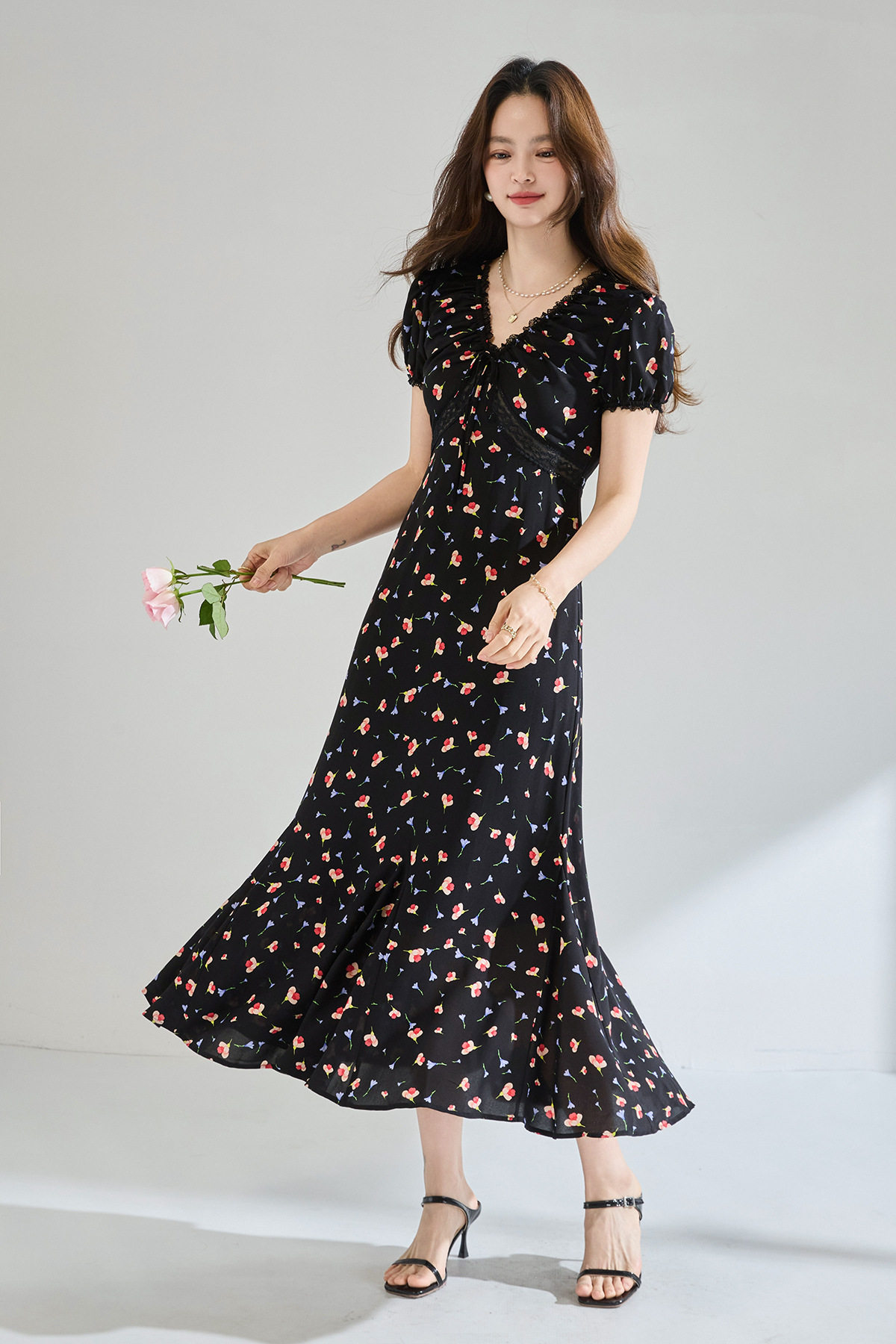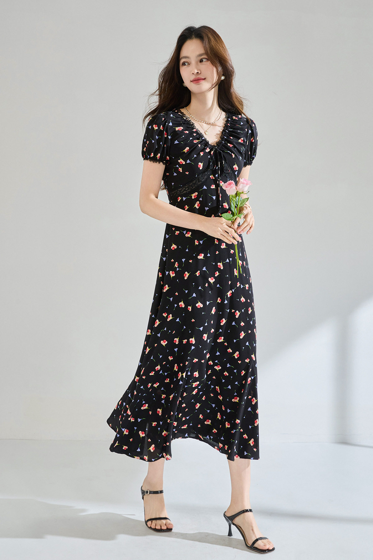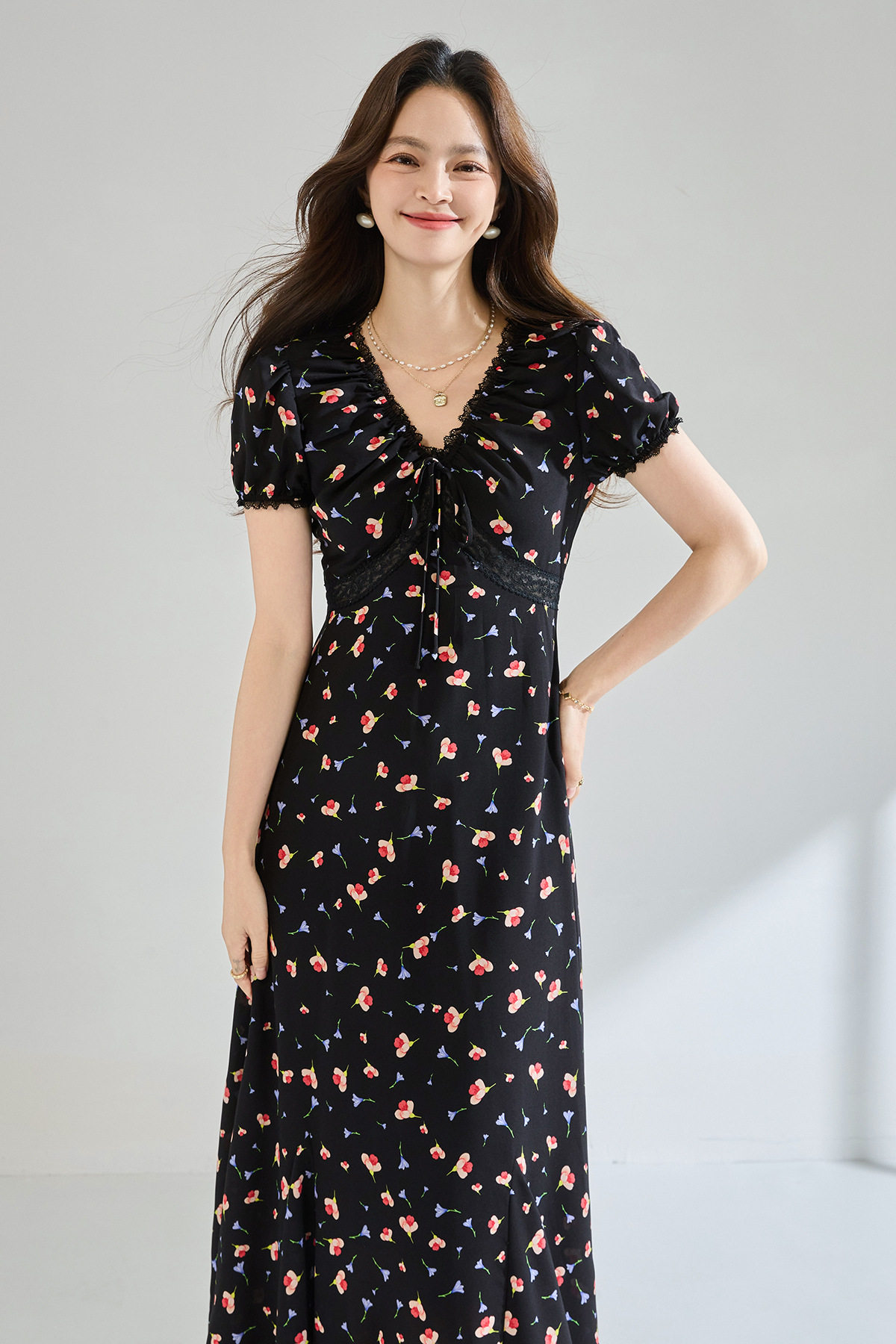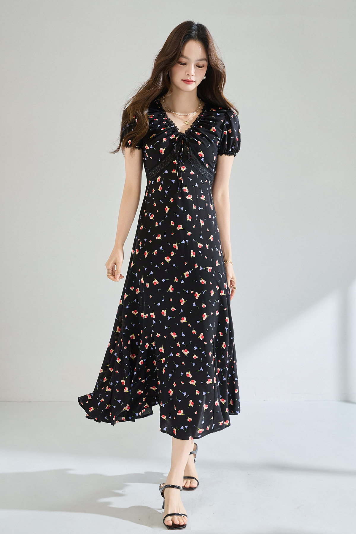 「高货sh」全新升级【铂金会员293/天猫399/差价106】(05234)洛诗琳木耳边蕾丝拼接印花连衣裙2026夏季气质收腰茶歇裙