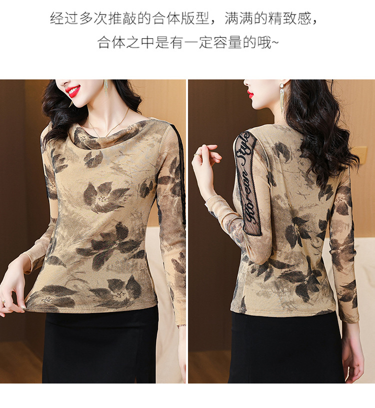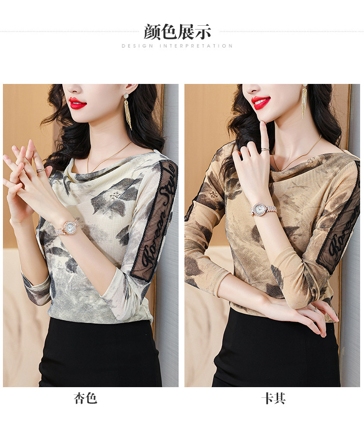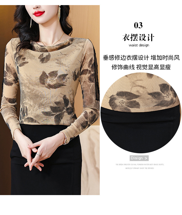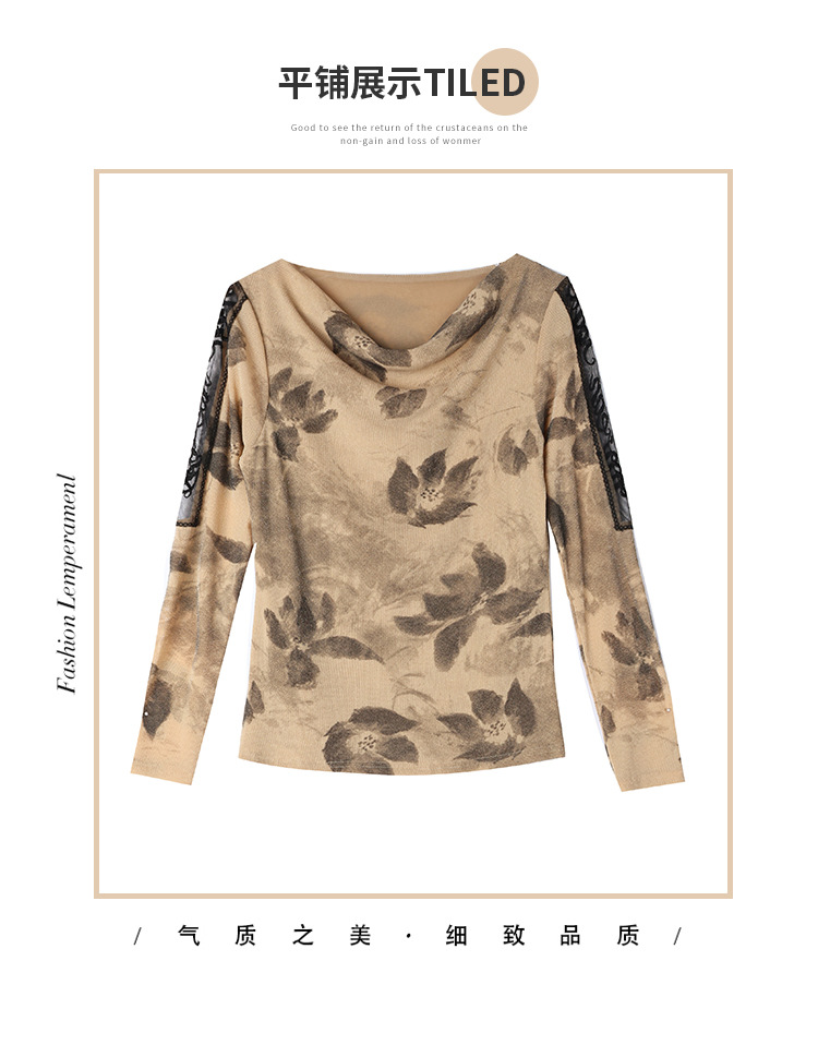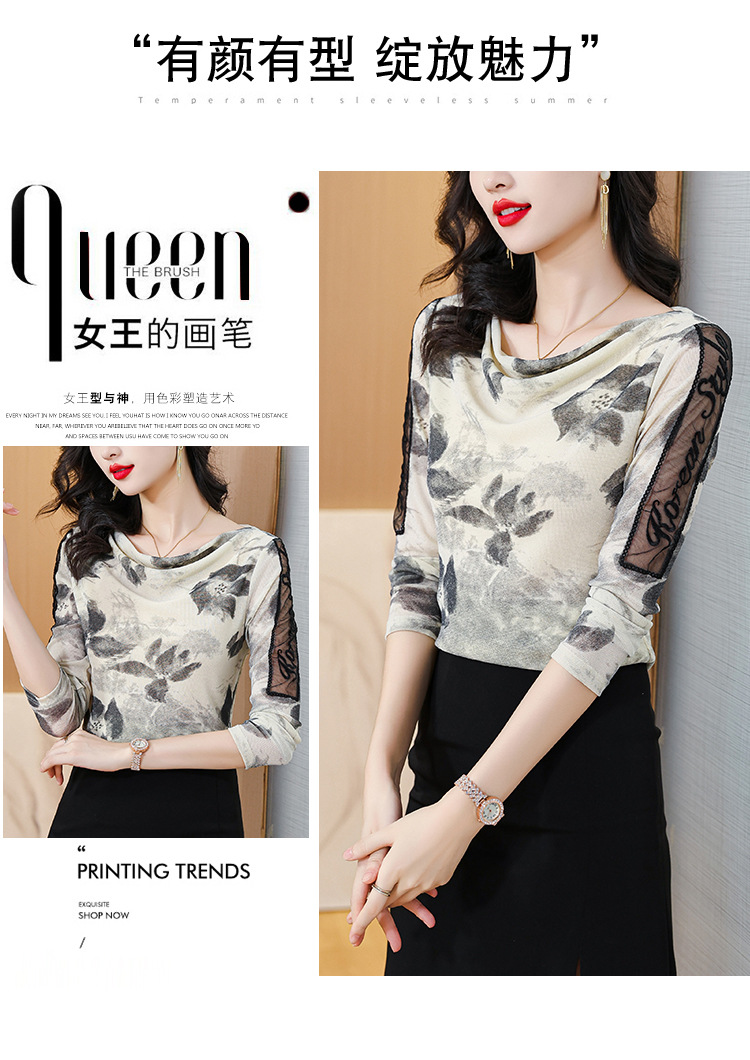 ALBB-堆堆领印花网纱打底衫女2023秋季新款气质百搭长袖T恤水墨画上衣